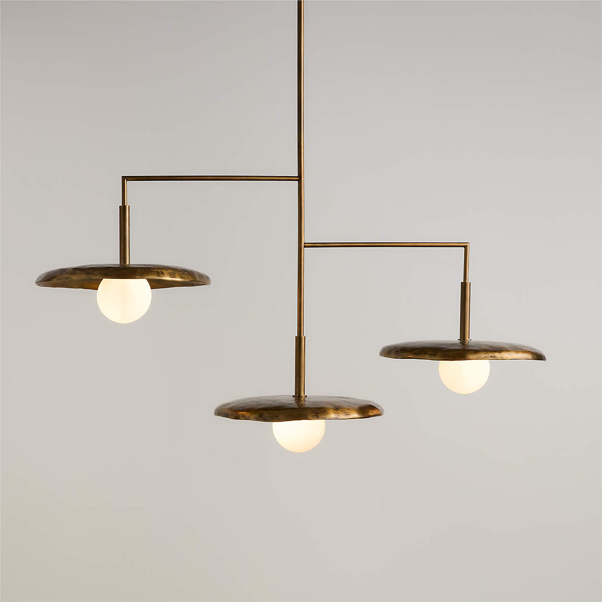 - Each shade is meticulously hand-sculpted from solid brass, featuring a unique, textured surface that mimics the natural veins of a leaf. Resting gently upon these "leaves" are three soft white milk glass globes, evoking the glowing white flowers of the aquatic plant. The result is a captivating play of form and light that is both artistic and soothing.