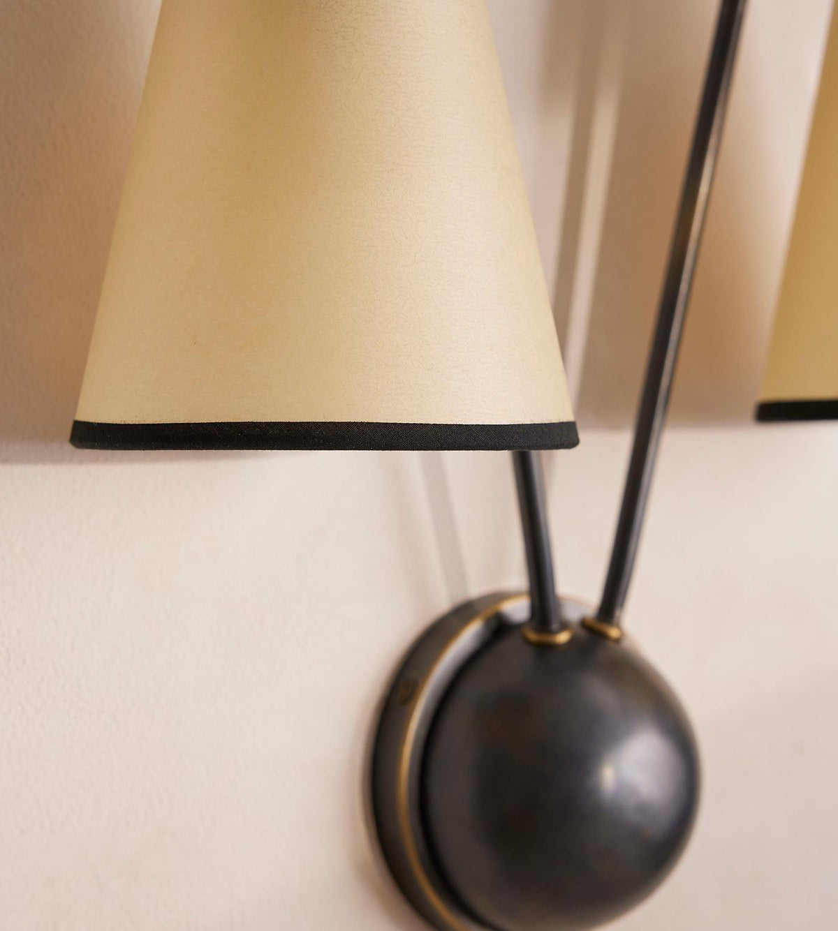 - Introducing the Clarke Wall Sconce, a piece where historic inspiration meets impeccable modern design. Expertly crafted in-house from blackan brass and Antiqued Brass finished with coned parchment shades, this dual-light sconce casts a warm, inviting glow perfect for creating an ambiance of sophisticated comfort. Its timeless silhouette is a direct tribute to the grandeur of 19th-century Parisian architecture, specifically the iconic Soho House Paris, making it a statement piece for the discerning homeowner.