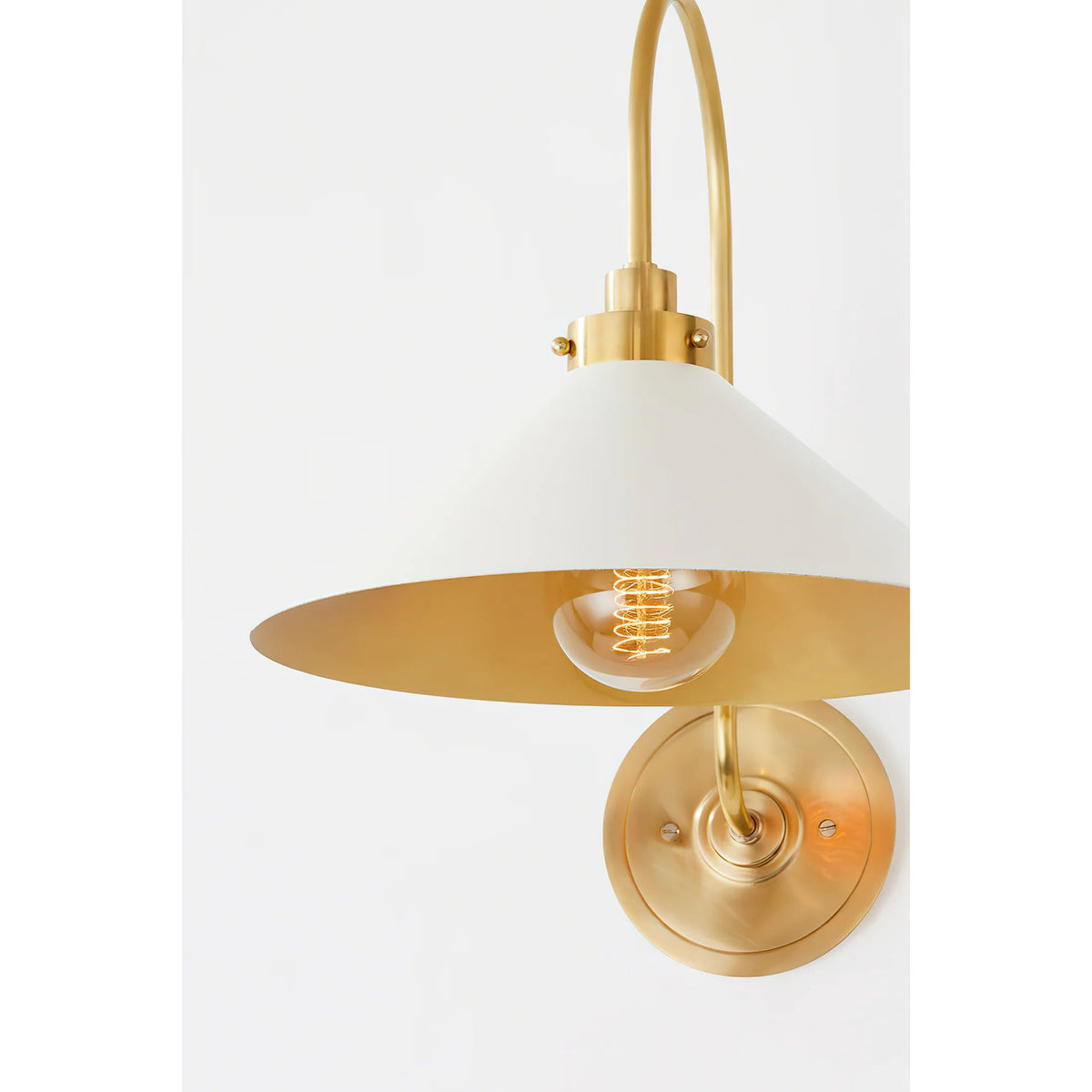 - Clivedon Wall Sconce featurs a refined metal shade design, this fixture brings fresh finish combinations and sleek, heritage-inspired details to any room. The contrasting Aged Brass accents and modern gooseneck arm create a perfect balance of vintage allure and updated style, making it ideal for both traditional and transitional interiors.