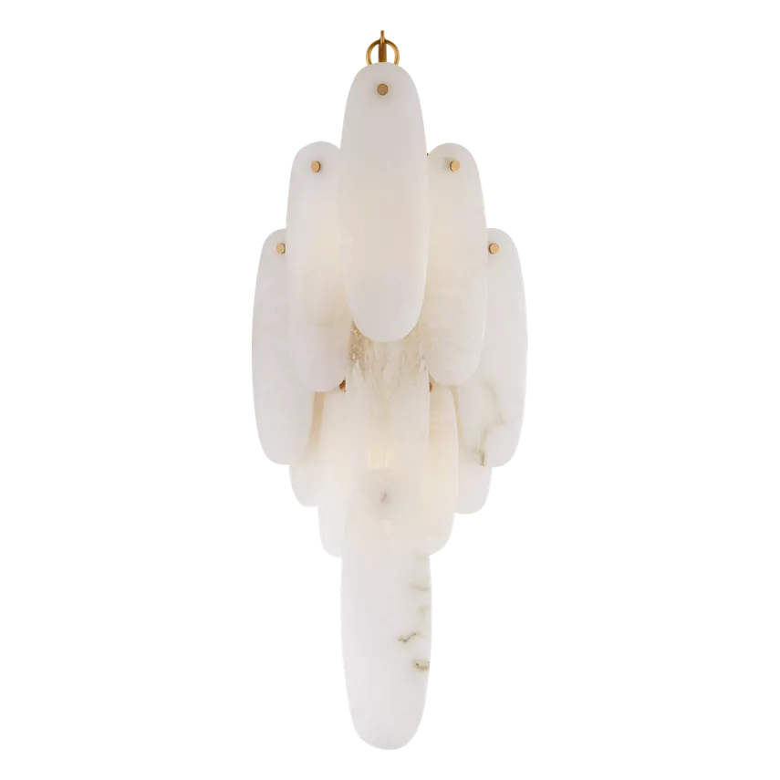 - Each Cora Waterfall Sconce Large features delicately suspended, hand-selected alabaster ovals, strung together in an elegant, cascading formation. The natural stone is celebrated for its unique veining and subtle color variations, ensuring your fixture is one-of-a-kind. Cradling these beautiful stones are sleek, warm brass frames that add a touch of modern jewelry-like sophistication.