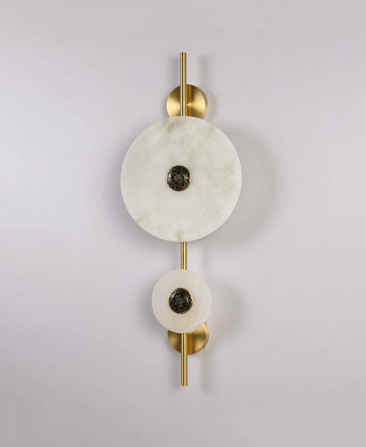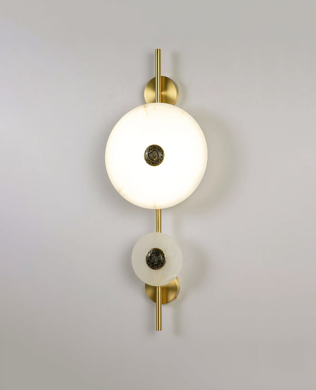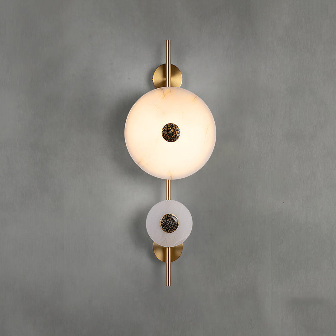 Experience the celestial beauty of the Cyril Alabaster Wall Sconce. Its luminous alabaster discs, reminiscent of a lunar eclipse, cast a warm, inviting glow. The contrast of the organic stone and sleek brass accents creates a timeless, luxurious look that complements any interior.