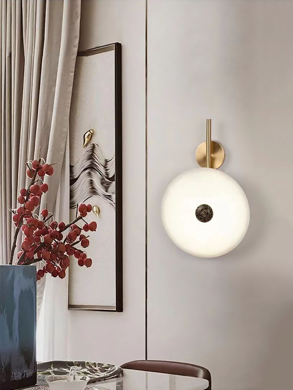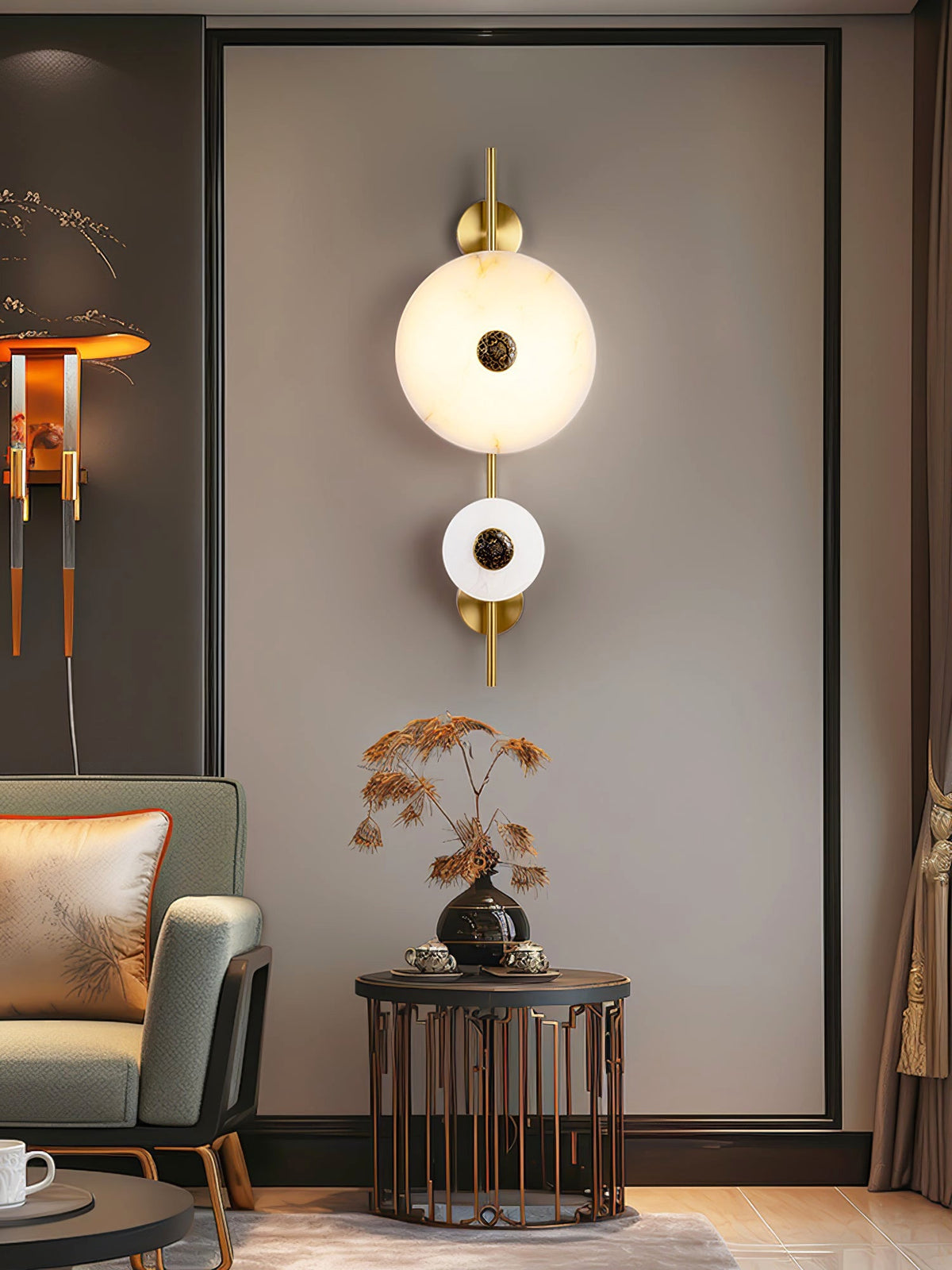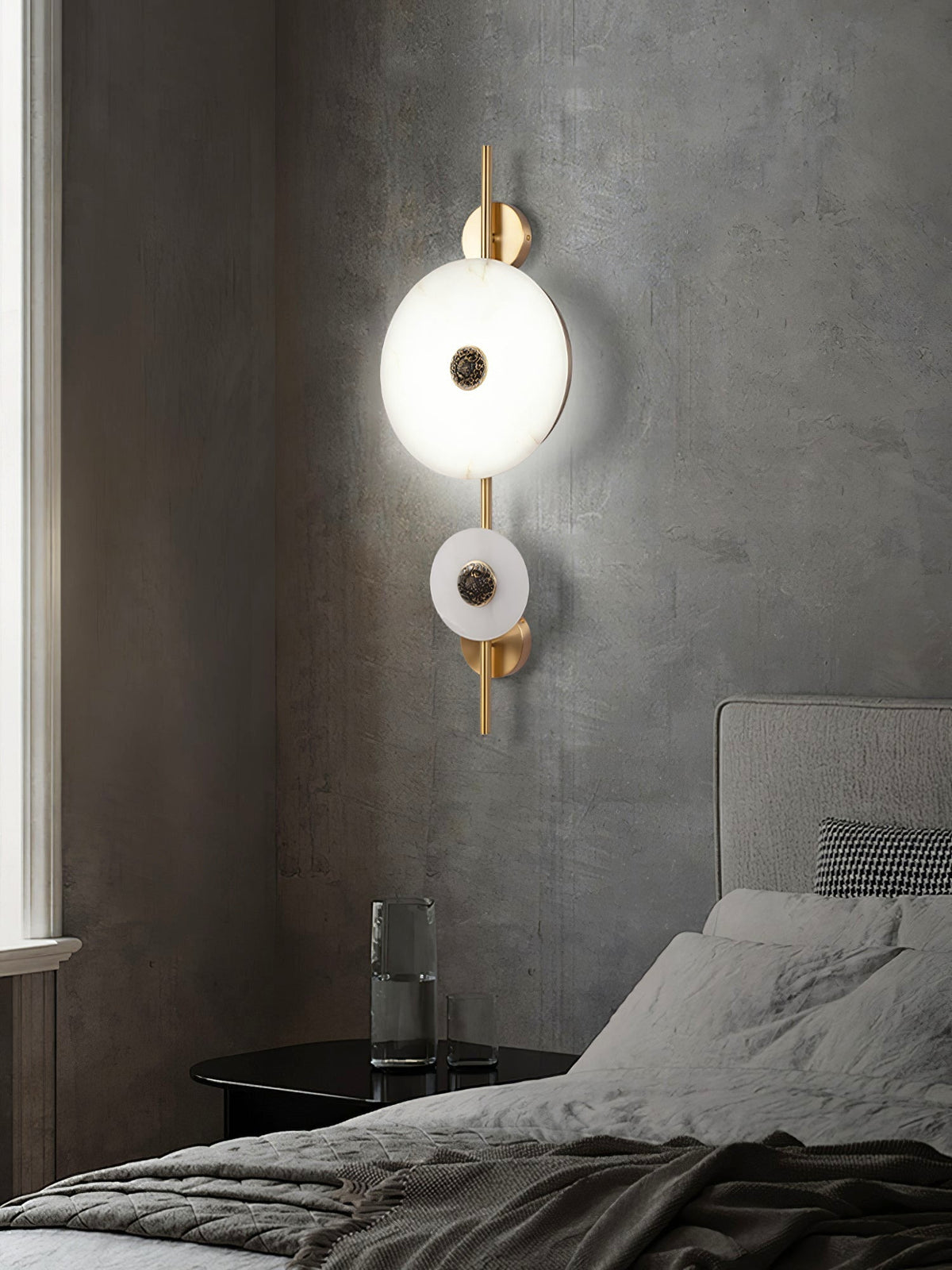 Experience the celestial beauty of the Cyril Alabaster Wall Sconce. Its luminous alabaster discs, reminiscent of a lunar eclipse, cast a warm, inviting glow. The contrast of the organic stone and sleek brass accents creates a timeless, luxurious look that complements any interior.