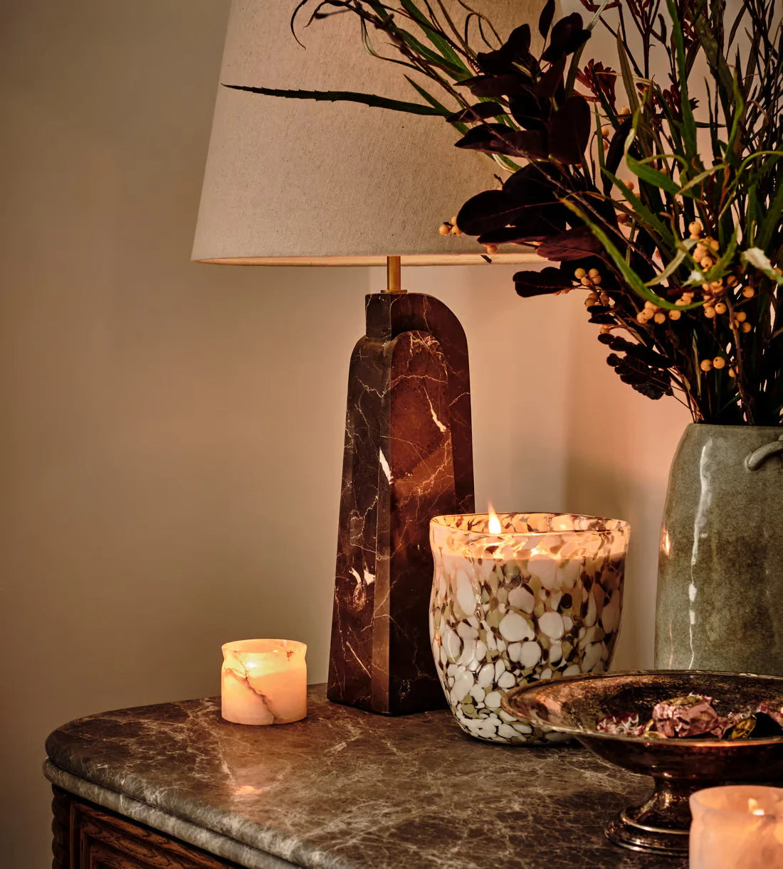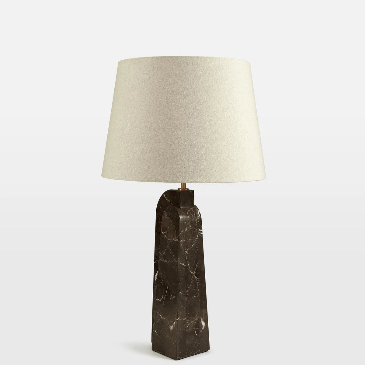 - Handcrafted from three richly veined brown marble panels, the Darcy Table Lamp is a sculptural masterpiece, where no two pieces are alike. Each lamp showcases the marble's natural variations, ensuring a one-of-a-kind base that exudes earthy sophistication.