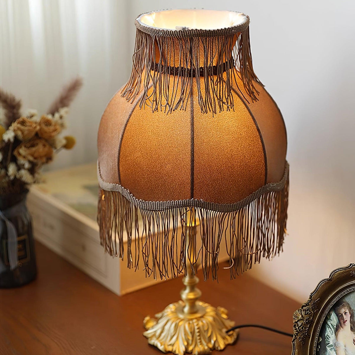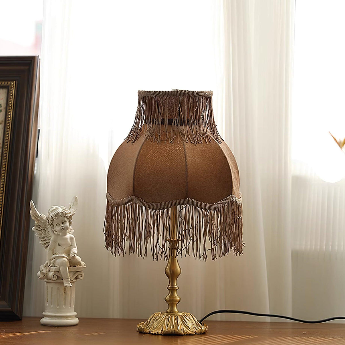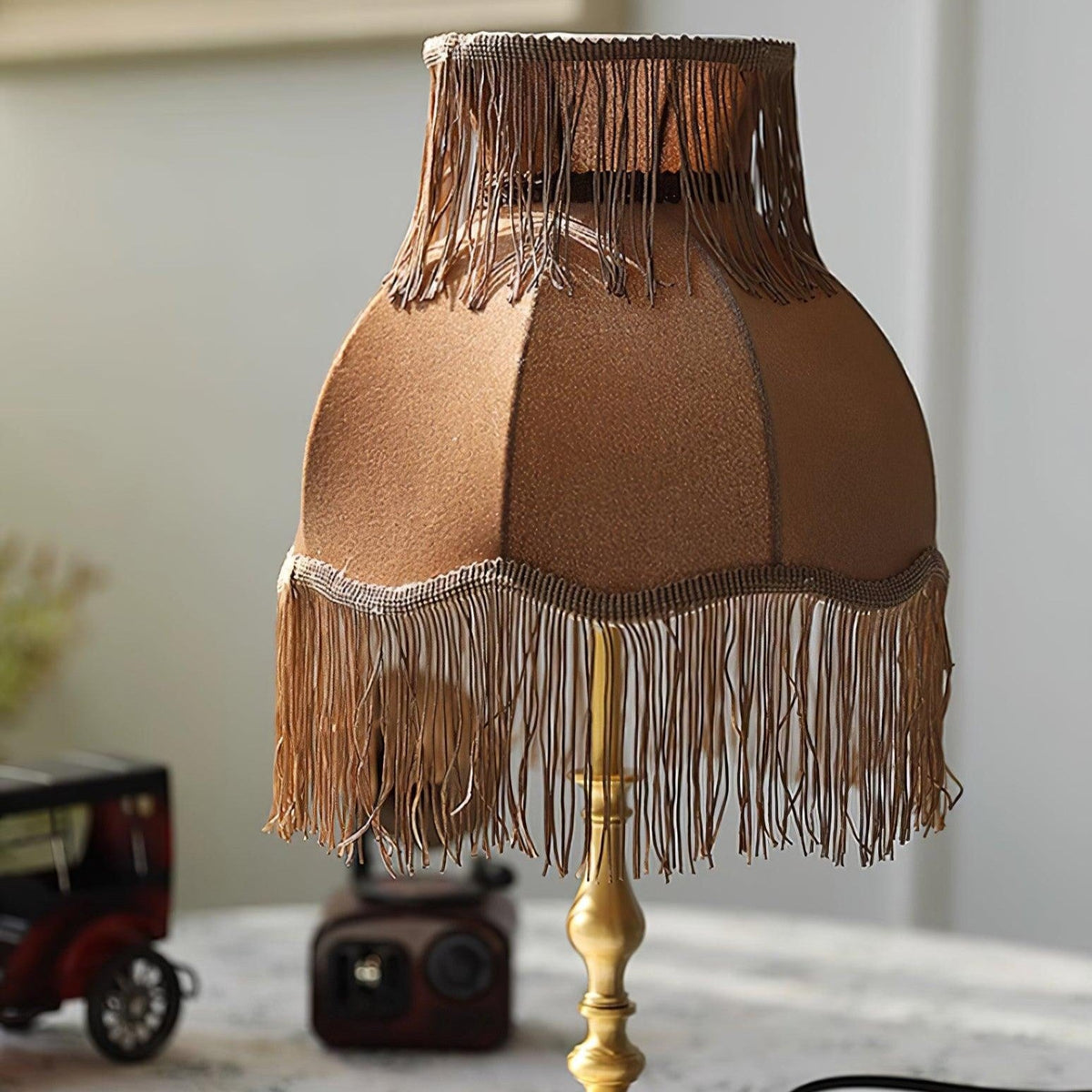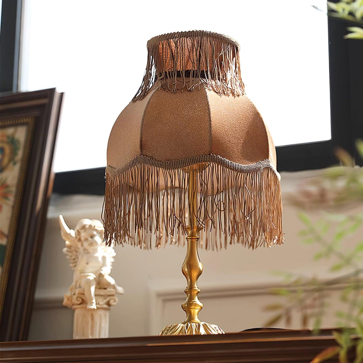 - Elevate your home decor with the stunning Donaway Table Lamp, a grand decoration that embodies luxury and sophistication. This lamp features a beautifully designed tassel lampshade, they cascade gracefully. And crafted with a premium brass base, the Donaway Table Lamp not only ensures durability but also radiates a warm, golden hue that complements its lavish design. The contrast between the rich texture of the tassel shade and the polished brass finish creates a striking visual that is sure to captivate and inspire admiration from your guests.