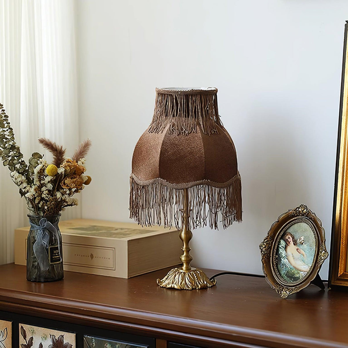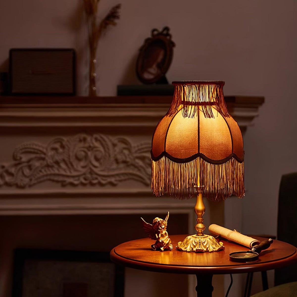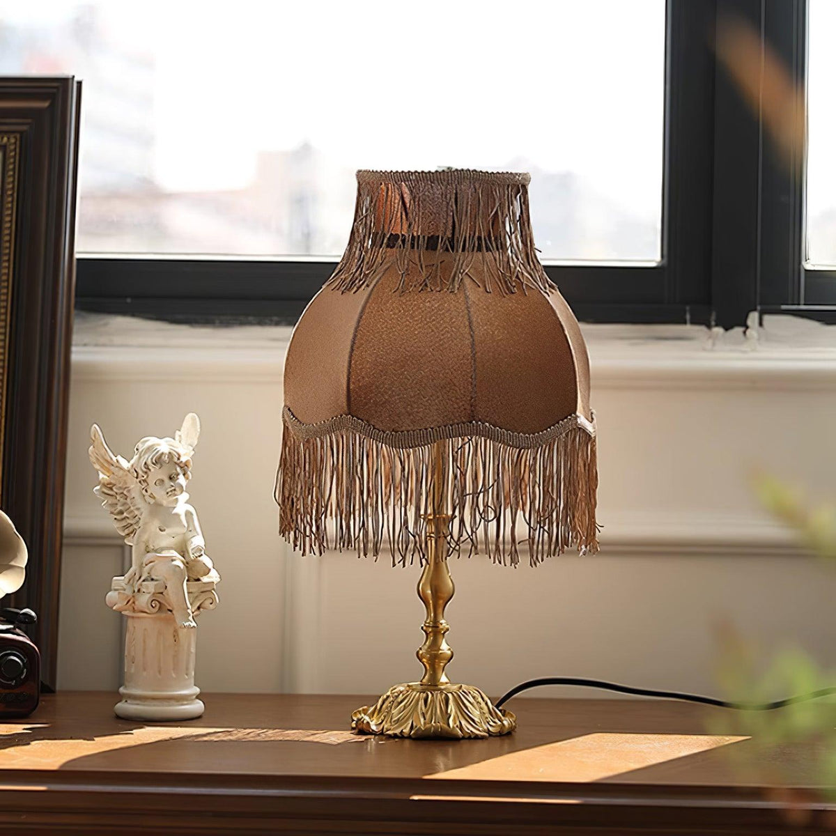 - Elevate your home decor with the stunning Donaway Table Lamp, a grand decoration that embodies luxury and sophistication. This lamp features a beautifully designed tassel lampshade, they cascade gracefully. And crafted with a premium brass base, the Donaway Table Lamp not only ensures durability but also radiates a warm, golden hue that complements its lavish design. The contrast between the rich texture of the tassel shade and the polished brass finish creates a striking visual that is sure to captivate and inspire admiration from your guests.