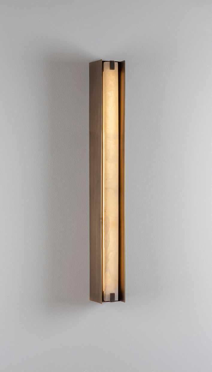- Imagine framing a beloved mirror or a statement piece of art with these elegant vertical columns of light. Designed to be installed individually or as a dramatic pair, they cast a flawless, gallery-worthy illumination that eliminates harsh shadows. The rich, aged brass casing emits a warm, golden tone, beautifully contrasting with the smooth, alabaster diffuser. This combination produces a uniquely soft and inviting glow, perfect for creating an atmosphere of serene sophistication in a bathroom, hallway, or living area.