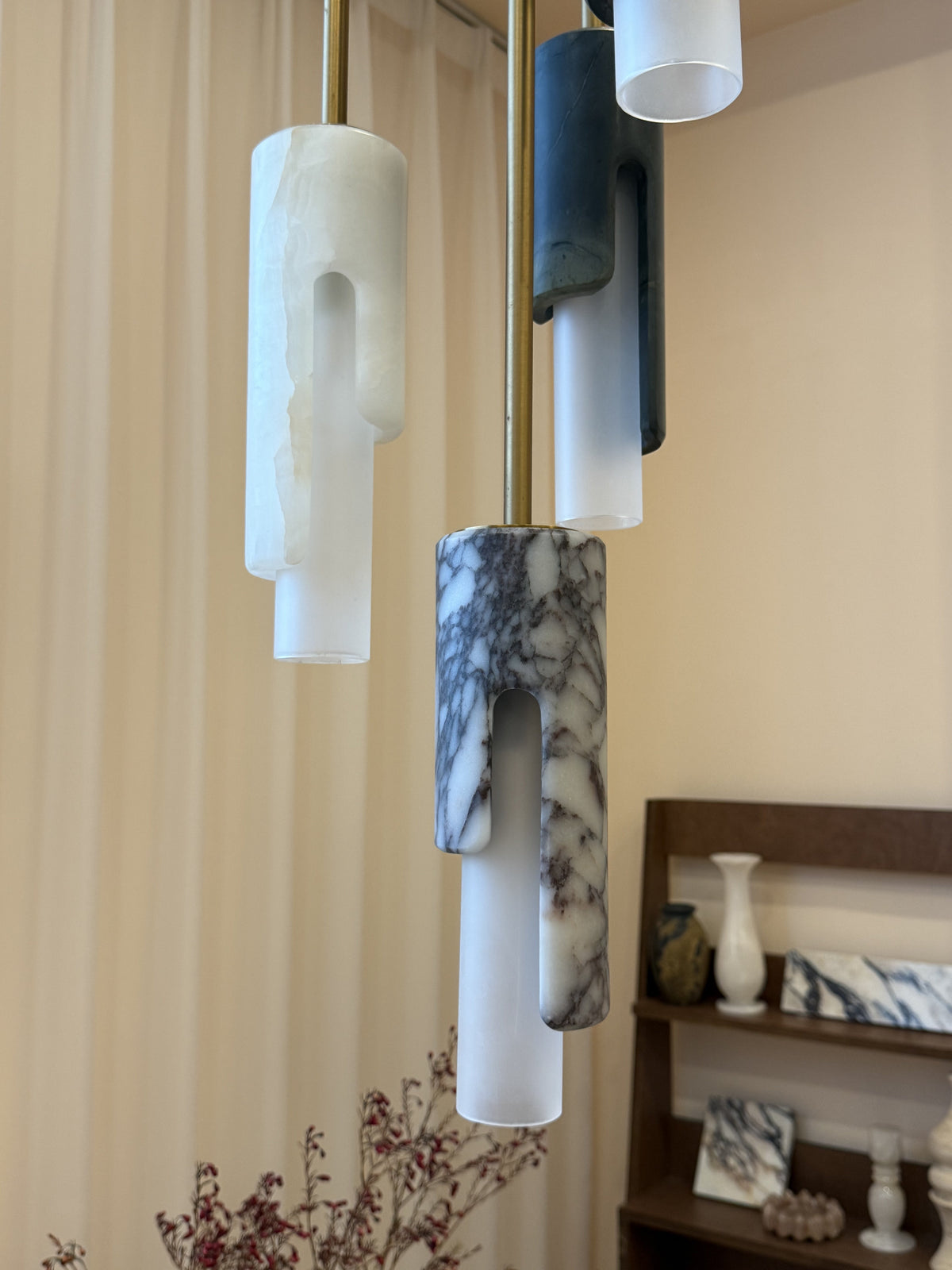 - We have combined six Dover pendant lights to create this stunning and magnificent chandelier. The six diffusers consist of one Travertine, one Rosso Levanto Marble, two Verde Guatemala Marble, one Alabaster, and one Calacatta Viola Marble. You can also customize the number of diffusers in different materials—please contact us for a quote.