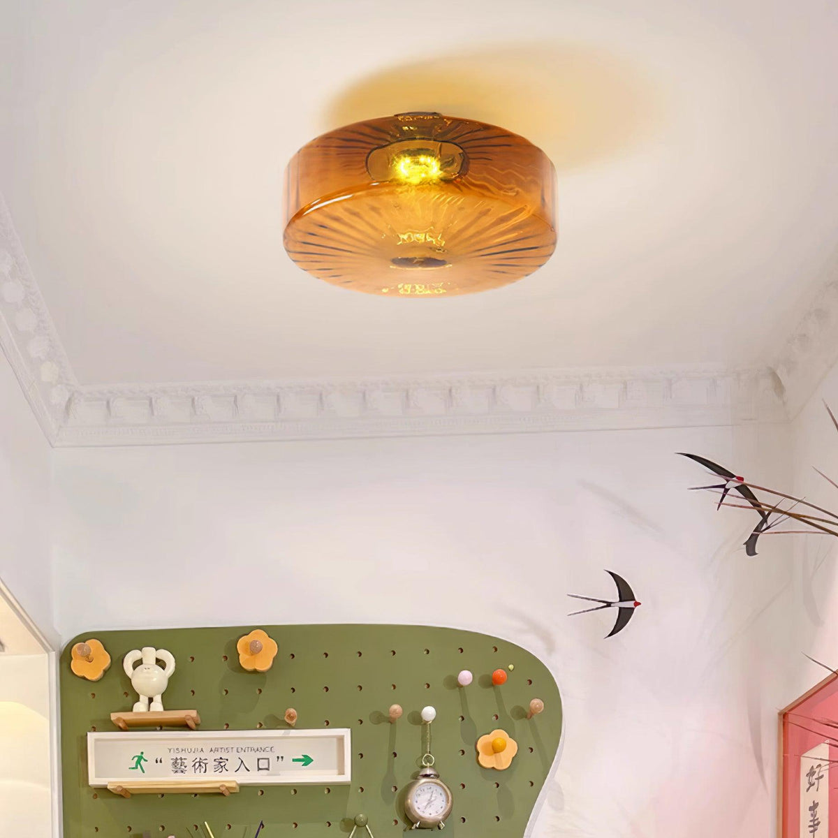 - Elevate your space with the Eberenz Flush Mount Lighting, a stunning lighting fixture that beautifully harmonizes vintage charm with contemporary design. The nearly cylindrical glass shade features a unique slight wave pattern, adding a distinctive texture that sets this light apart from ordinary flush mount fixtures. This captivating design not only enhances the aesthetics but also creates a mesmerizing play of light, casting a warm and inviting glow throughout your room.