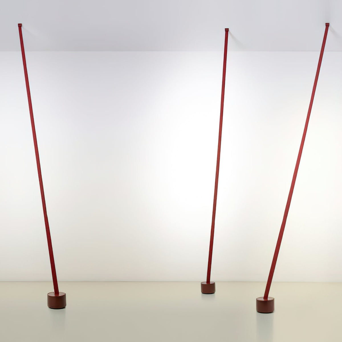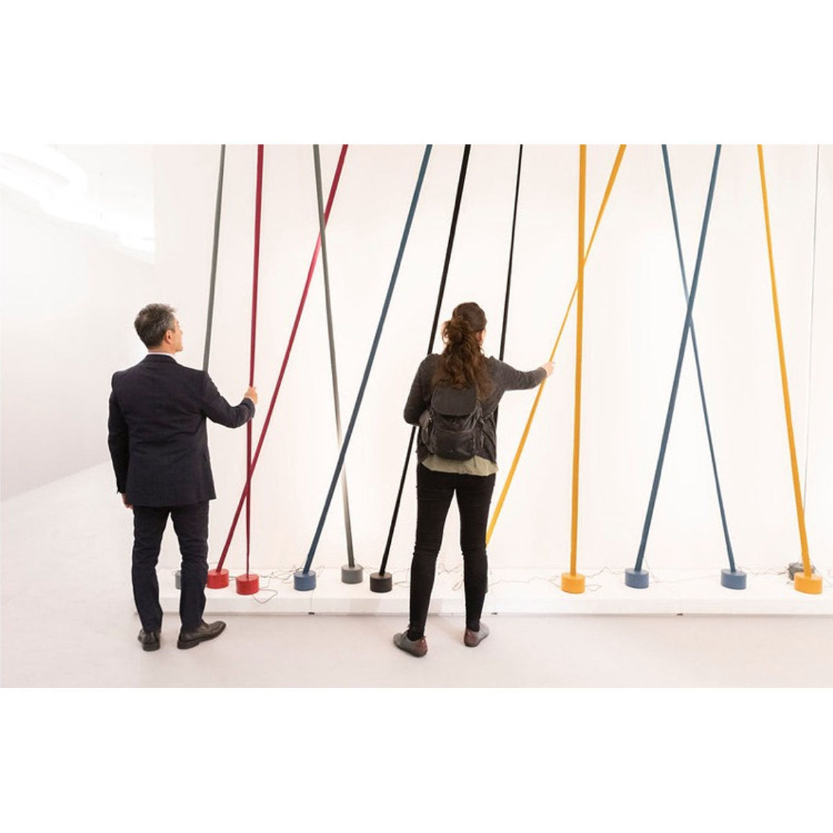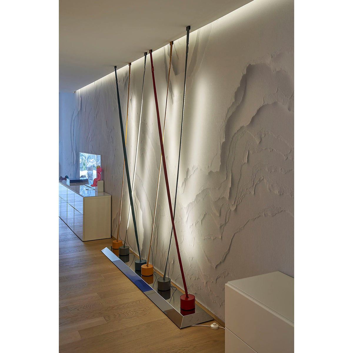 - The Elastica Floor Lamp's elasticized fabric is secured by a ceiling support and a counterweight cylindrical base, ensuring stability and preventing sagging. Both the support and base are painted in the same color as the fabric, creating a cohesive and visually appealing design.