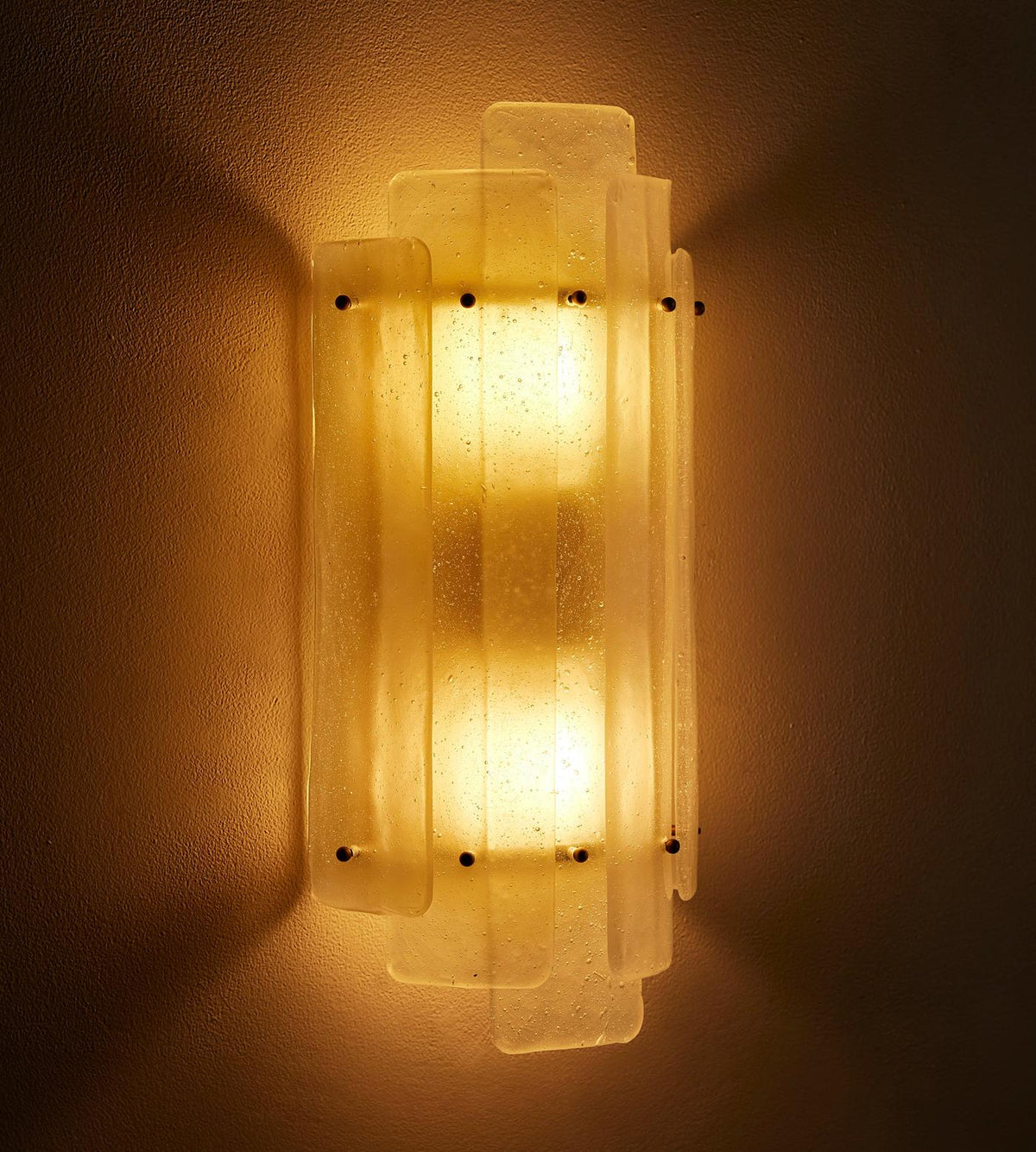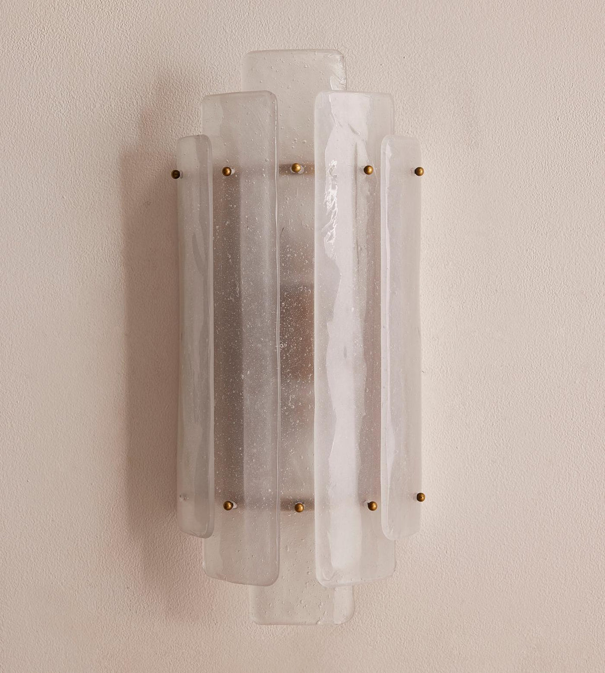 Introducing the Estelle Wall Sconce, where vintage-inspired charm meets modern artistry. This is more than just a light fixture; it's a statement piece designed to transform the ambiance of any room. Suspended layers of hand-blown micro bubble glass create a captivating texture, casting intricate shadows and offering a soft, inviting glow reminiscent of the sophisticated styles.