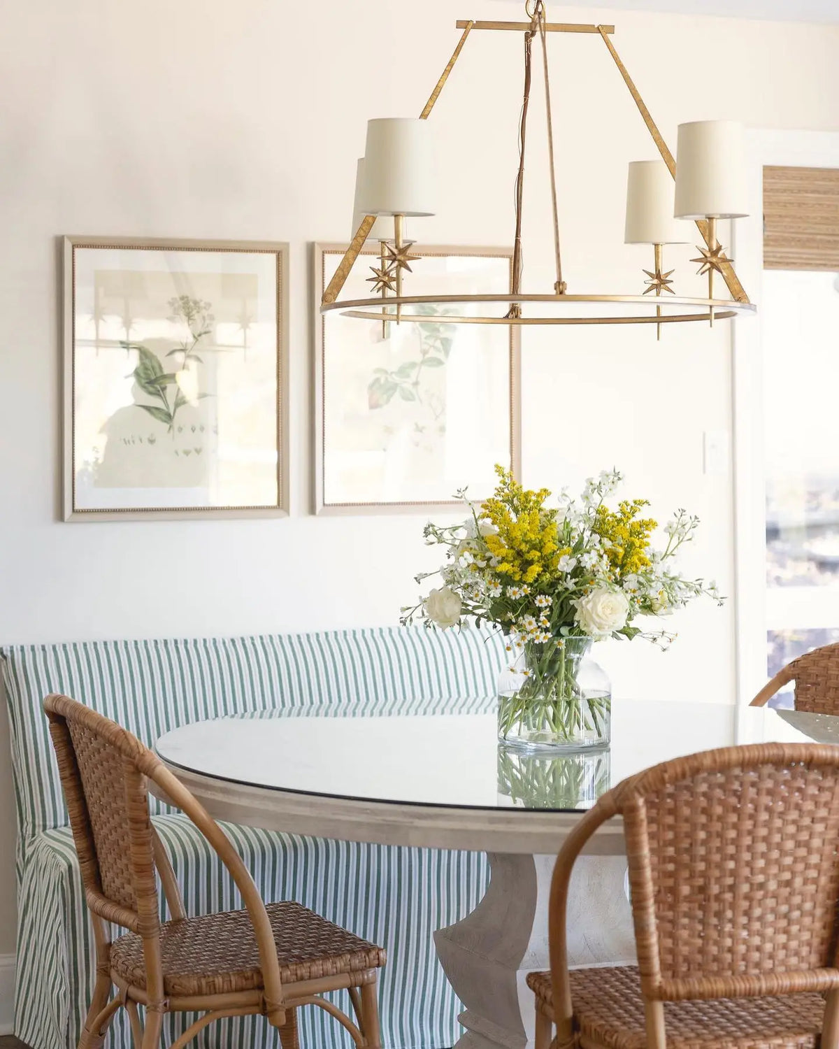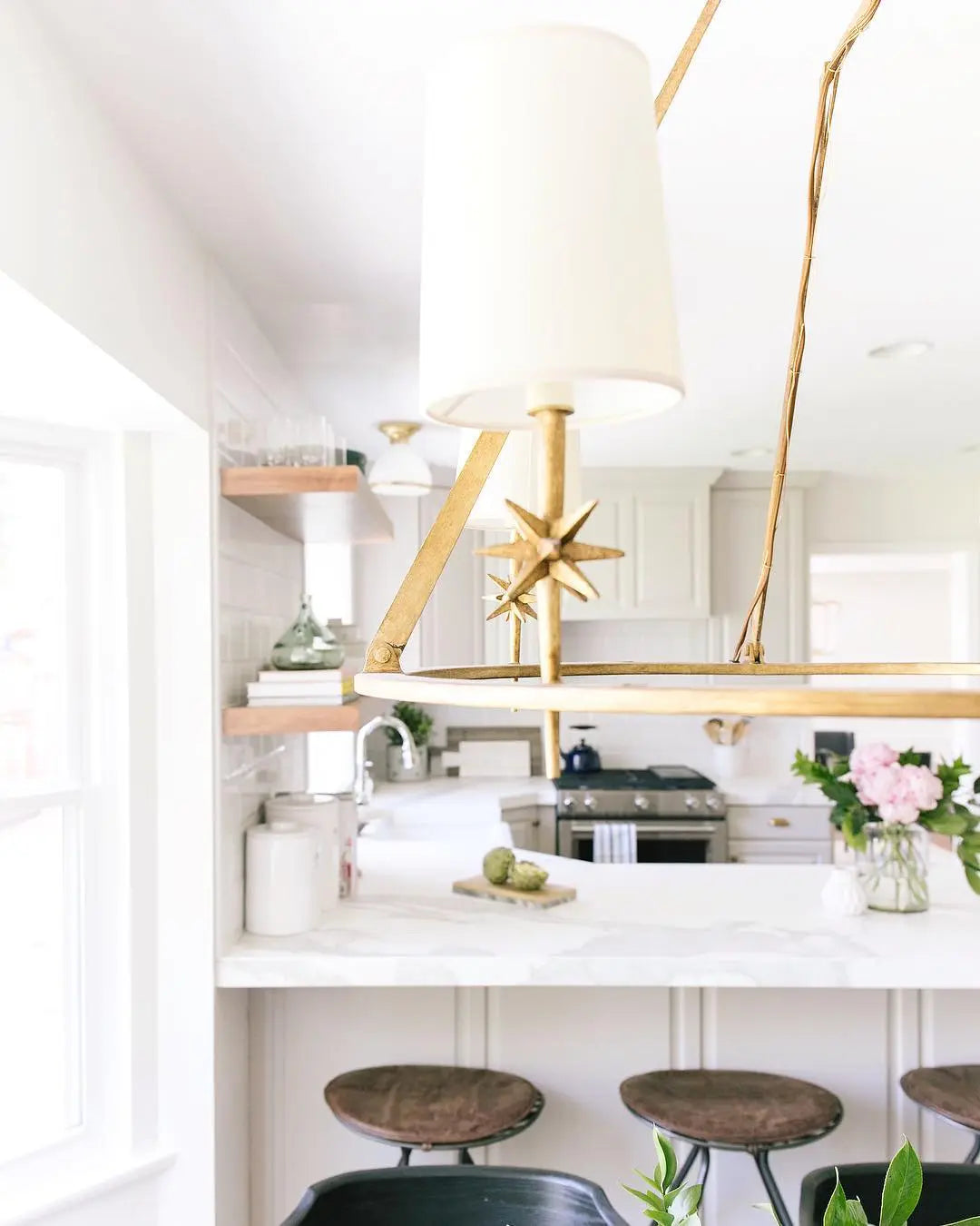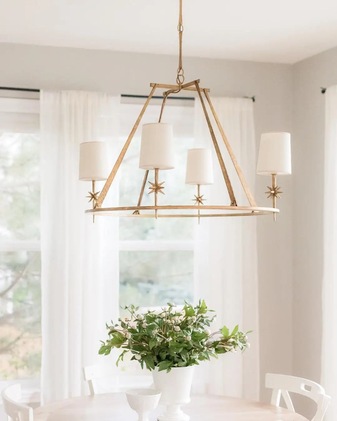- Bask in the warm, celestial glow of the Etoile Chandelier, a fixture where modern geometry dances with playful artistry. This is not merely a source of light; it is a conversation piece, a sculptural installation that transforms the very atmosphere of a room. Designed for those who appreciate the beauty of contrast, the Etoile masterfully balances bold, graphic ironwork with the soft, organic charm of textural linen shades. It is at once a statement of refined glamour and an invitation to relax, making it the perfect centerpiece for a home that values both design and comfort.