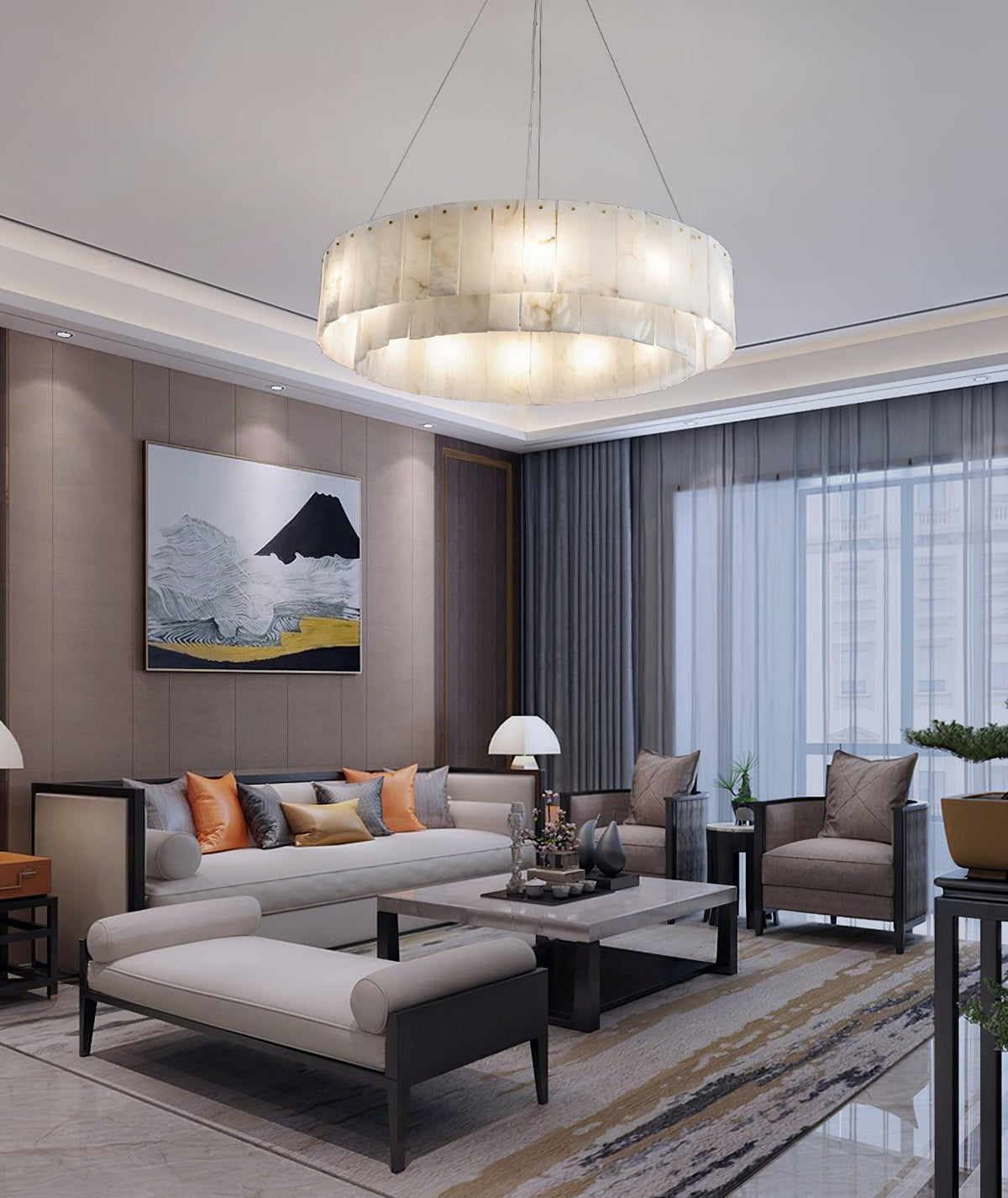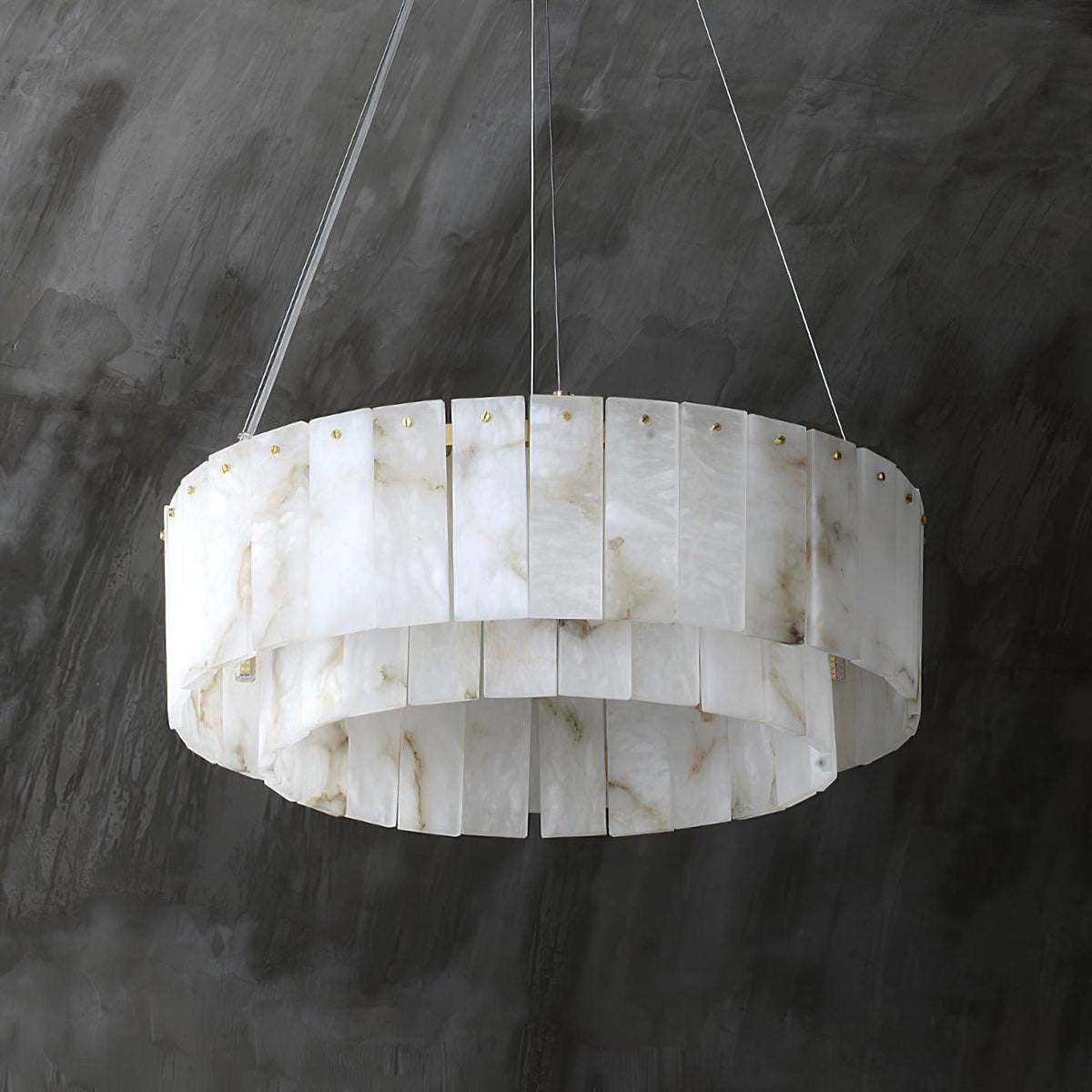 - Eunice Alabaster Chandelier made up of a single rectangular alabaster, features a double-layered design that allows the light to be reflected multiple times and also fills the center.