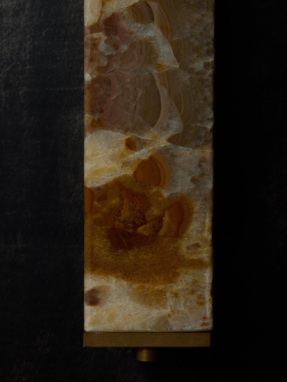 - Elegance meets artistry with a polished brass backplate and end caps, framing the onyx beautifully and adding a touch of modern luxury. The true magic of these sconces lies in their individuality; no two are exactly alike.