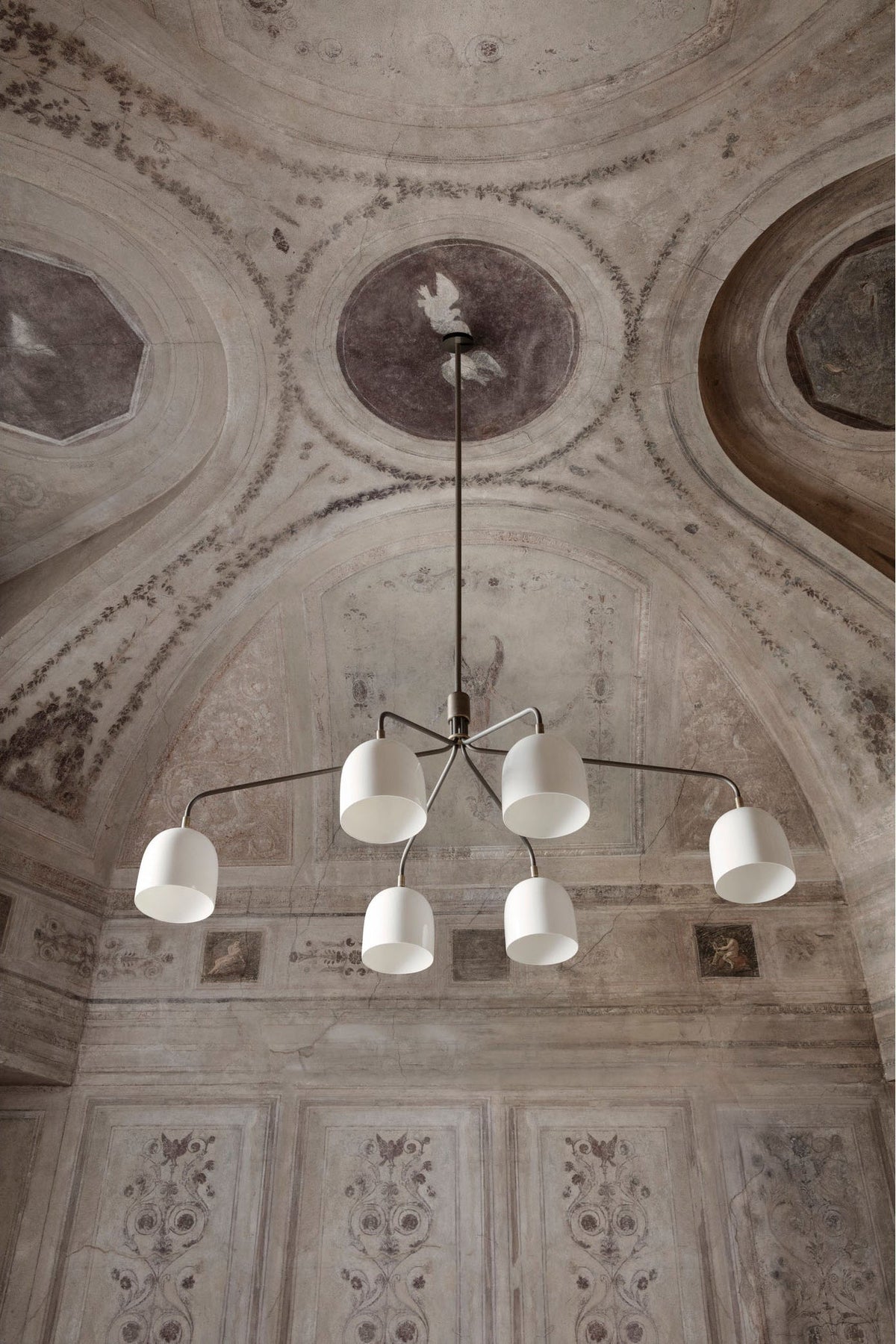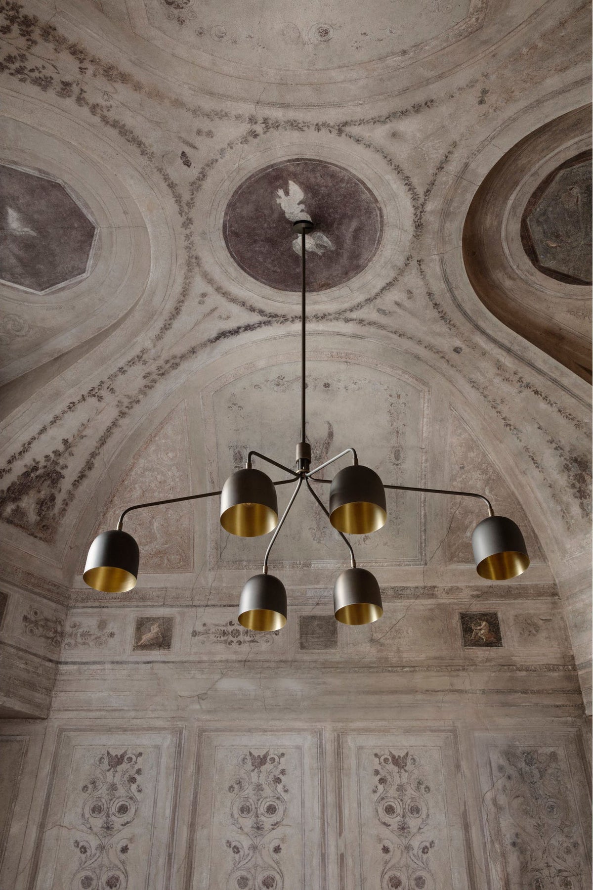 - Featuring four gracefully elongated ‘octopus arms,’ the Filpus Chandelier exudes a modern, sculptural silhouette. The gunmetal brass shades, with their brushed brass interiors, introduce an industrial edge, while the warm, tactile materials ensure a welcoming ambiance. For a softer glow, opt for the delicate bone china shade—casting a diffused, ethereal light that enhances any setting.