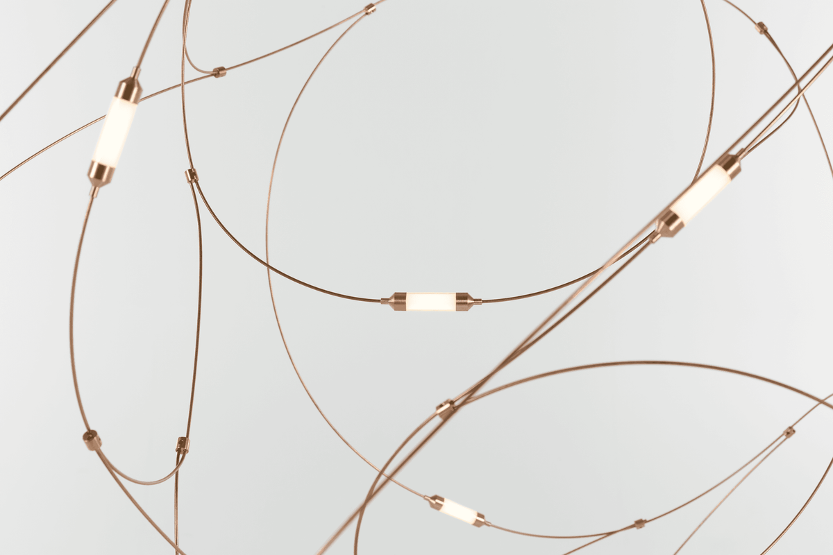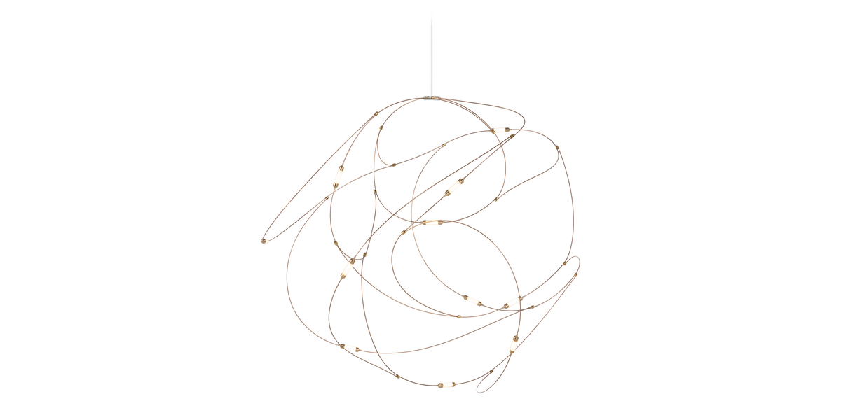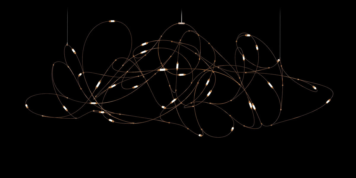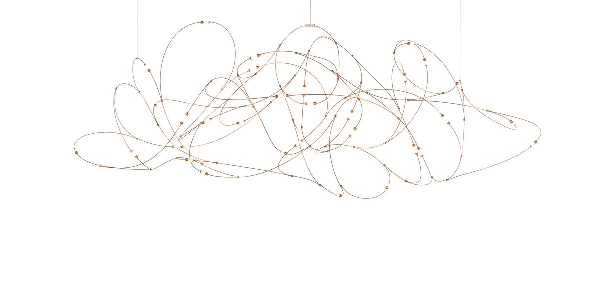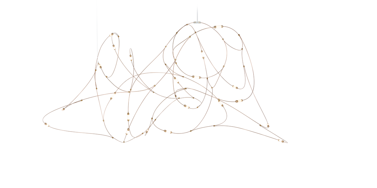- Crafted with meticulous attention to detail, the Flock features an elegant framework of fine, hand-bent bronze wires that create soft, organic curves. Suspended within this delicate structure are solid brass cups, housing energy-efficient LEDs with frosted diffusers. By day, it’s a light and airy sculptural element, adding a touch of modern elegance to your space. As dusk falls, it undergoes a magical transformation. The individual lights ignite like a swarm of gentle beetles, casting a soft, inviting, and warm glow that banishes harsh shadows.