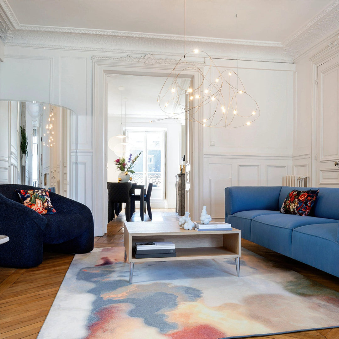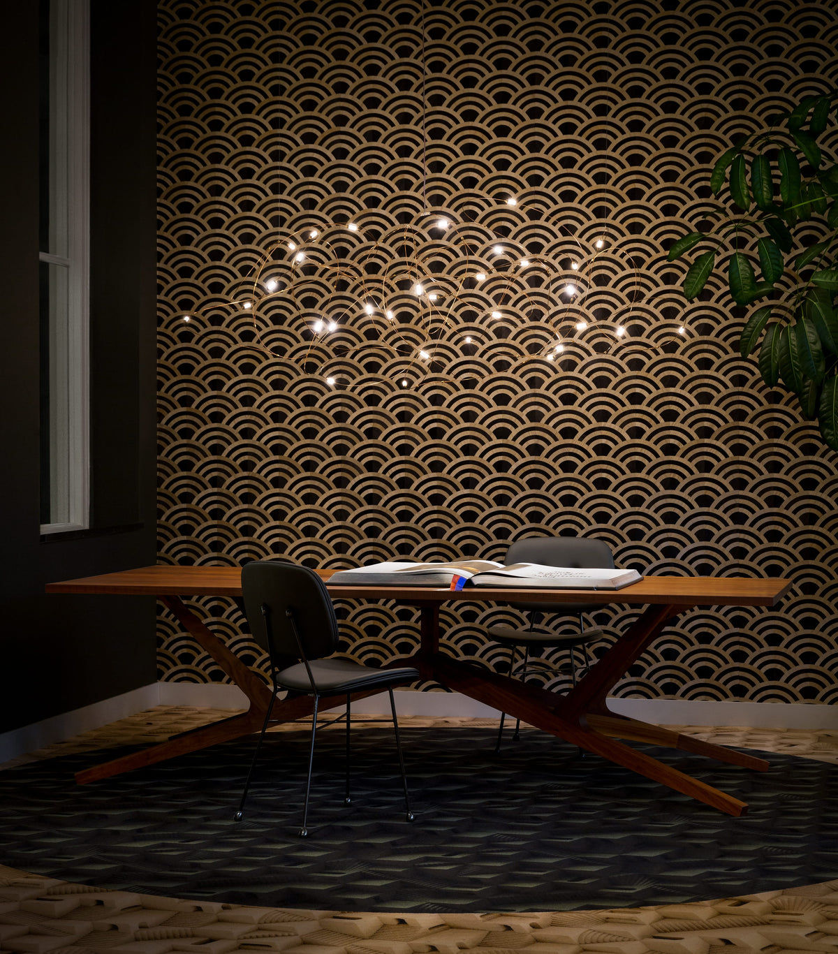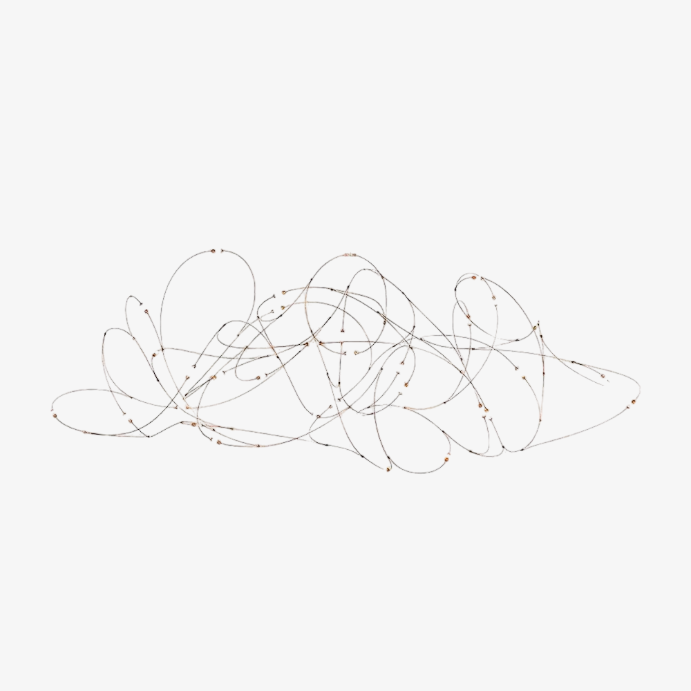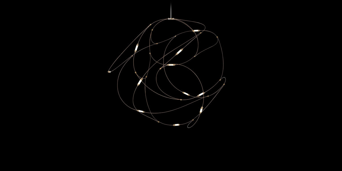 - Crafted with meticulous attention to detail, the Flock features an elegant framework of fine, hand-bent bronze wires that create soft, organic curves. Suspended within this delicate structure are solid brass cups, housing energy-efficient LEDs with frosted diffusers. By day, it’s a light and airy sculptural element, adding a touch of modern elegance to your space. As dusk falls, it undergoes a magical transformation. The individual lights ignite like a swarm of gentle beetles, casting a soft, inviting, and warm glow that banishes harsh shadows.