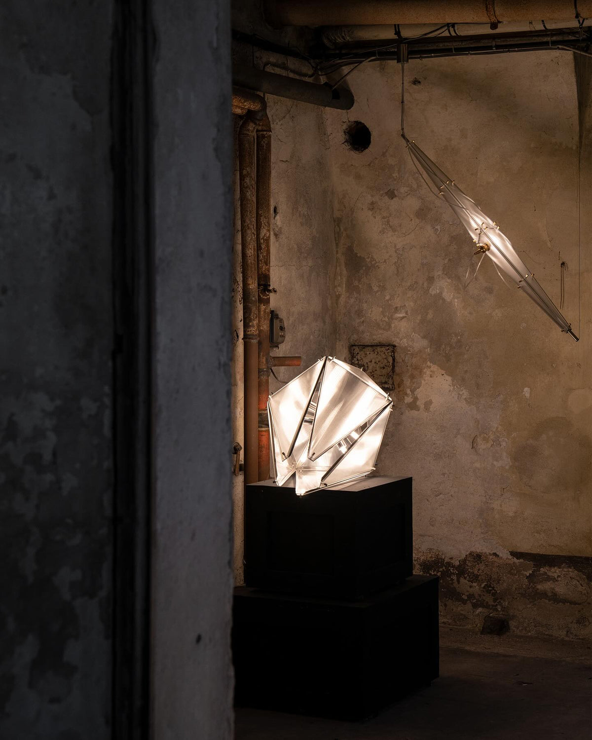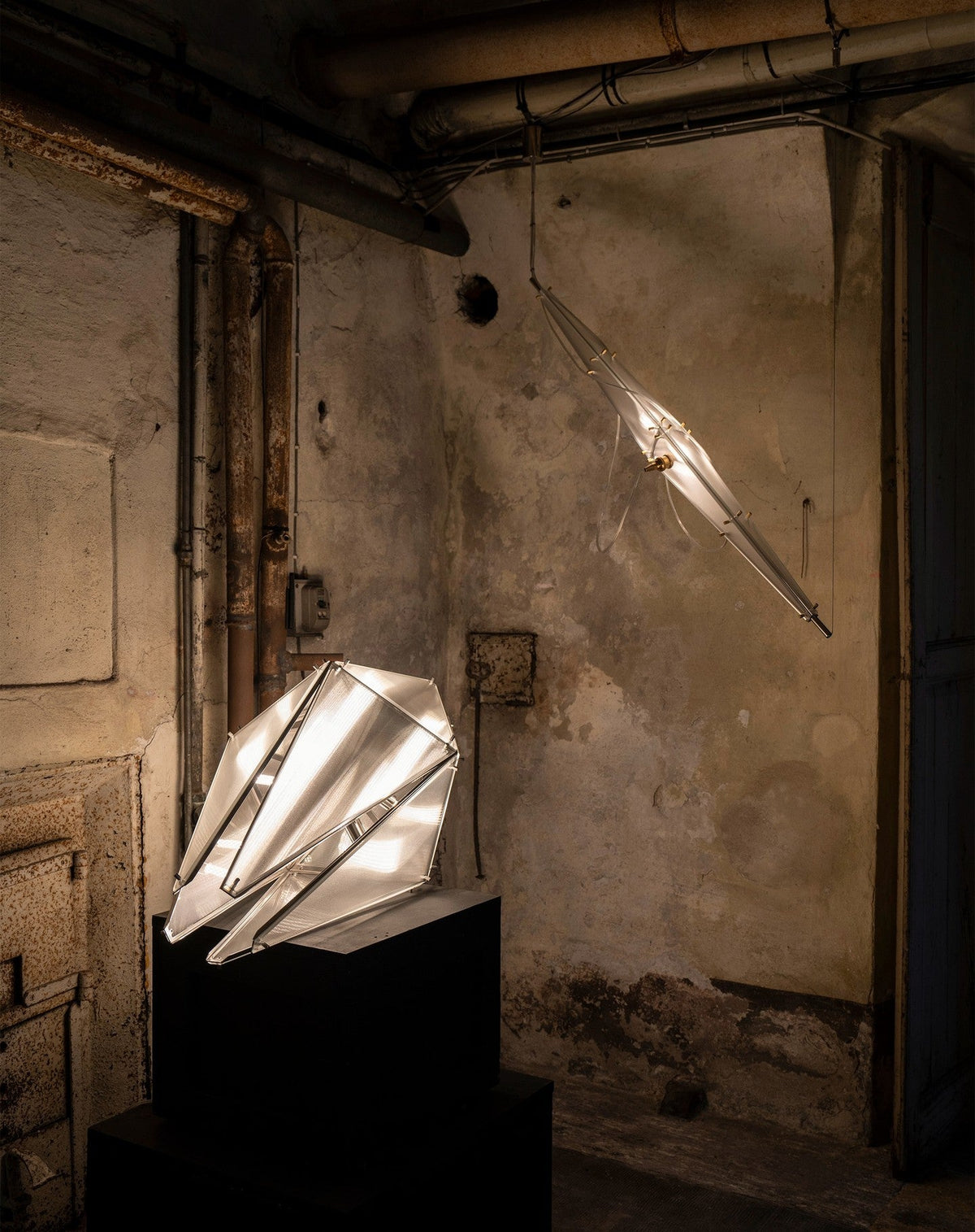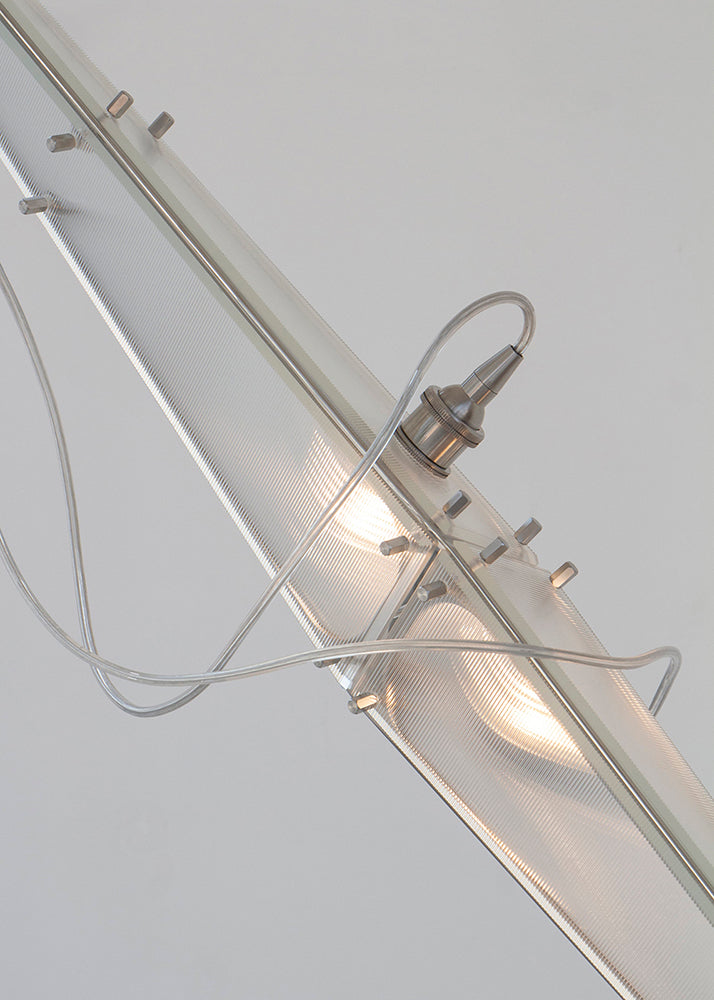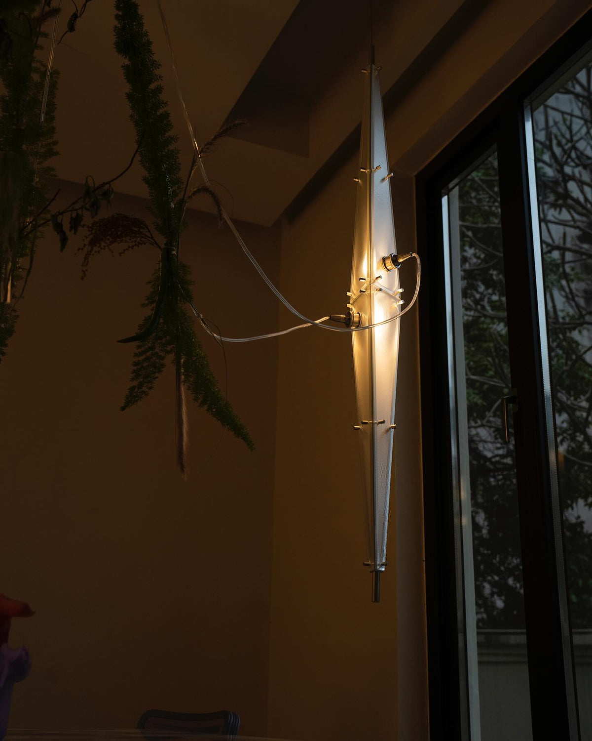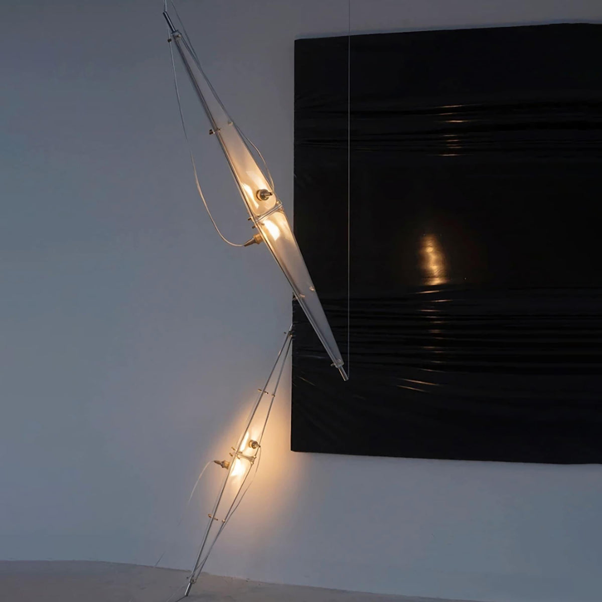 - The glass elements, with their soft, delicate texture, are masterfully cut and mounted onto the stainless steel frame, creating a striking contrast between refinement and raw industrial aesthetics. Designed to challenge conventions, the lamp intentionally exposes its holder, screws, and wiring, directly fixed onto the glass to evoke a bold, deliberate tension—a harmonious yet provocative clash of delicacy and strength.