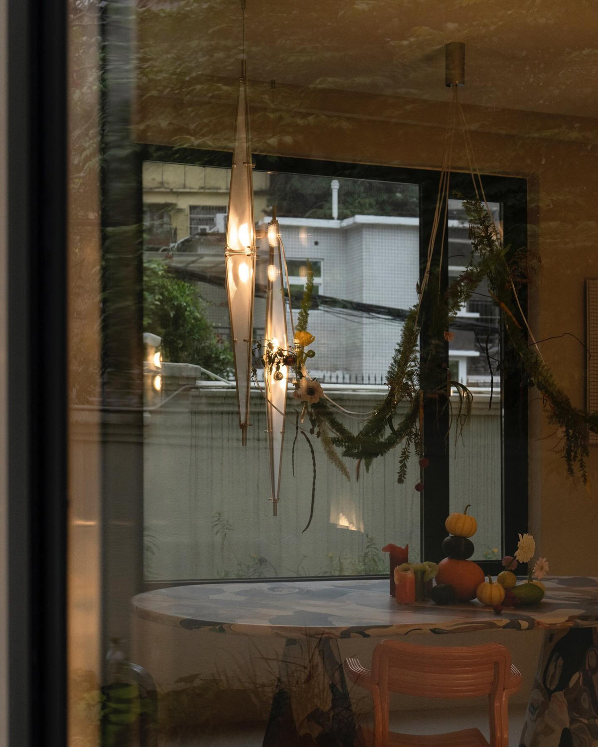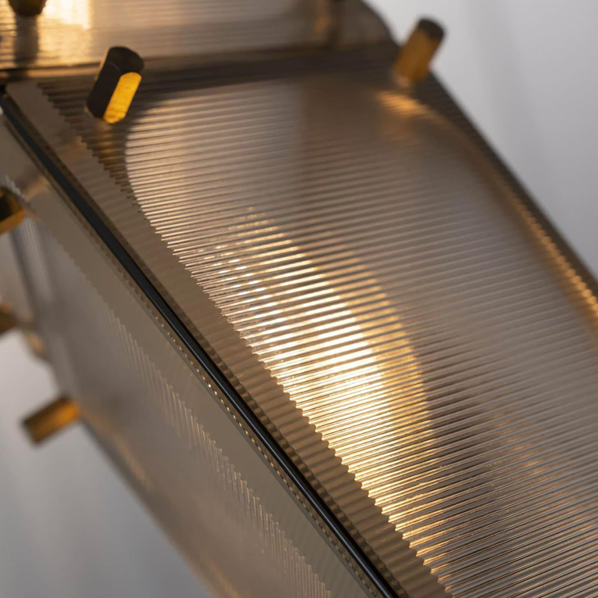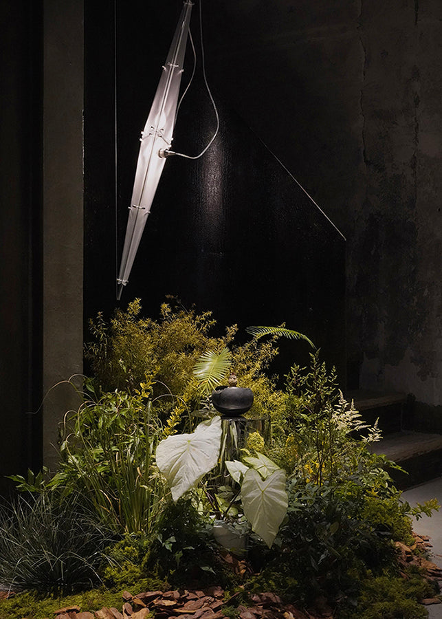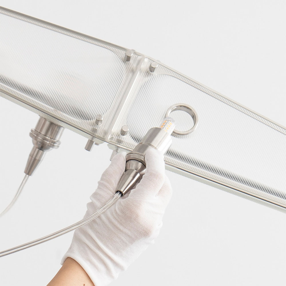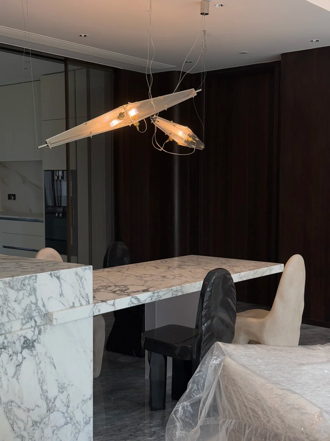 - The glass elements, with their soft, delicate texture, are masterfully cut and mounted onto the stainless steel frame, creating a striking contrast between refinement and raw industrial aesthetics. Designed to challenge conventions, the lamp intentionally exposes its holder, screws, and wiring, directly fixed onto the glass to evoke a bold, deliberate tension—a harmonious yet provocative clash of delicacy and strength.