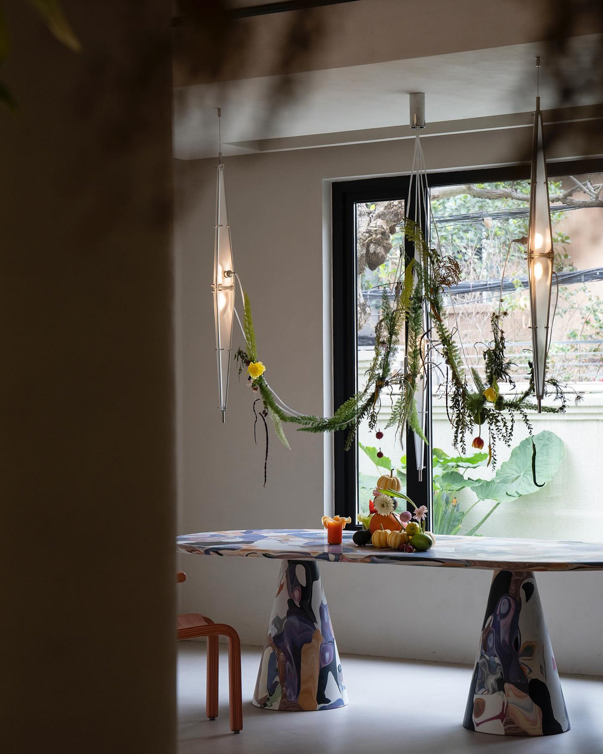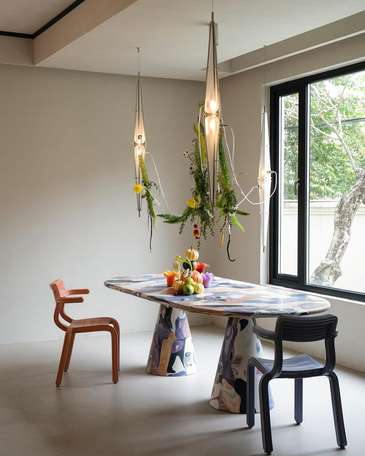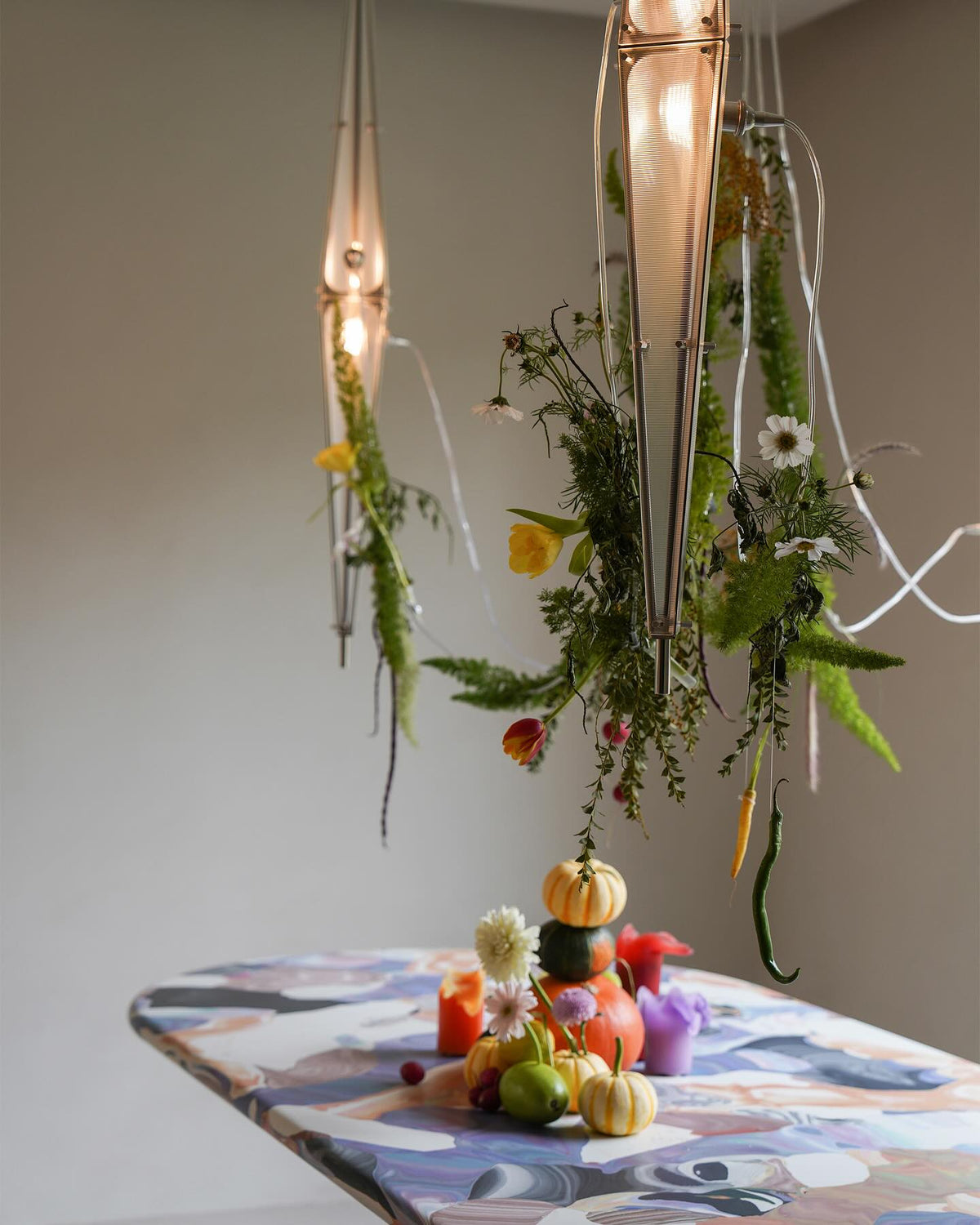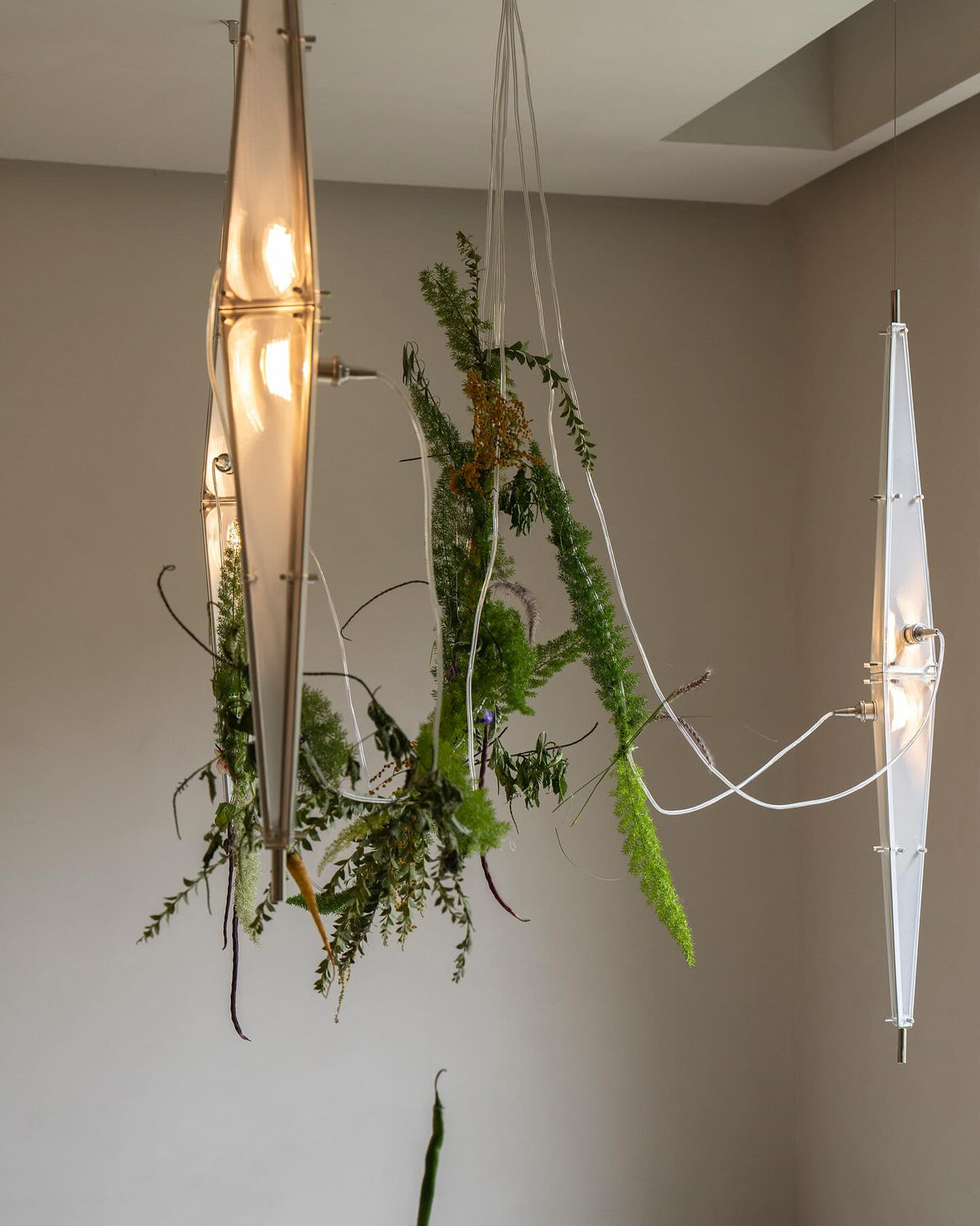 - The glass elements, with their soft, delicate texture, are masterfully cut and mounted onto the stainless steel frame, creating a striking contrast between refinement and raw industrial aesthetics. Designed to challenge conventions, the lamp intentionally exposes its holder, screws, and wiring, directly fixed onto the glass to evoke a bold, deliberate tension—a harmonious yet provocative clash of delicacy and strength.