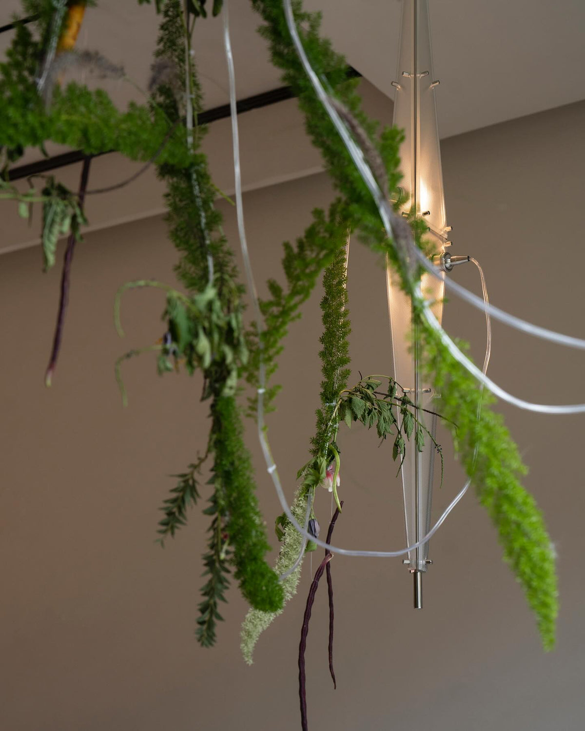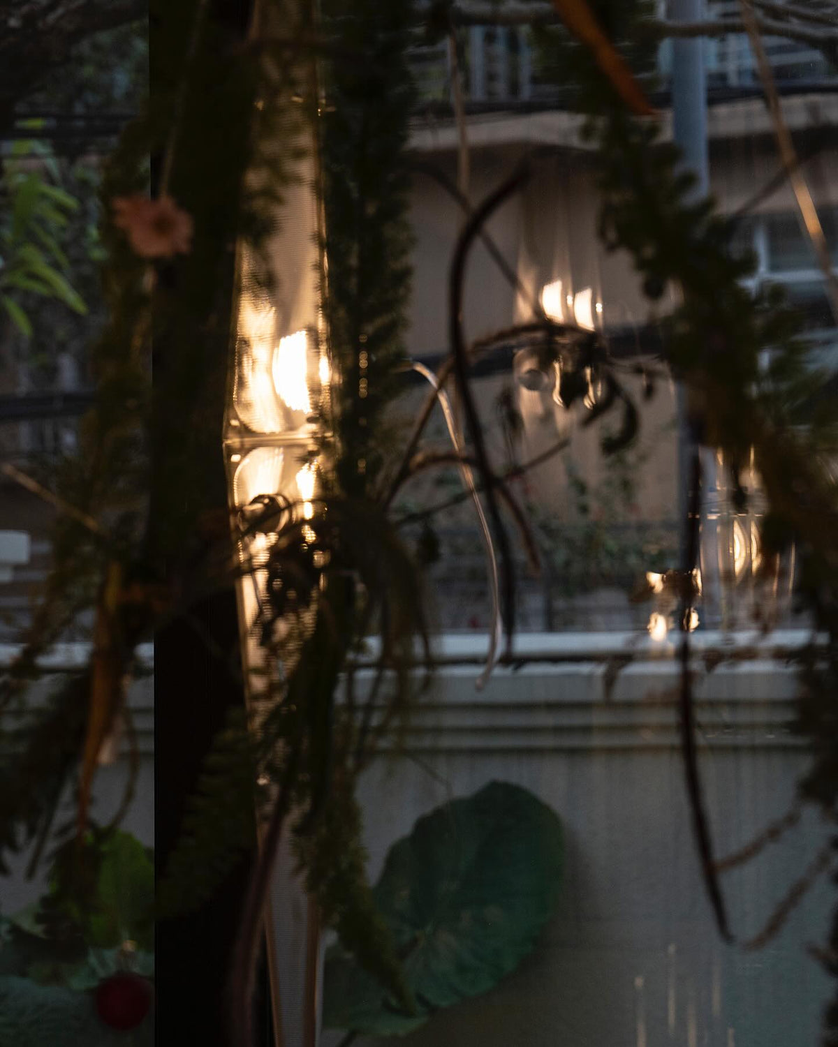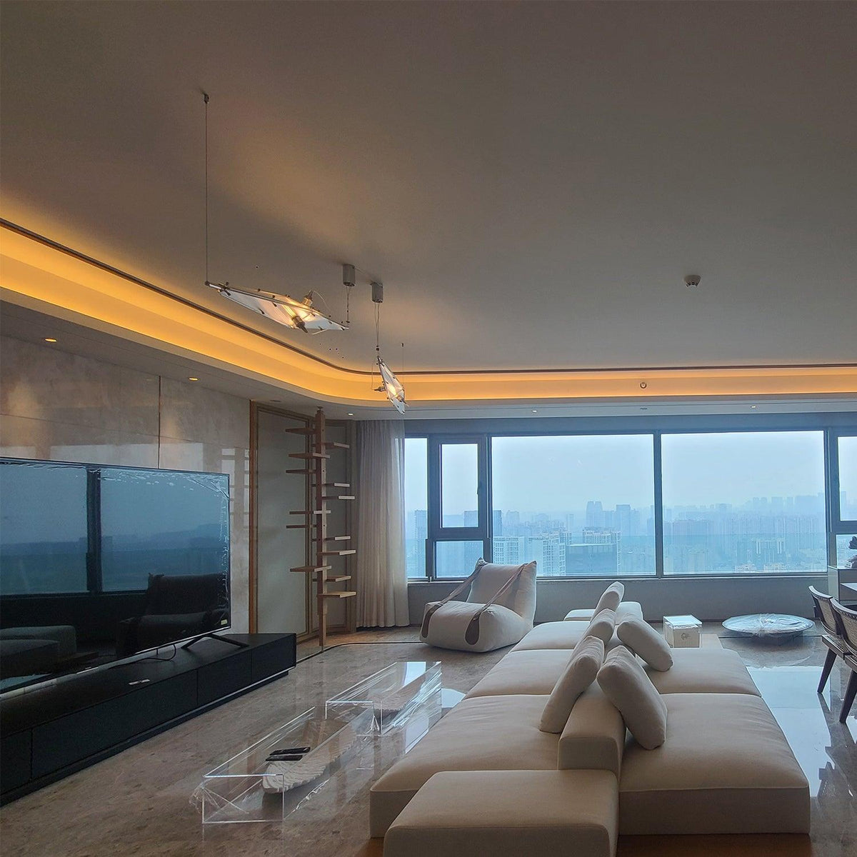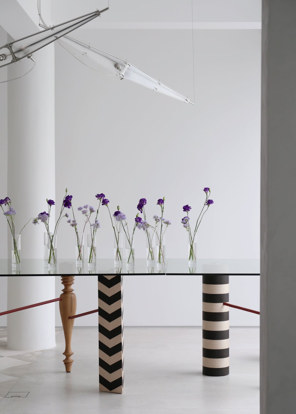 - The glass elements, with their soft, delicate texture, are masterfully cut and mounted onto the stainless steel frame, creating a striking contrast between refinement and raw industrial aesthetics. Designed to challenge conventions, the lamp intentionally exposes its holder, screws, and wiring, directly fixed onto the glass to evoke a bold, deliberate tension—a harmonious yet provocative clash of delicacy and strength.