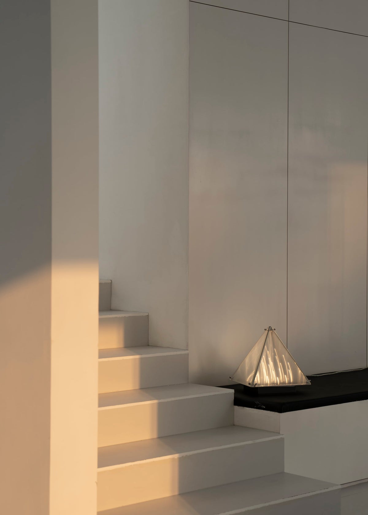 - Crafted with precision, the lamp features a sleek metal structure encased in delicate glass, creating a dynamic interplay of light and shadow. The light travels through the intricate design, sometimes reflecting off the walls, other times breaking free, creating an illusion of infinite space within a compact form.