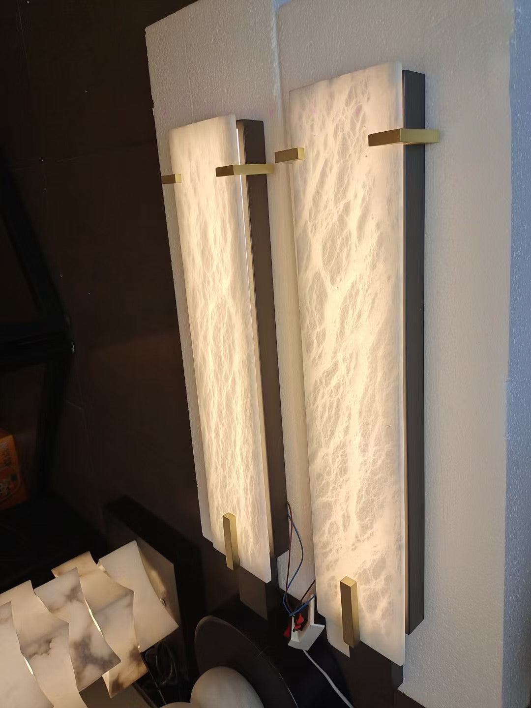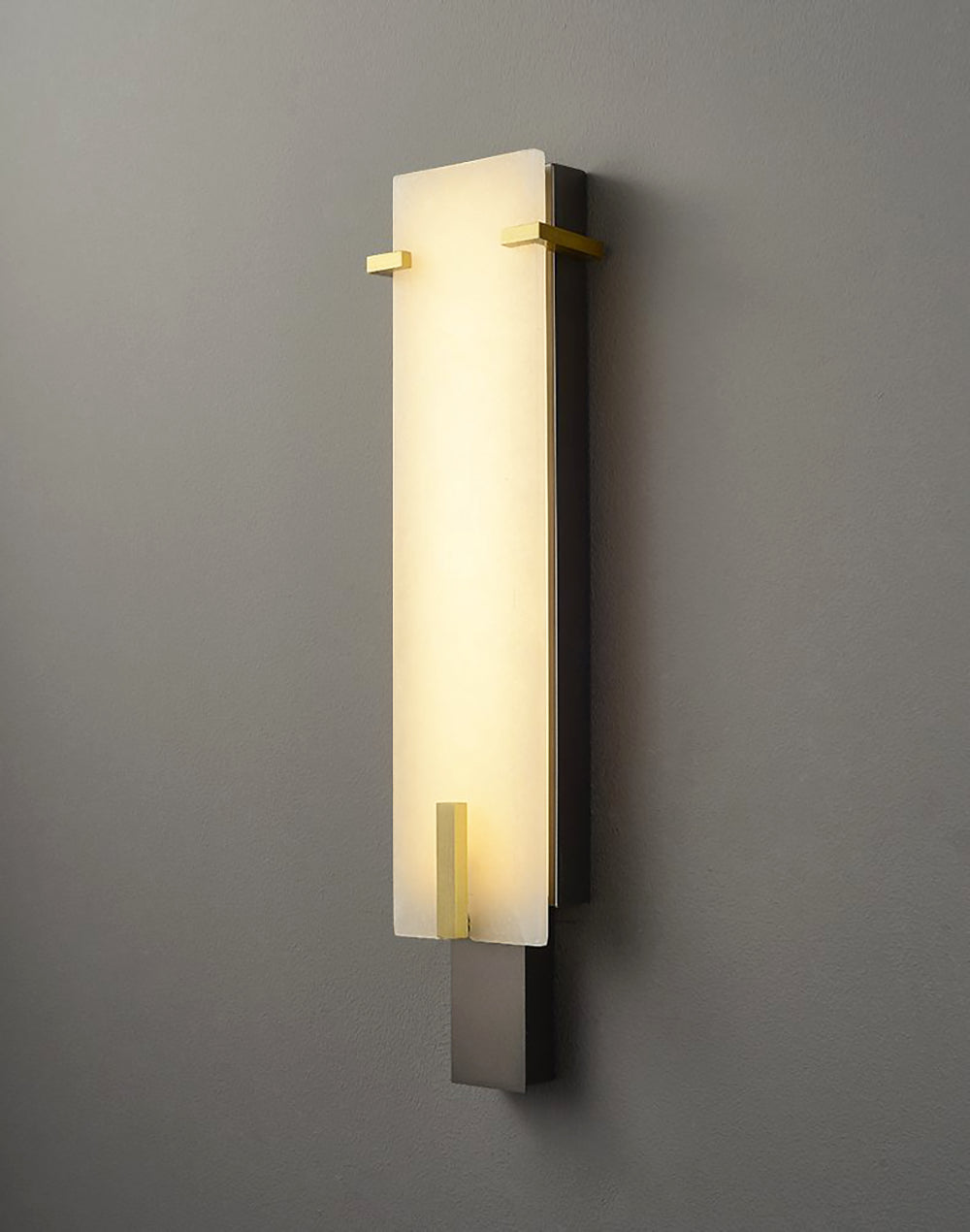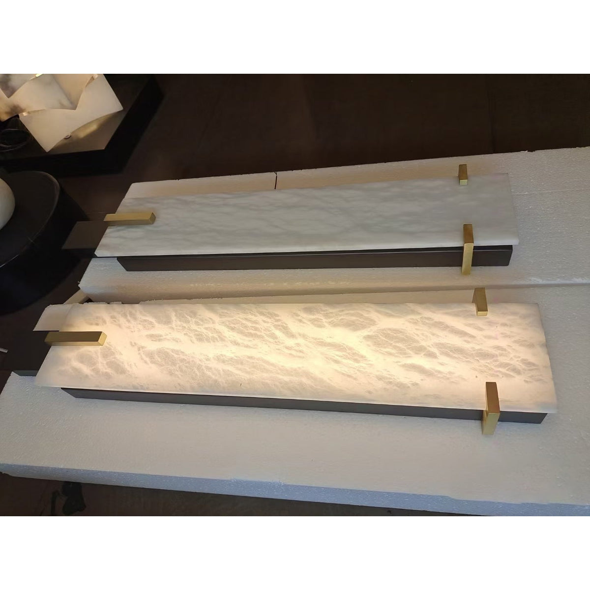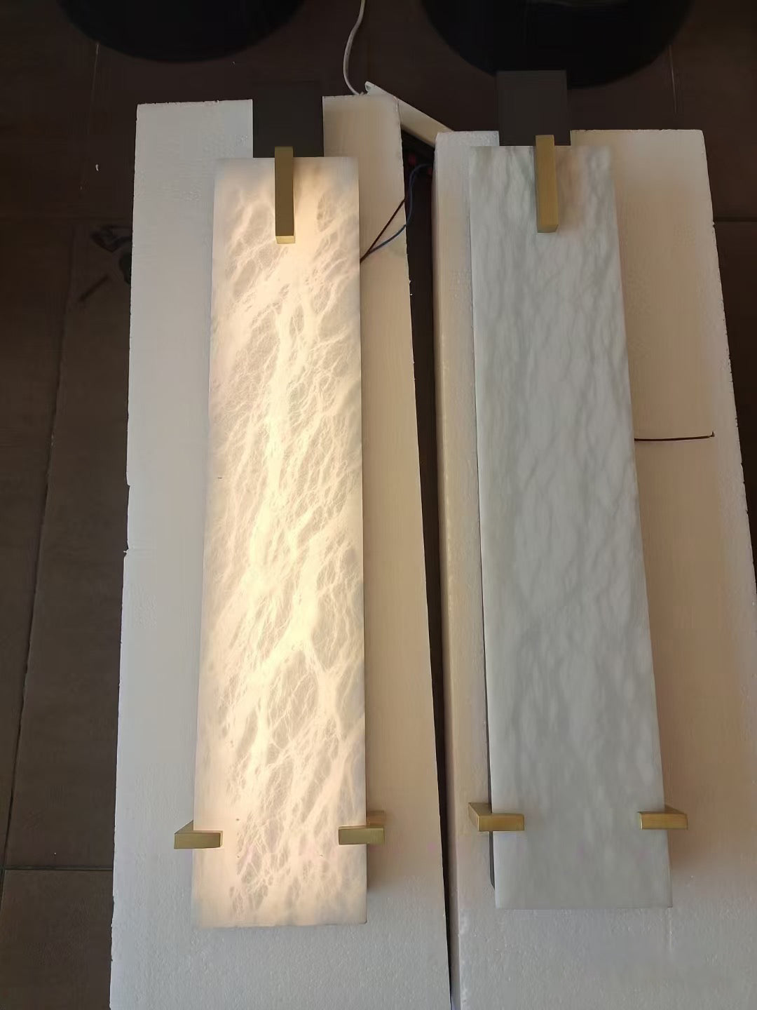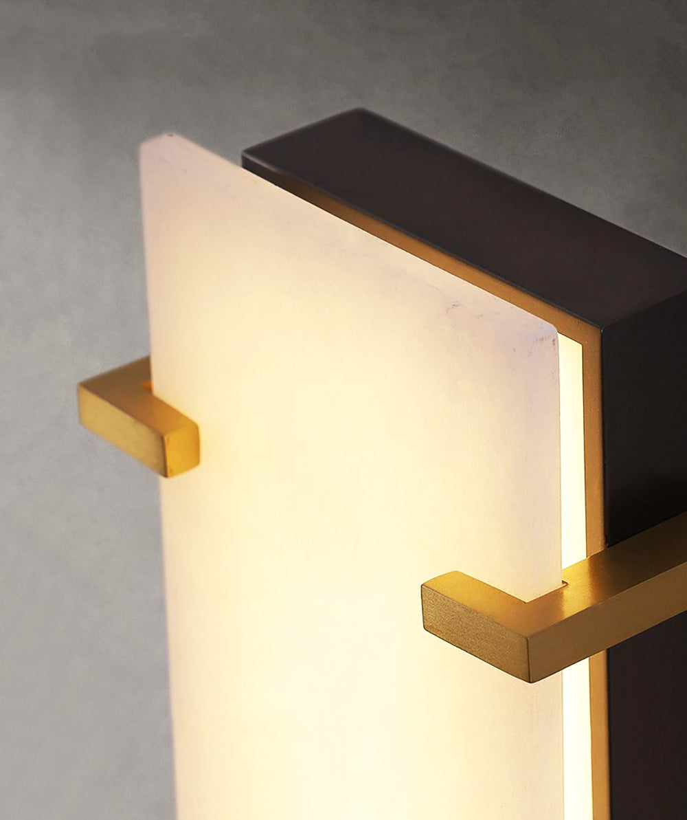 • Golden Hoop Alabaster Wall Sconce, a rectangular piece of alabaster seems to be gently embraced by a golden metal frame. The three sides of the exquisite gold edge set off the warm texture of alabaster. The addition of the black base adds a sense of mystery to the overall design. Three sizes are available, whether it is to embellish a small space or decorate a large area of the wall, it can easily create a noble and elegant atmosphere.