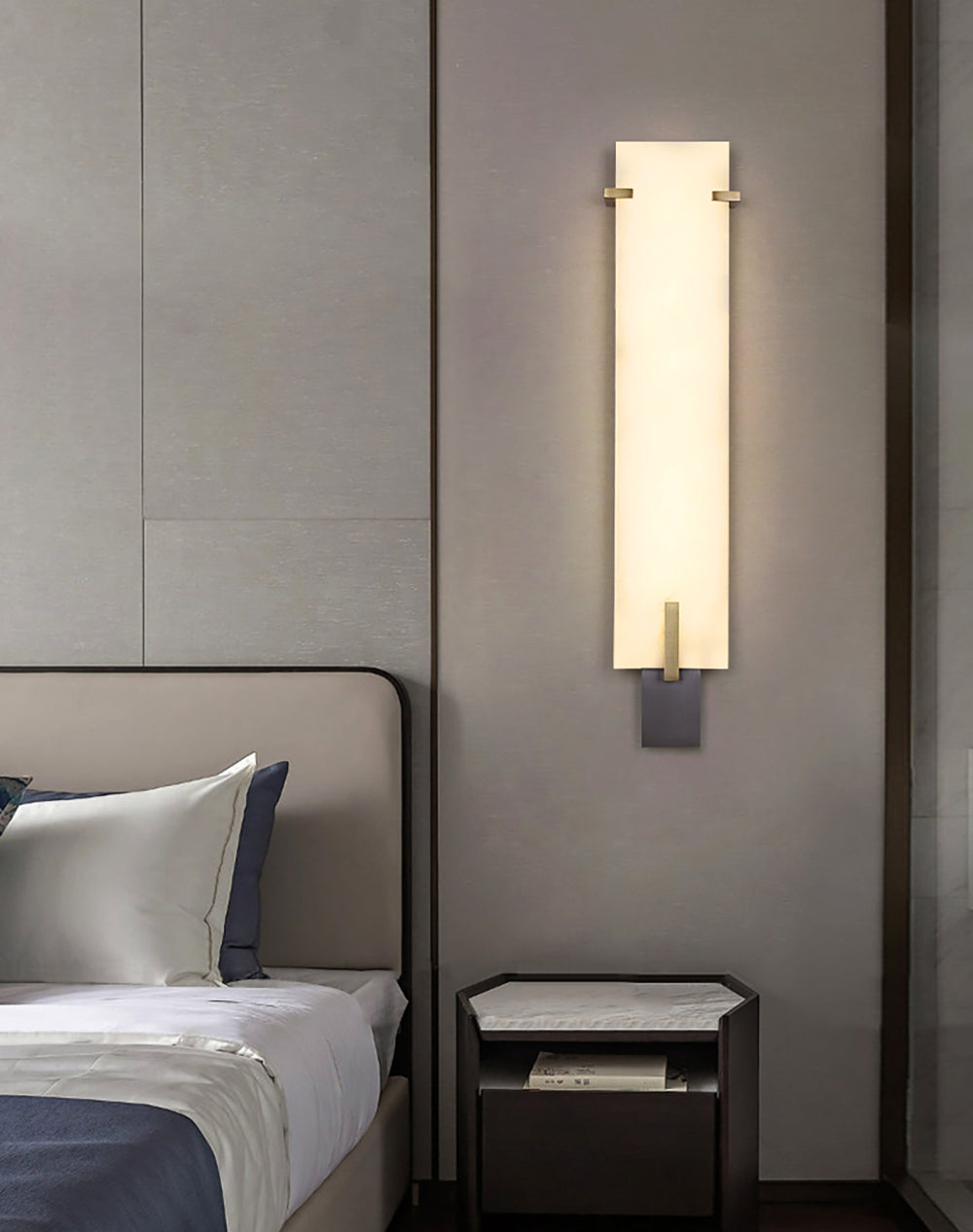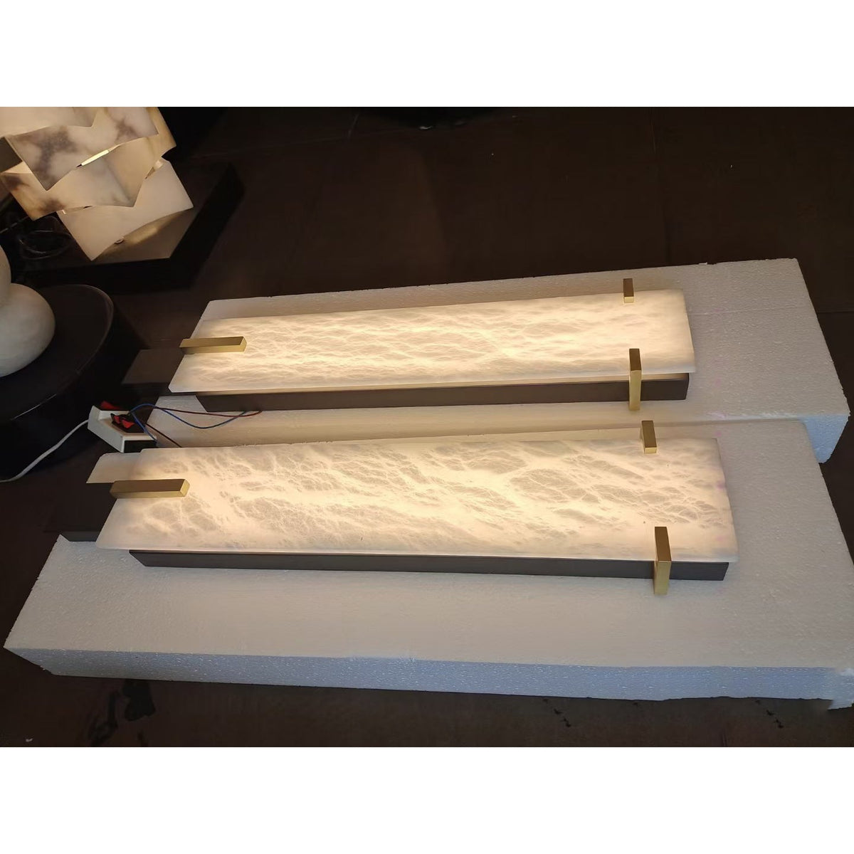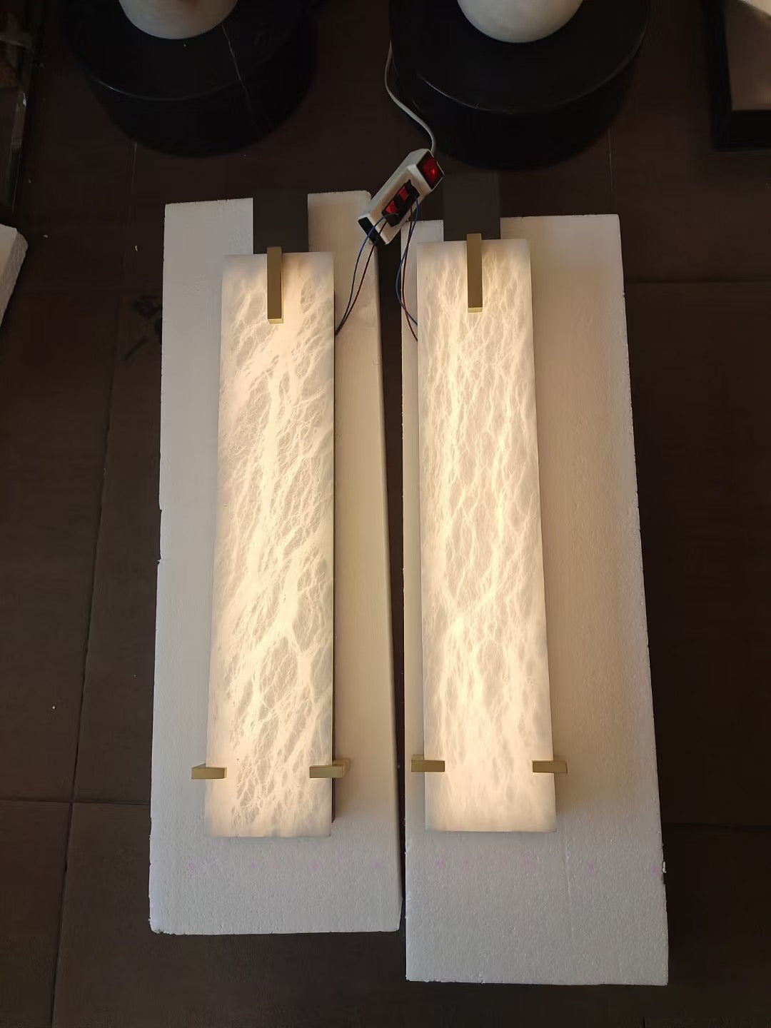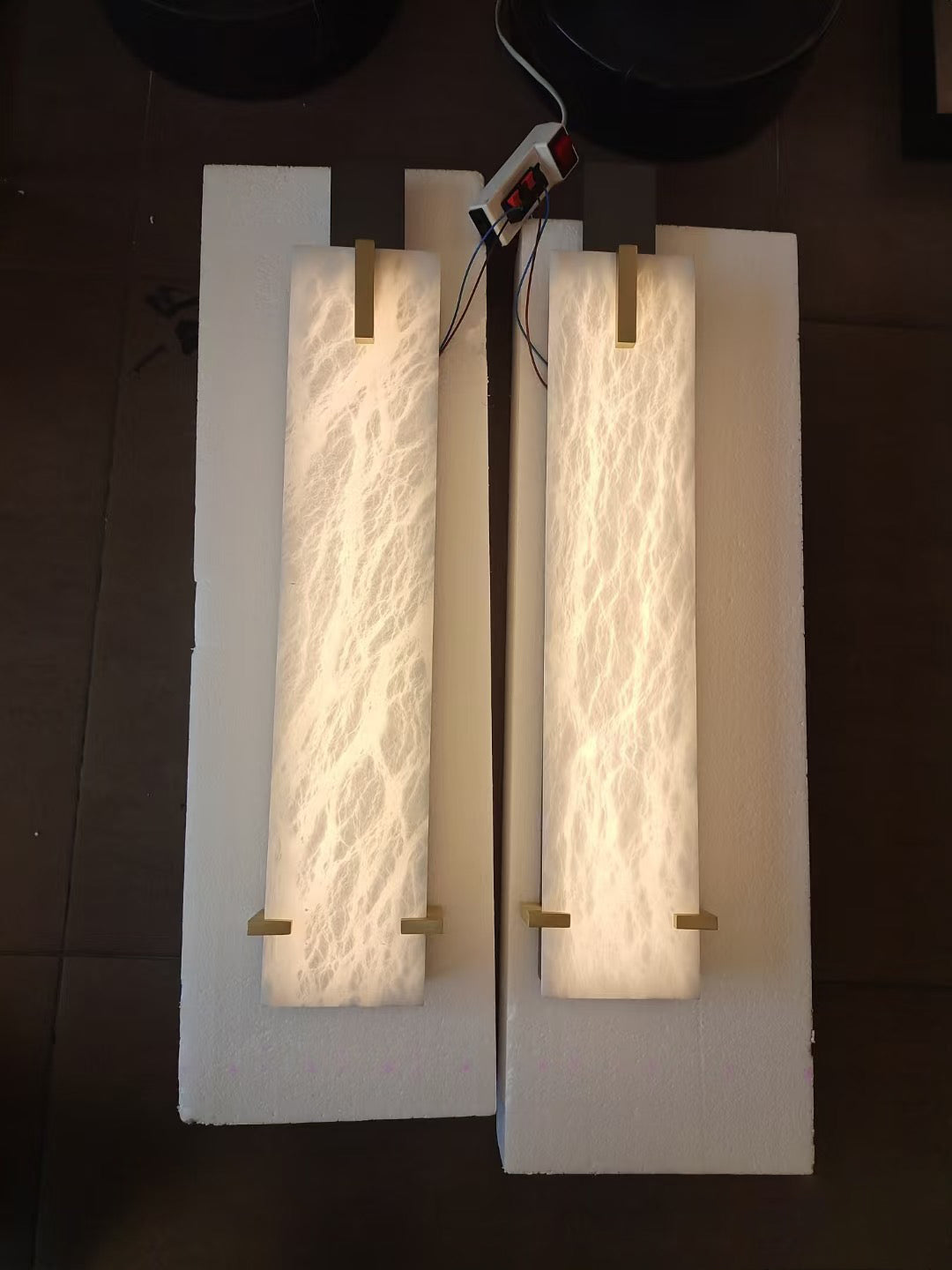 • Golden Hoop Alabaster Wall Sconce, a rectangular piece of alabaster seems to be gently embraced by a golden metal frame. The three sides of the exquisite gold edge set off the warm texture of alabaster. The addition of the black base adds a sense of mystery to the overall design. Three sizes are available, whether it is to embellish a small space or decorate a large area of the wall, it can easily create a noble and elegant atmosphere.