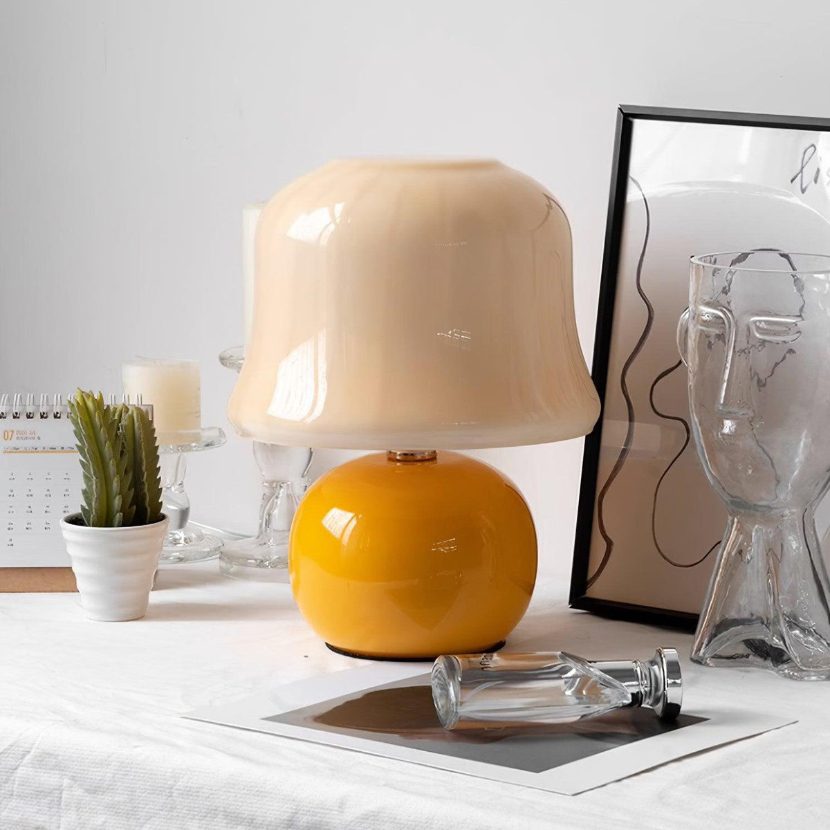 - The unique mushroom shape adds a touch of whimsy while exuding a sense of refined luxury. The soft glow from the glass lampshade creates an inviting atmosphere, making it ideal for accentuating living rooms, bedrooms, or home offices. Whether placed on a nightstand, side table, or as part of a decorative display, the Golom Mushroom Table Lamp enhances your space with its cozy yet fancy appeal.