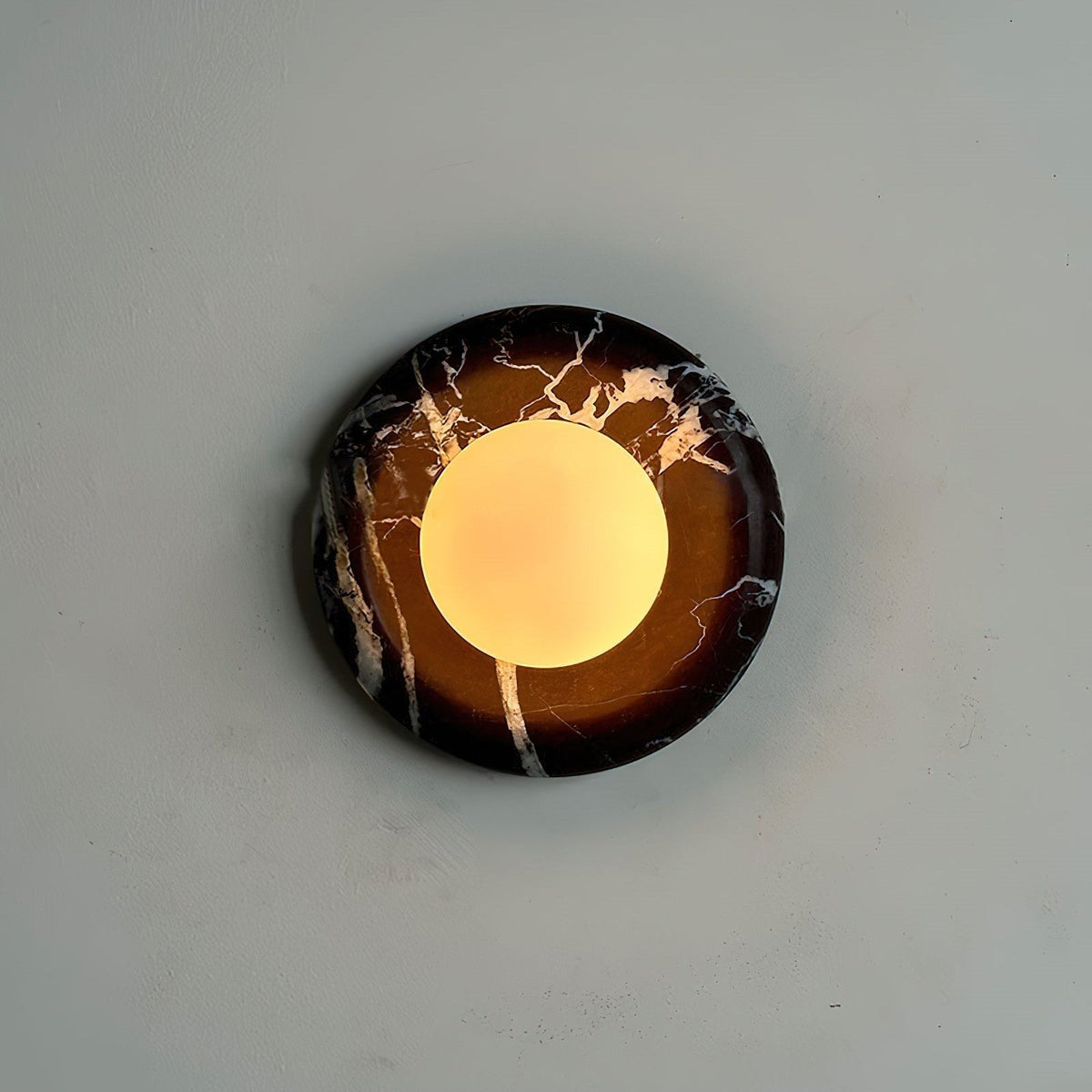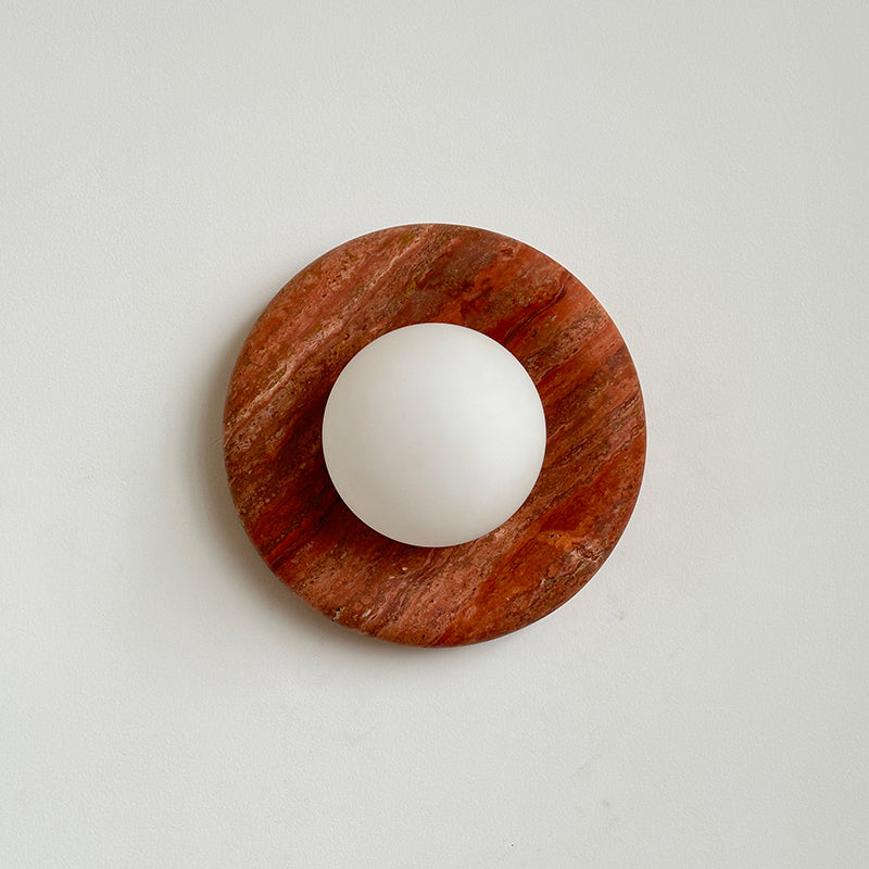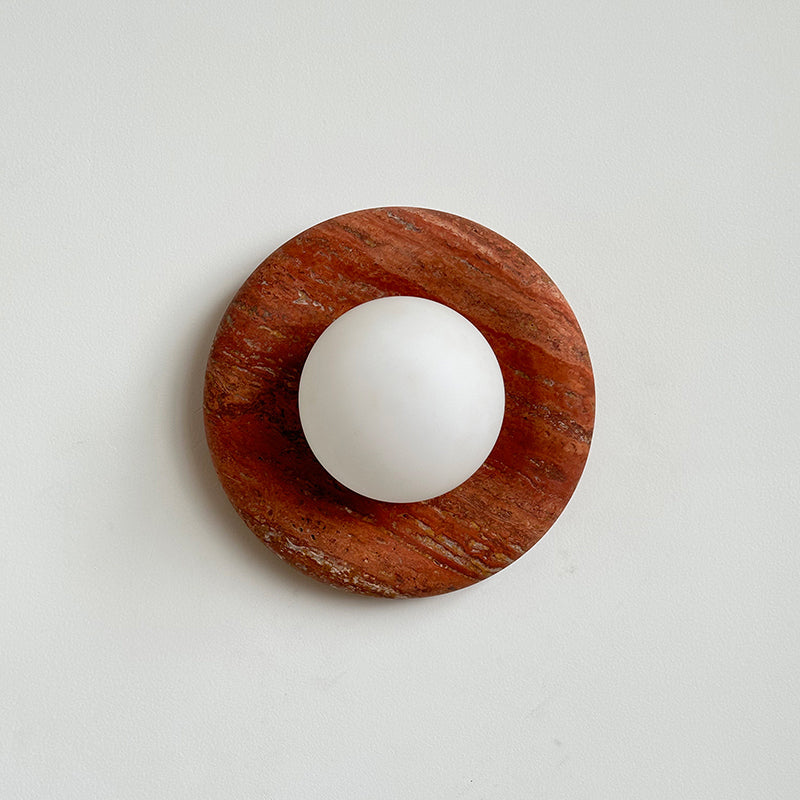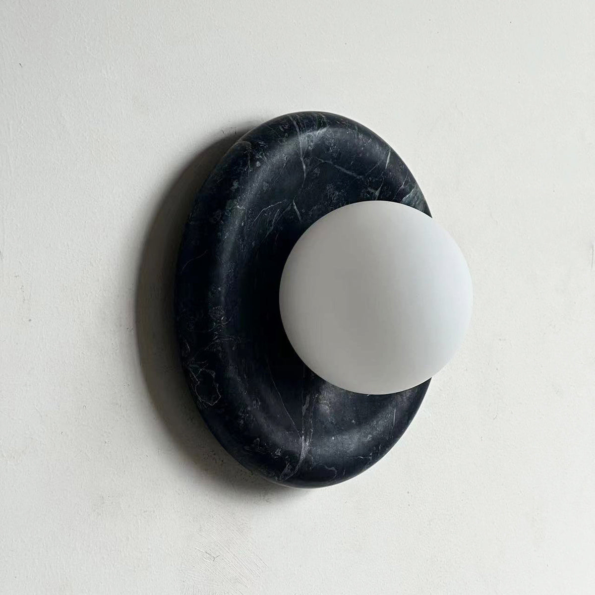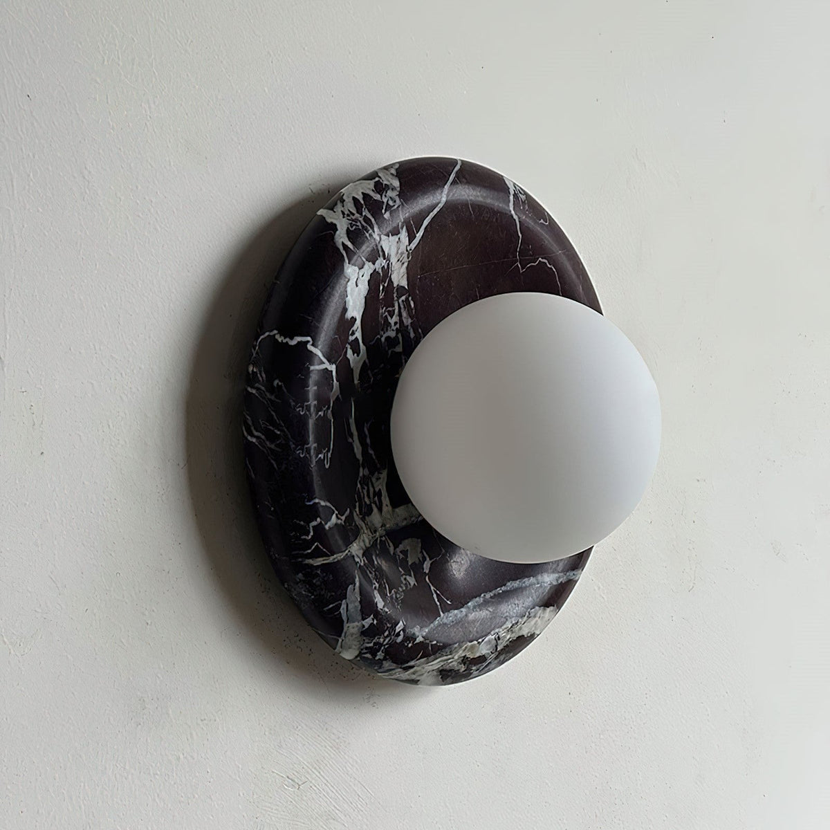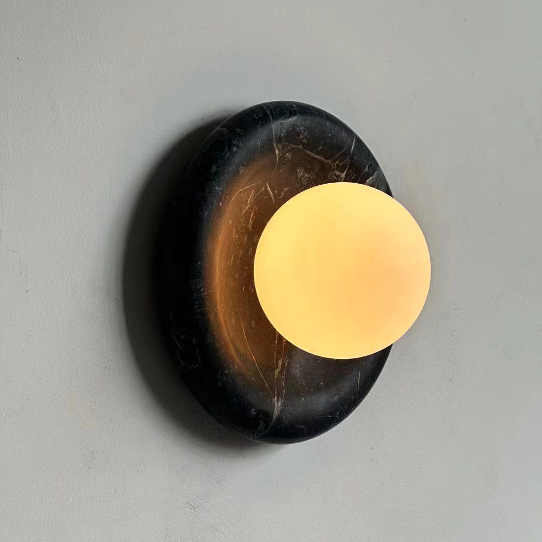 - Gravure Wall Sconce combines modern design with classic sophistication, featuring a perfectly round form that exudes harmony and balance. At its heart, a central glass globe emits a soft, diffused glow, creating a warm and inviting ambiance. The sconce is beautifully framed by a curved natural stone backplate, showcasing the natural veining and luxurious texture of natural stone for a touch of refined artistry.