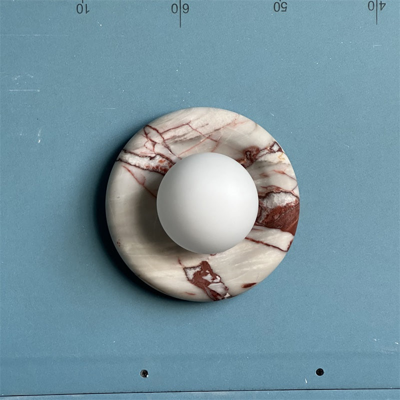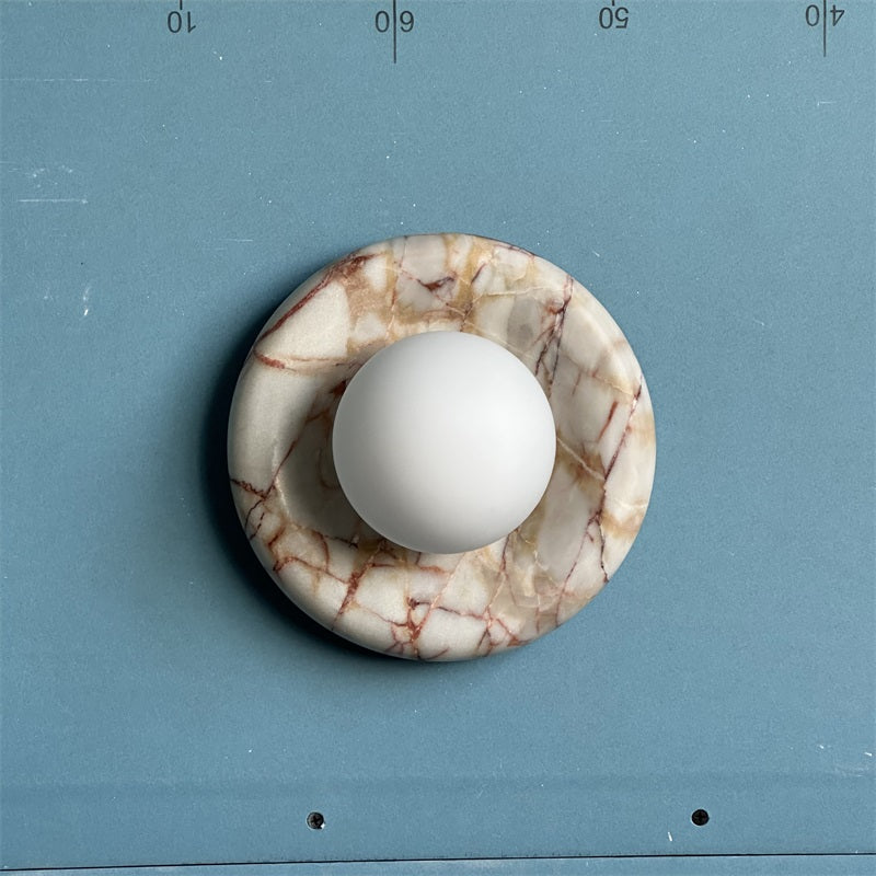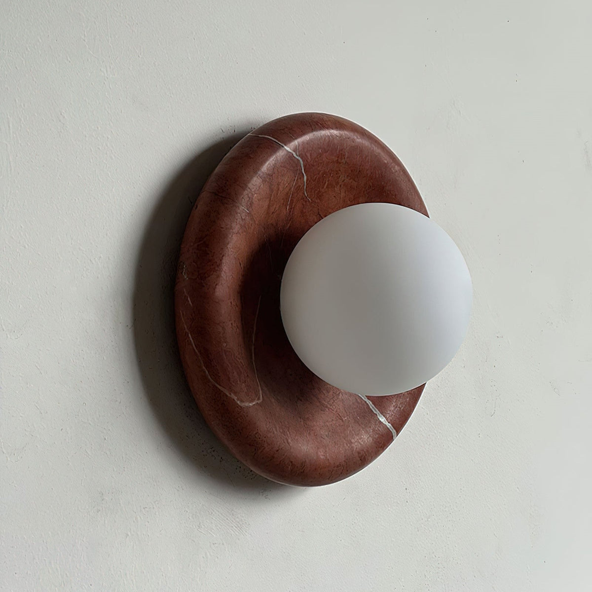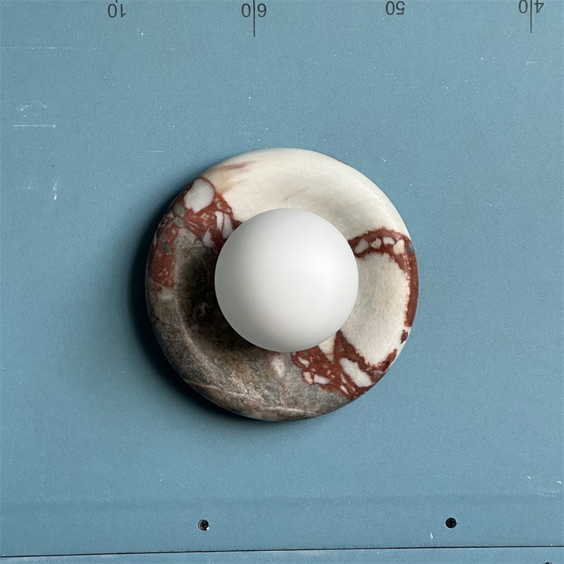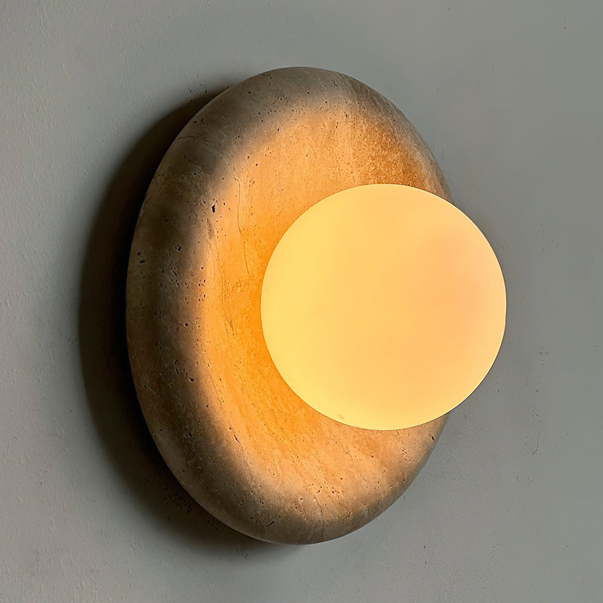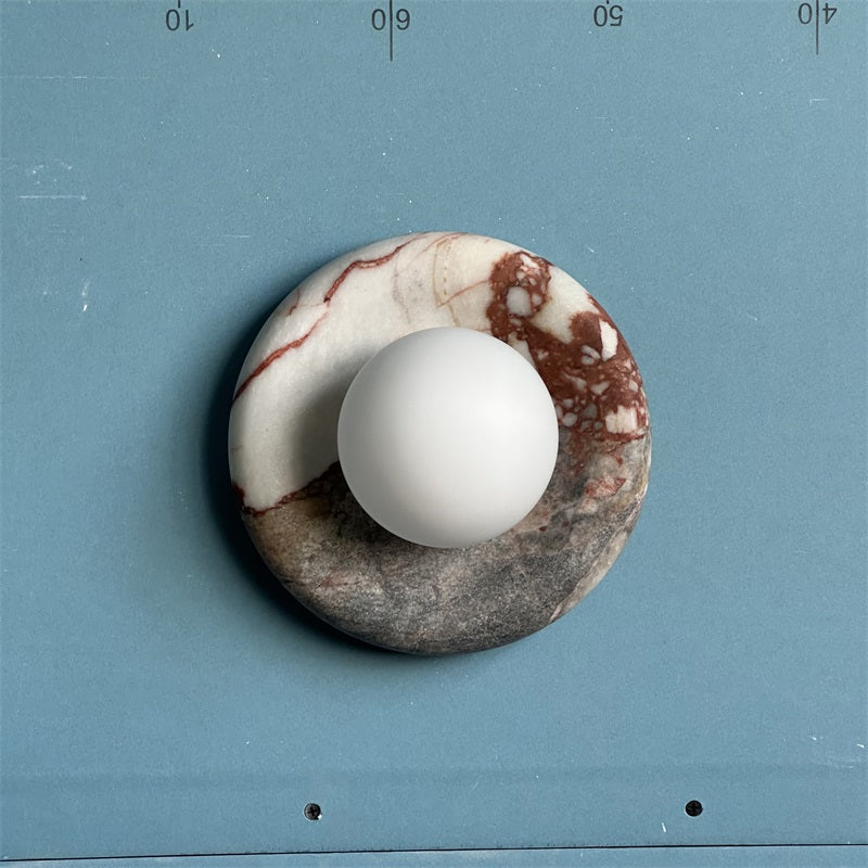 - Gravure Wall Sconce combines modern design with classic sophistication, featuring a perfectly round form that exudes harmony and balance. At its heart, a central glass globe emits a soft, diffused glow, creating a warm and inviting ambiance. The sconce is beautifully framed by a curved natural stone backplate, showcasing the natural veining and luxurious texture of natural stone for a touch of refined artistry.