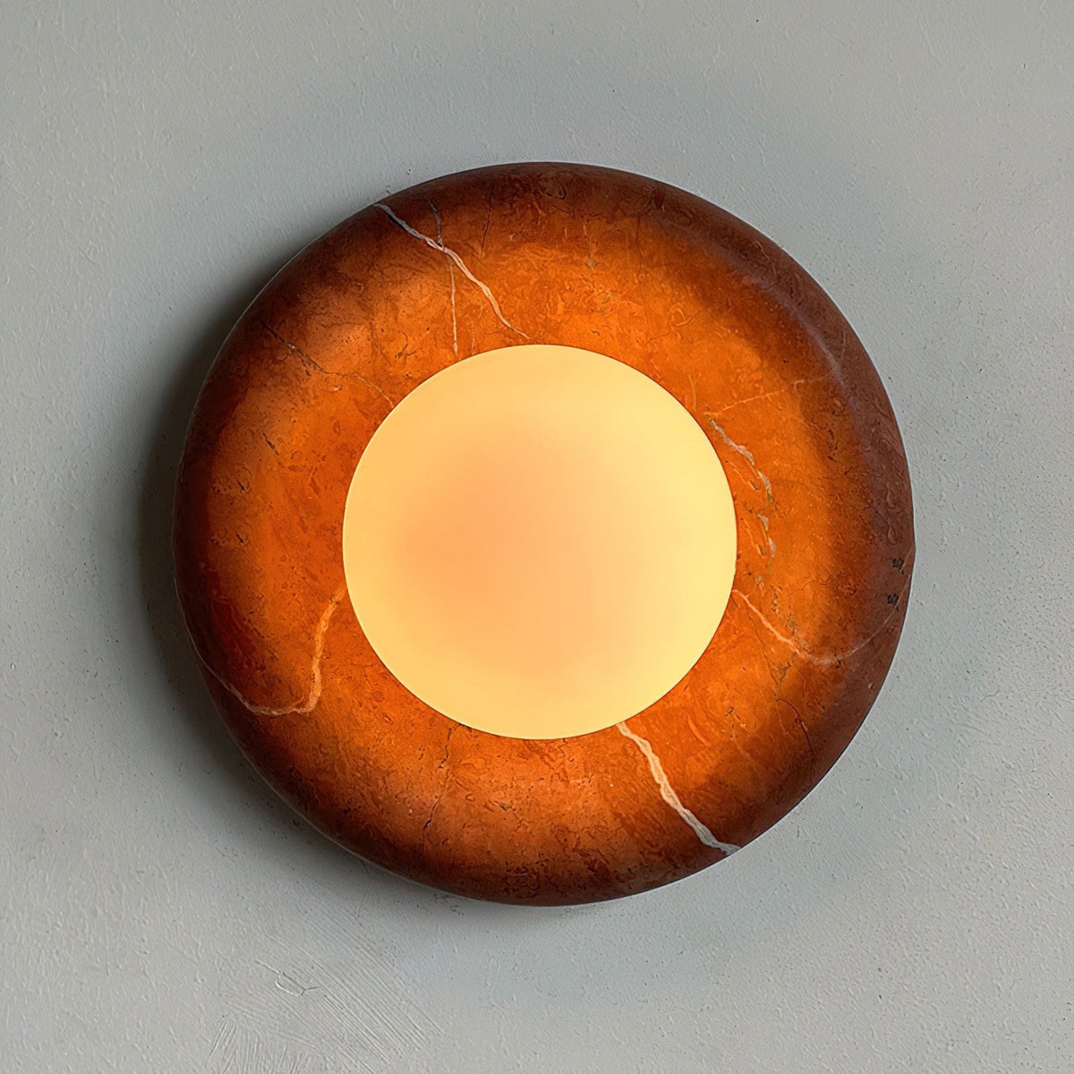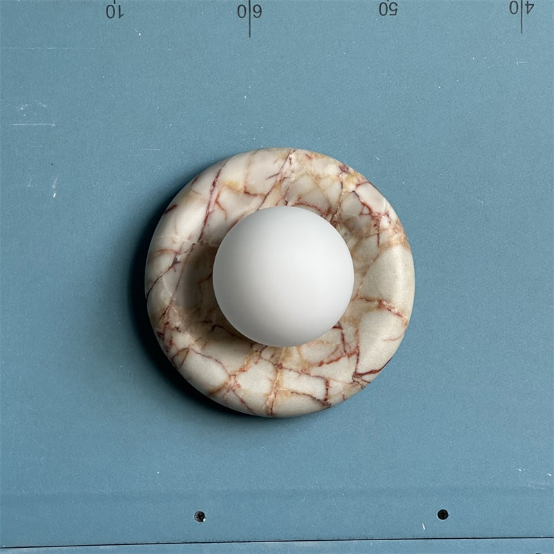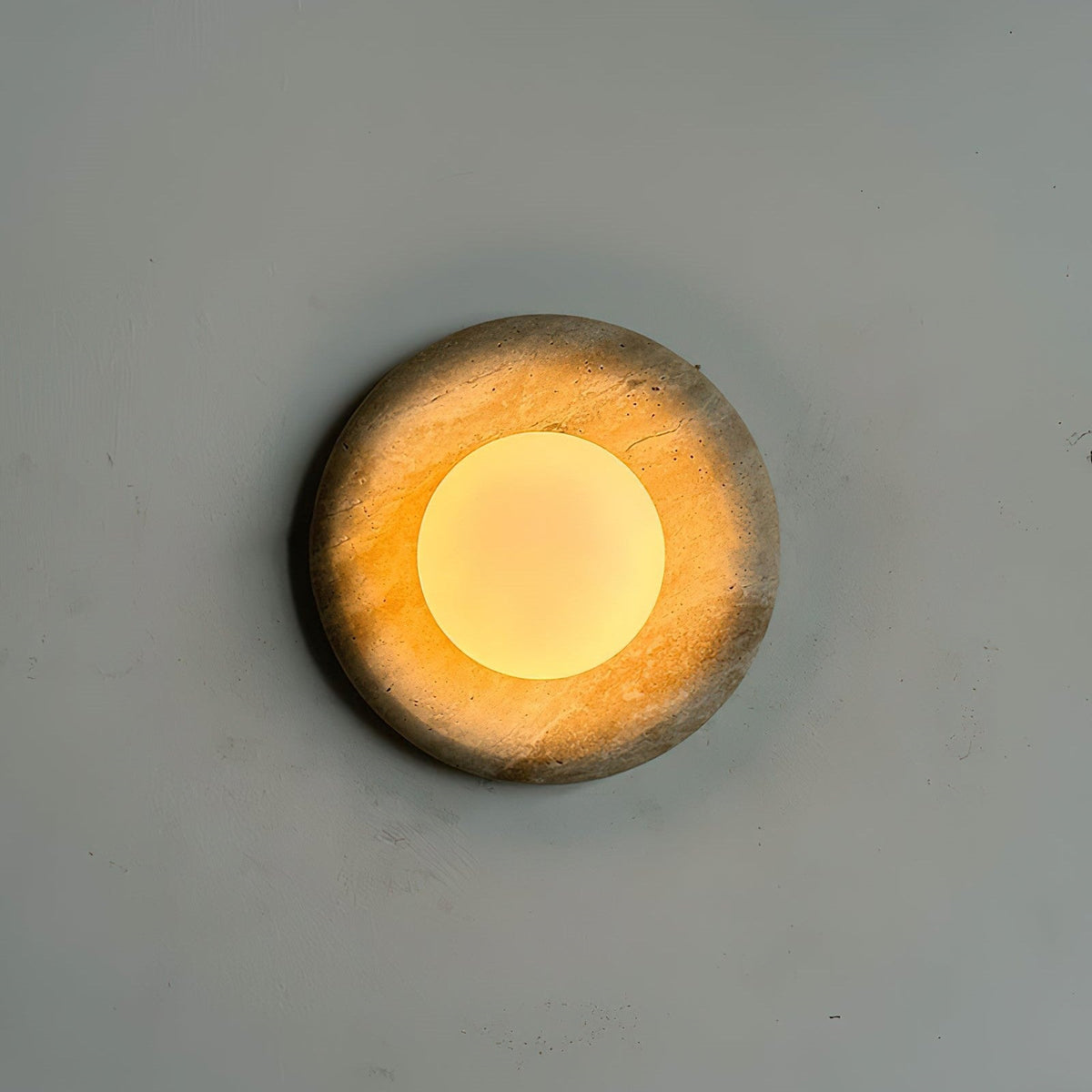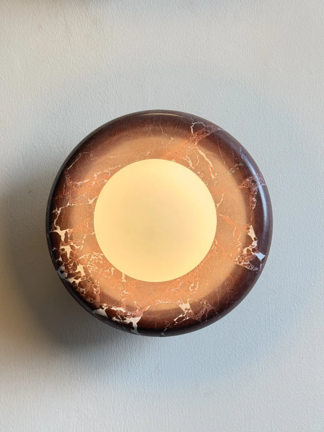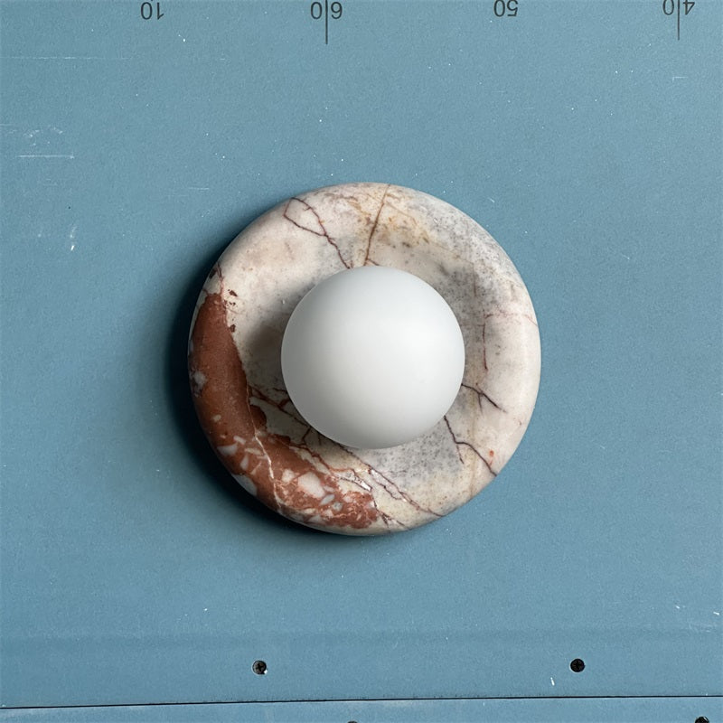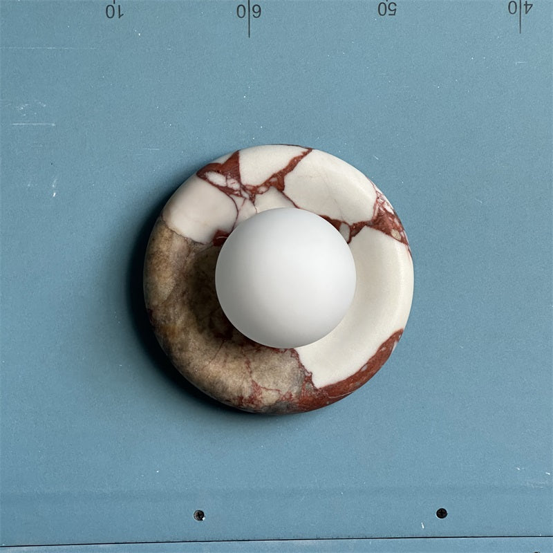 - Gravure Wall Sconce combines modern design with classic sophistication, featuring a perfectly round form that exudes harmony and balance. At its heart, a central glass globe emits a soft, diffused glow, creating a warm and inviting ambiance. The sconce is beautifully framed by a curved natural stone backplate, showcasing the natural veining and luxurious texture of natural stone for a touch of refined artistry.