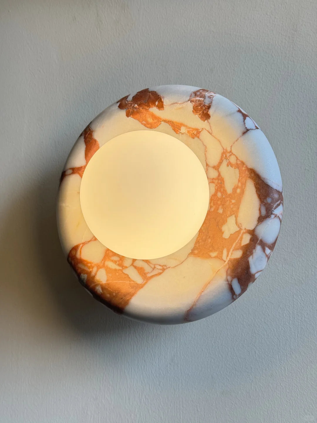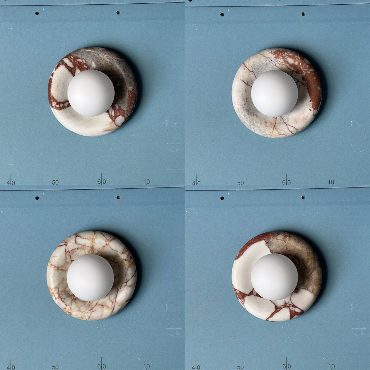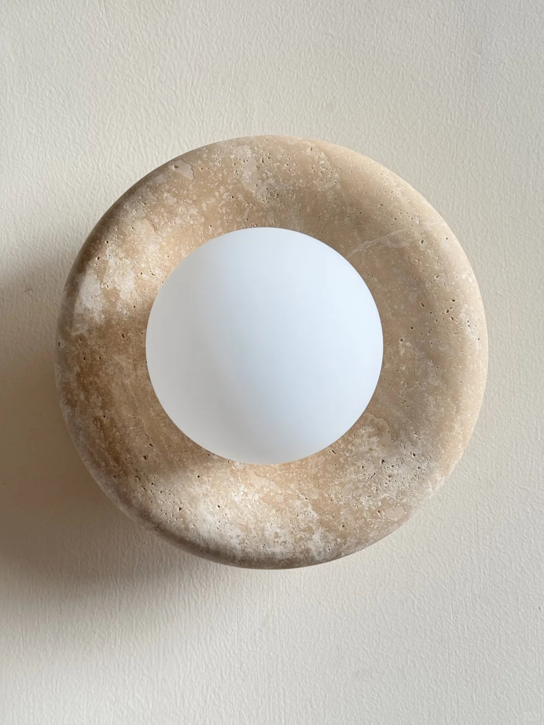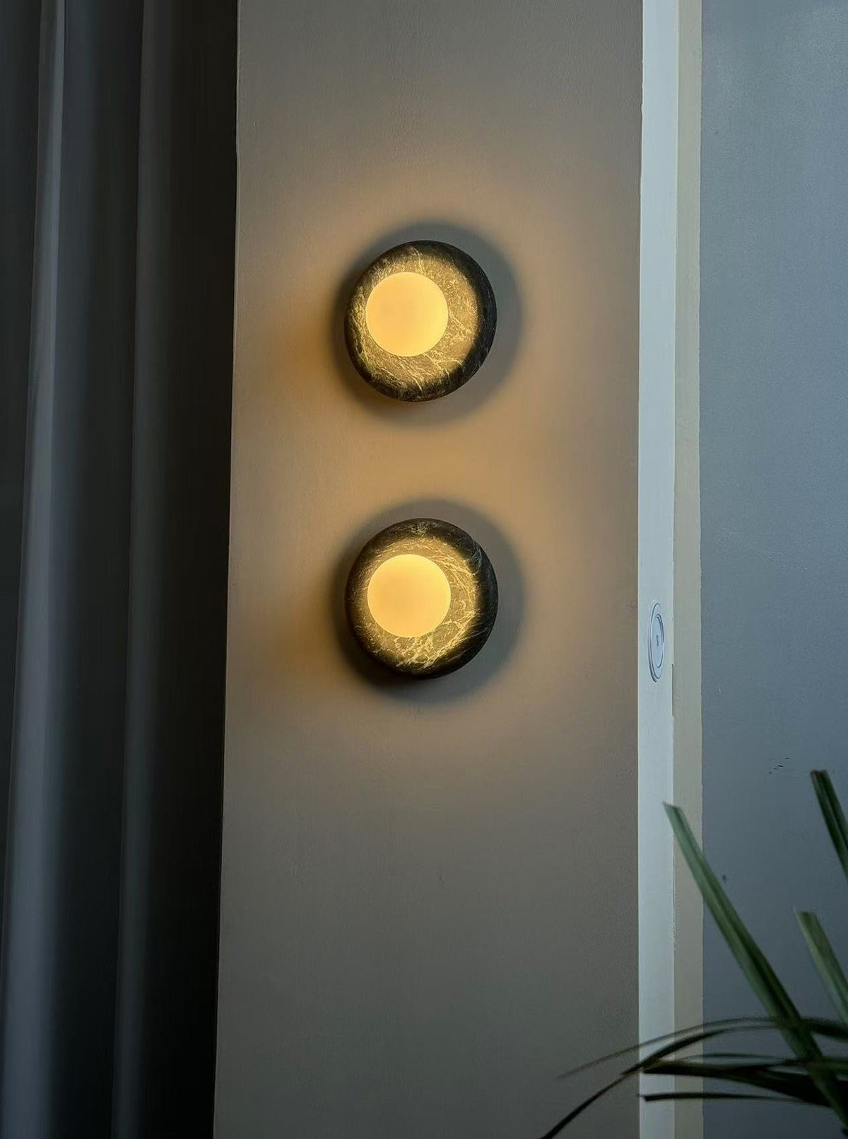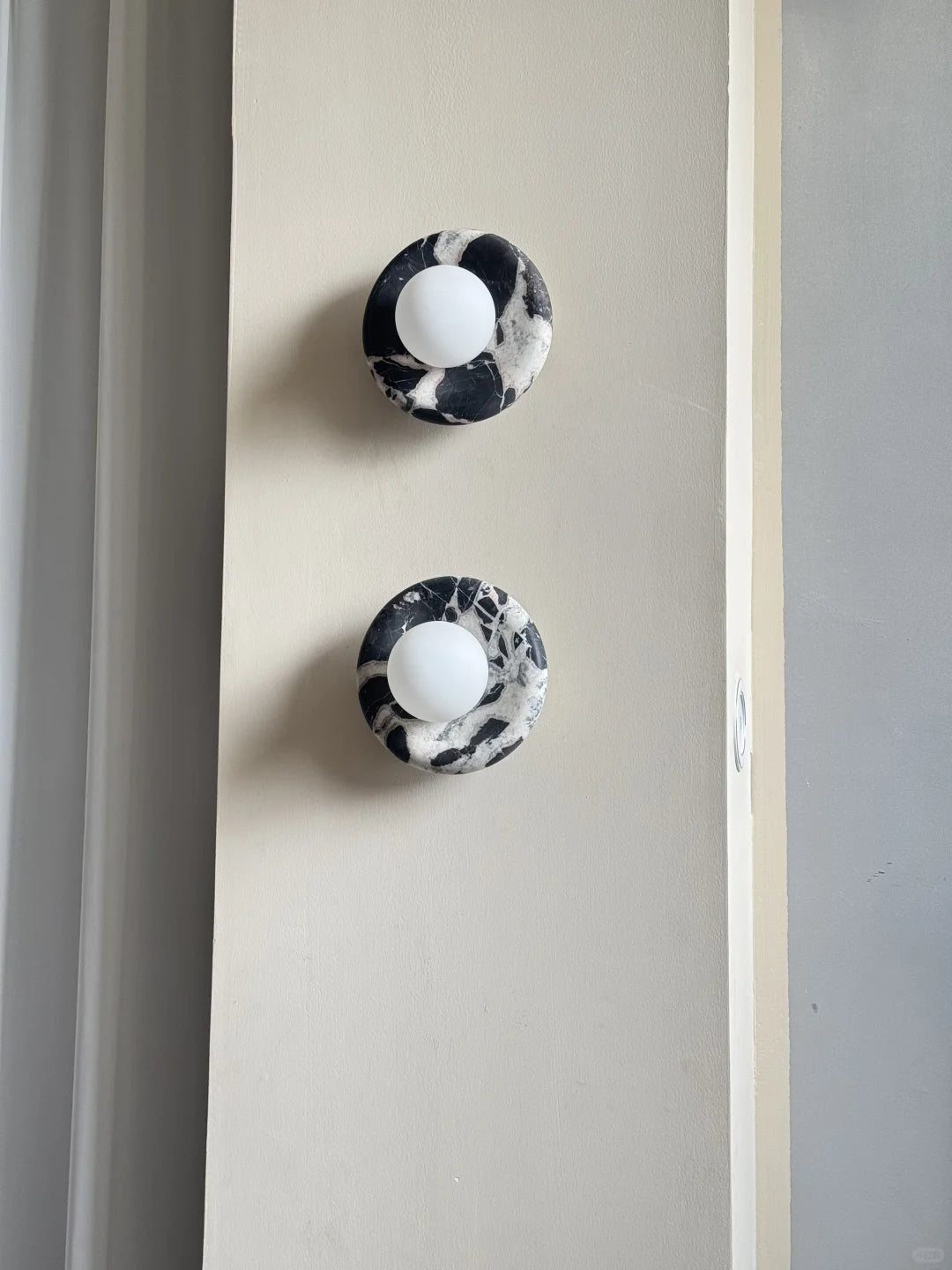 - Gravure Wall Sconce combines modern design with classic sophistication, featuring a perfectly round form that exudes harmony and balance. At its heart, a central glass globe emits a soft, diffused glow, creating a warm and inviting ambiance. The sconce is beautifully framed by a curved natural stone backplate, showcasing the natural veining and luxurious texture of natural stone for a touch of refined artistry.