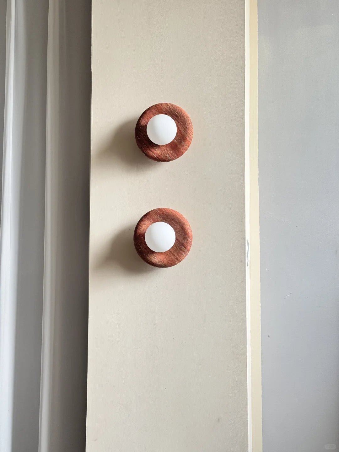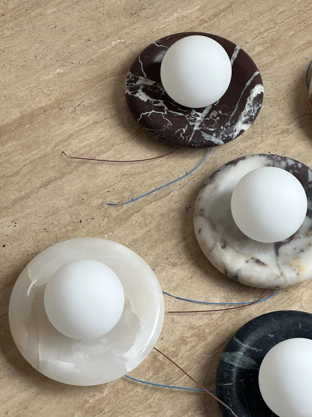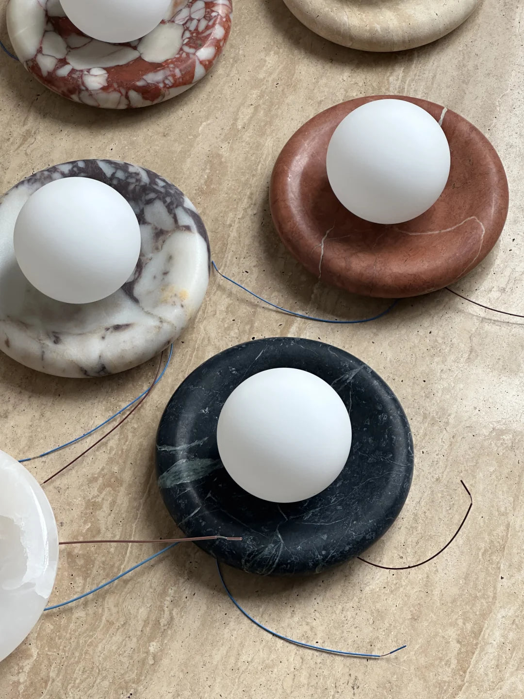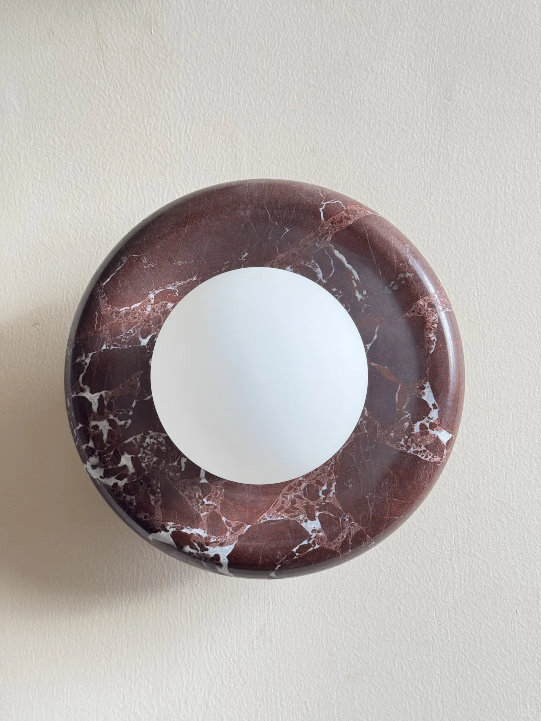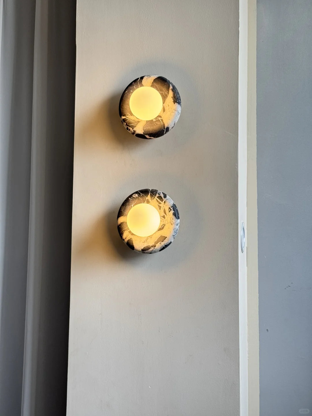 - Gravure Wall Sconce combines modern design with classic sophistication, featuring a perfectly round form that exudes harmony and balance. At its heart, a central glass globe emits a soft, diffused glow, creating a warm and inviting ambiance. The sconce is beautifully framed by a curved natural stone backplate, showcasing the natural veining and luxurious texture of natural stone for a touch of refined artistry.
