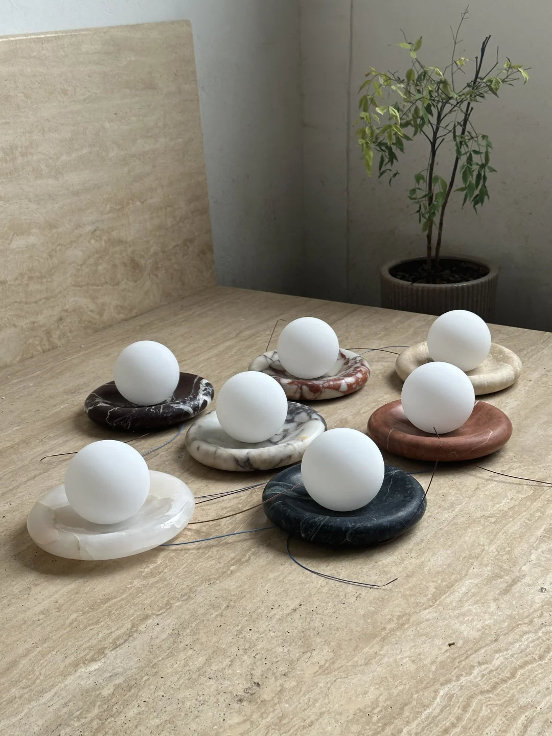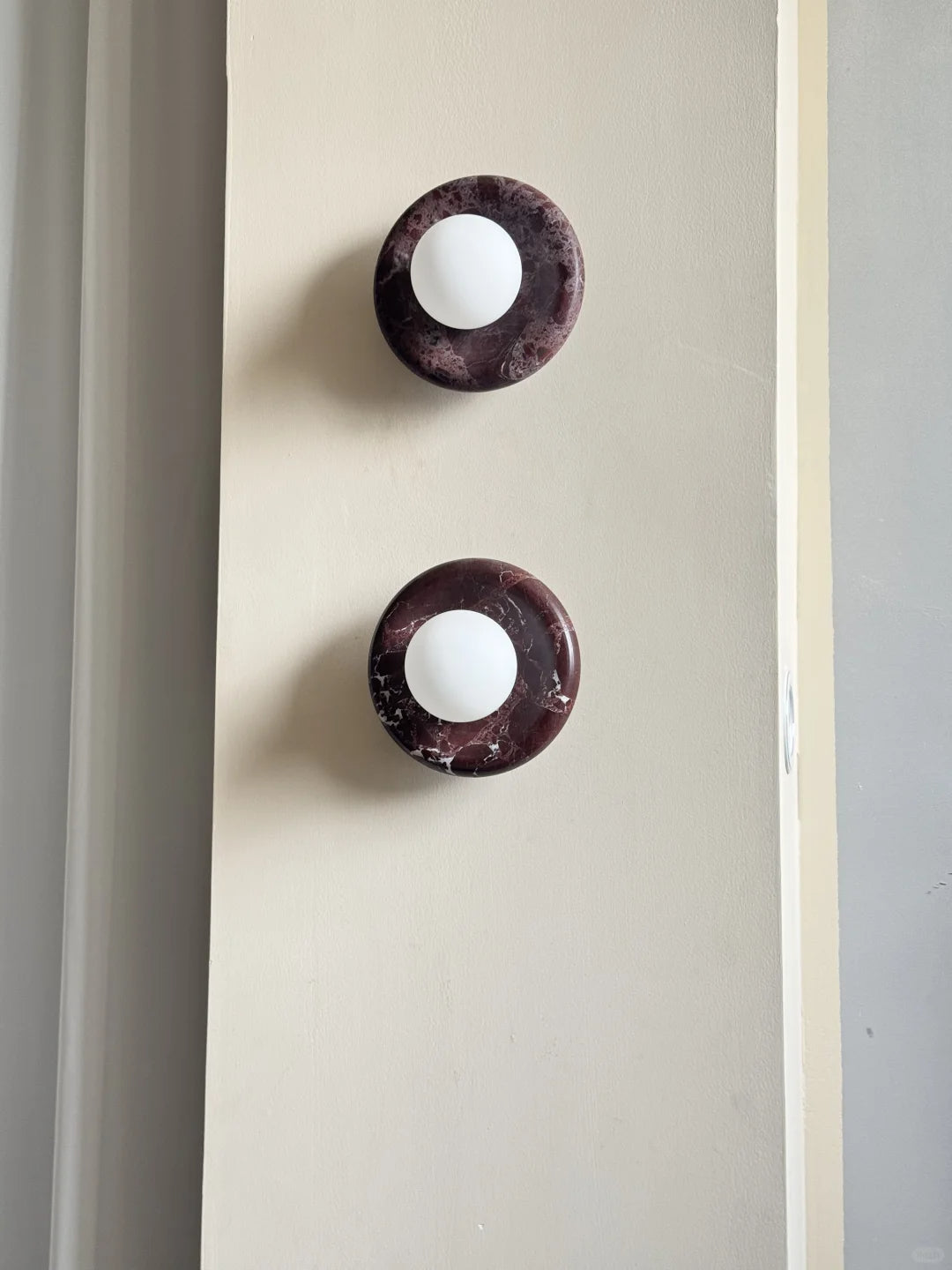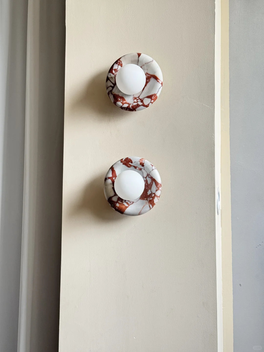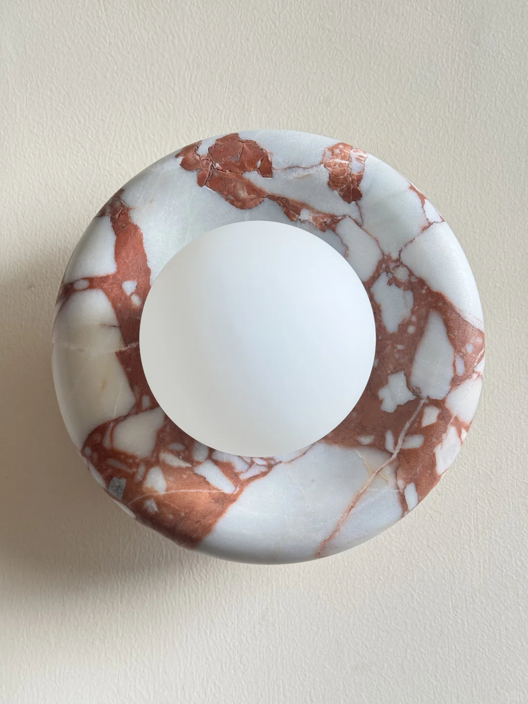 - Gravure Wall Sconce combines modern design with classic sophistication, featuring a perfectly round form that exudes harmony and balance. At its heart, a central glass globe emits a soft, diffused glow, creating a warm and inviting ambiance. The sconce is beautifully framed by a curved natural stone backplate, showcasing the natural veining and luxurious texture of natural stone for a touch of refined artistry.