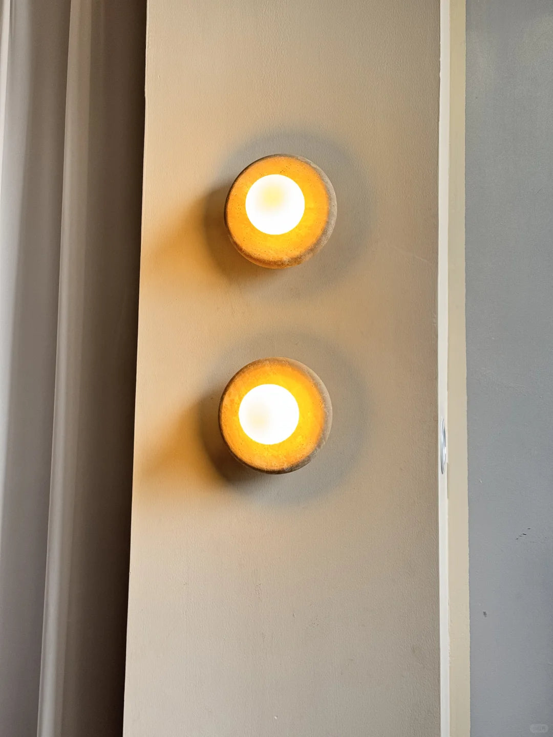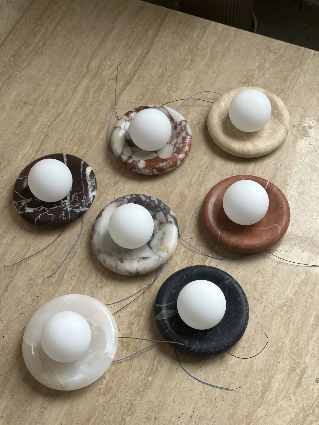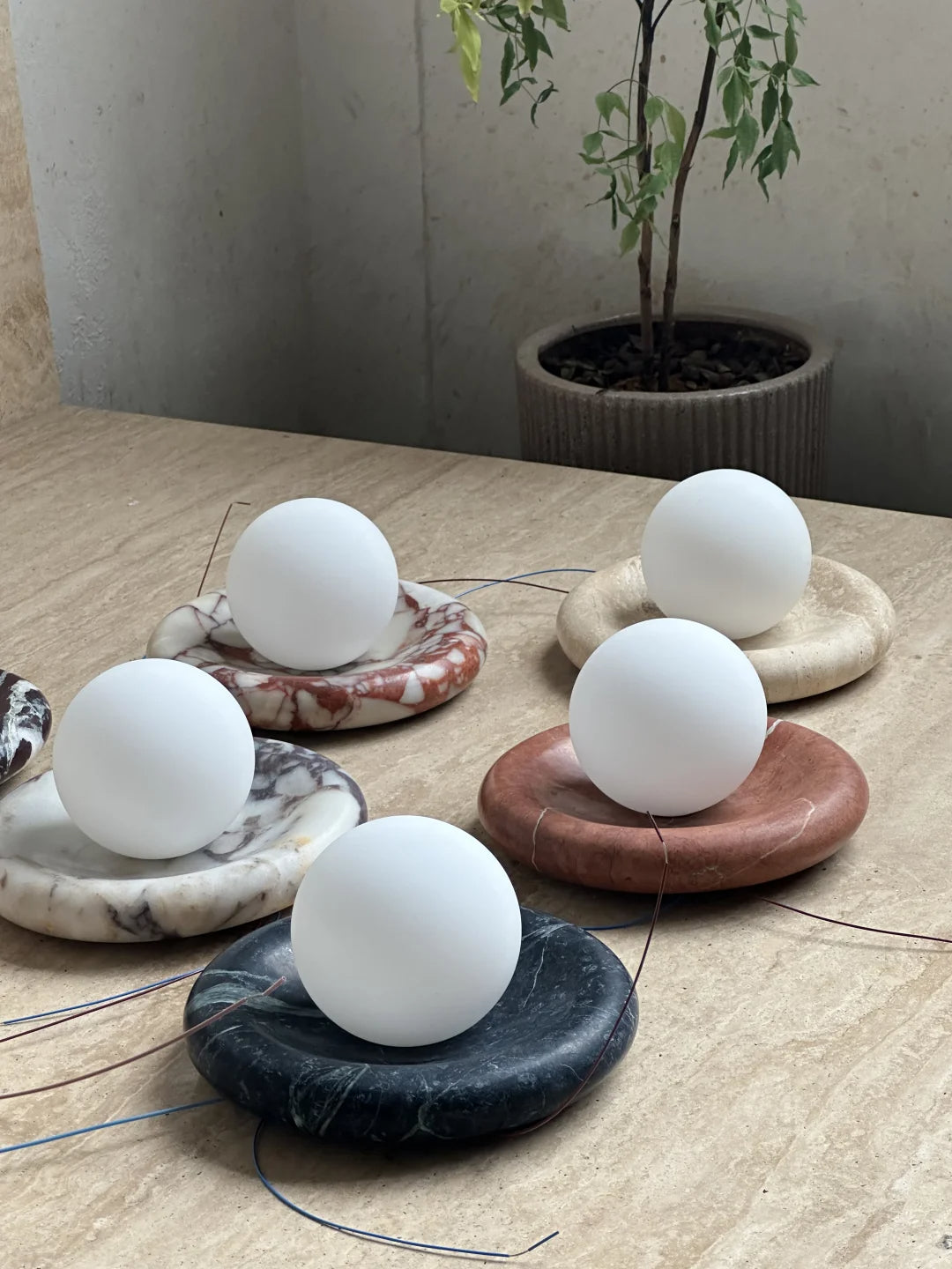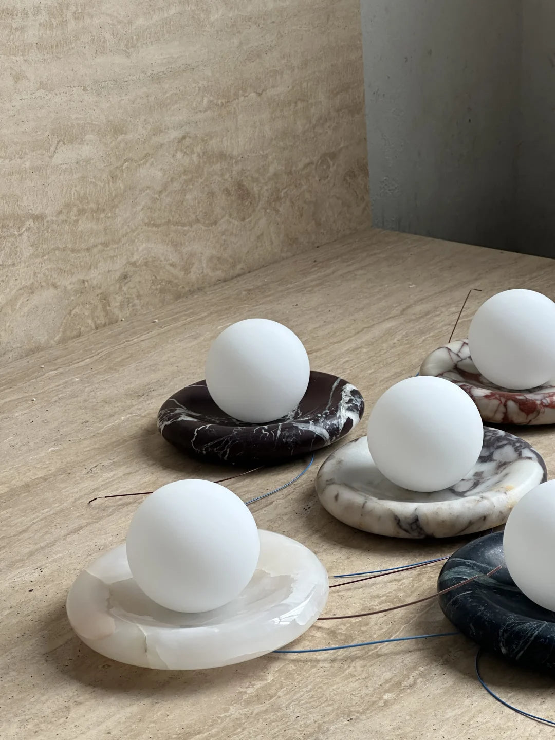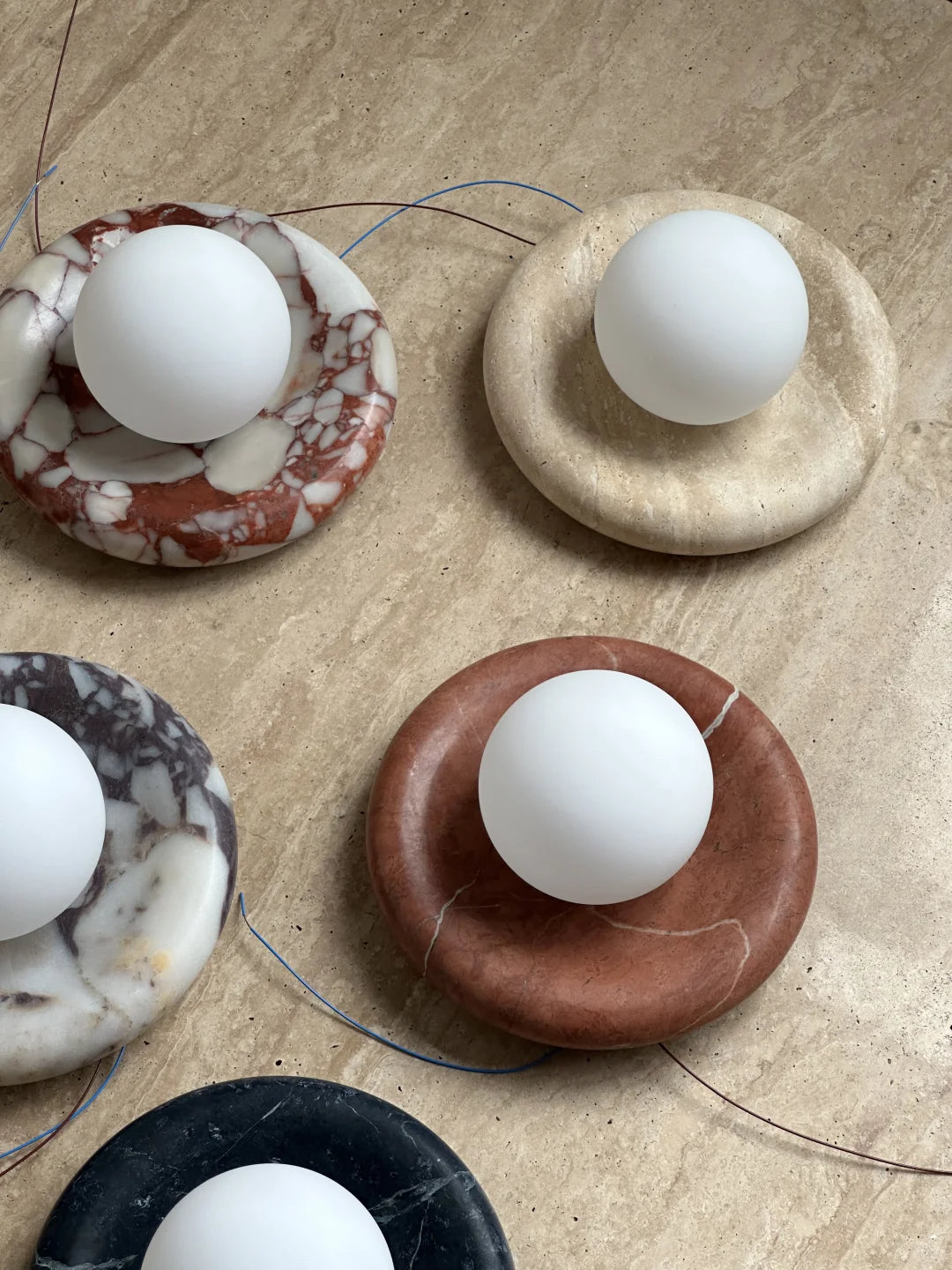 - Gravure Wall Sconce combines modern design with classic sophistication, featuring a perfectly round form that exudes harmony and balance. At its heart, a central glass globe emits a soft, diffused glow, creating a warm and inviting ambiance. The sconce is beautifully framed by a curved natural stone backplate, showcasing the natural veining and luxurious texture of natural stone for a touch of refined artistry.