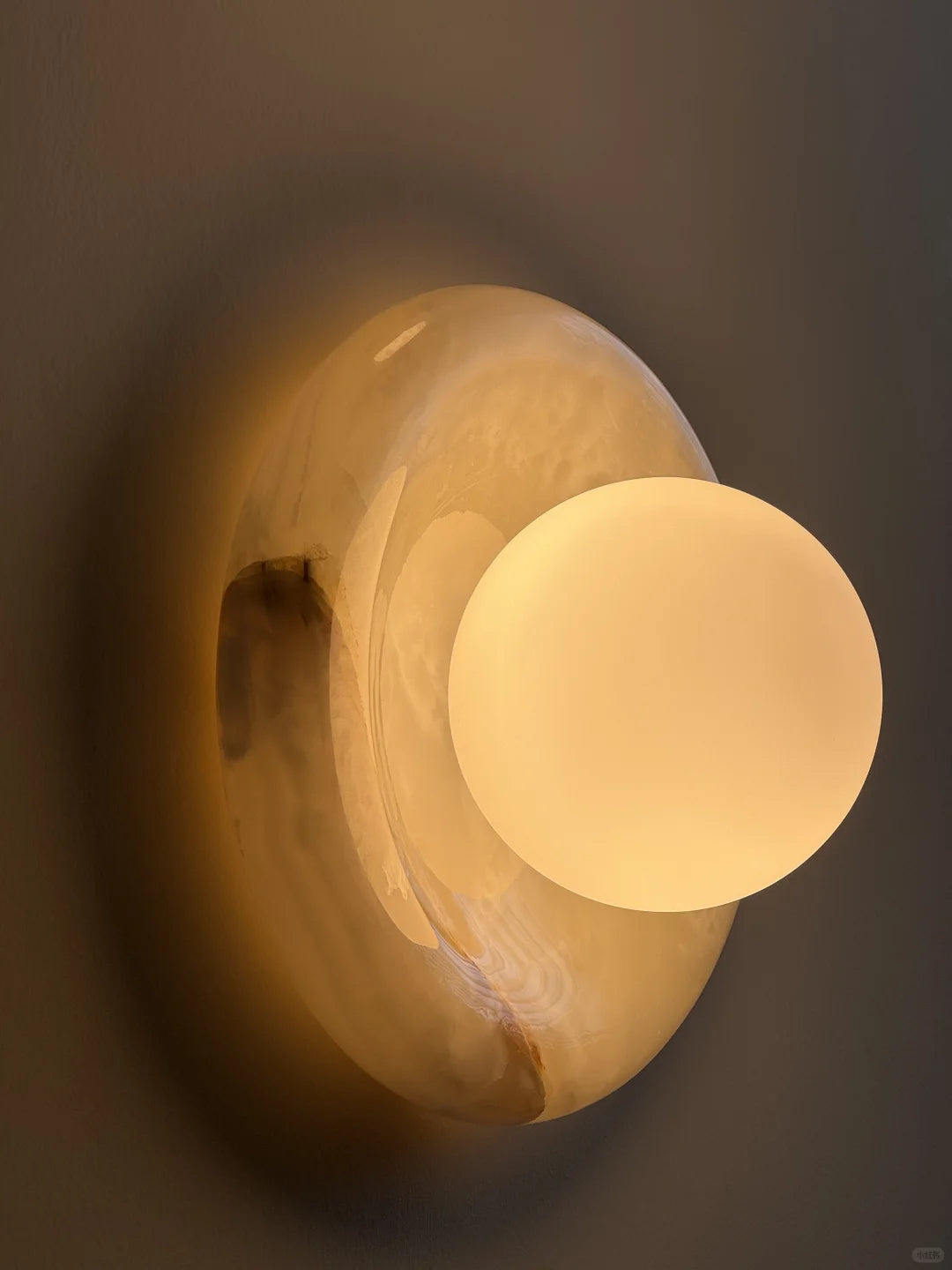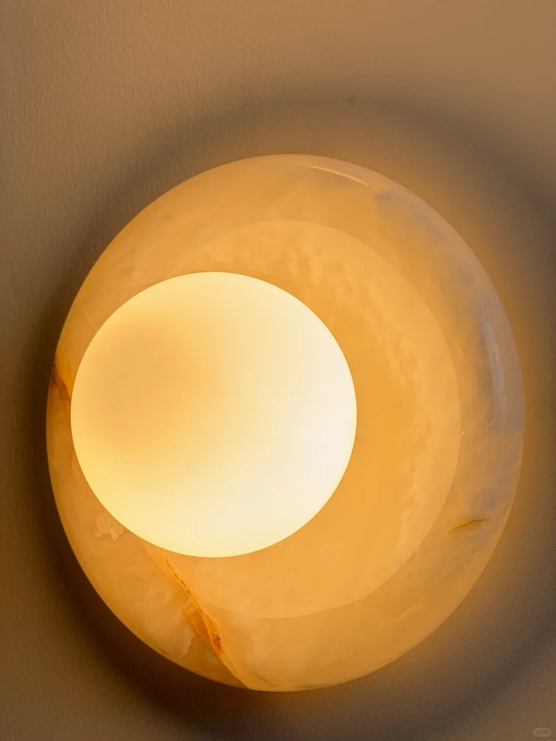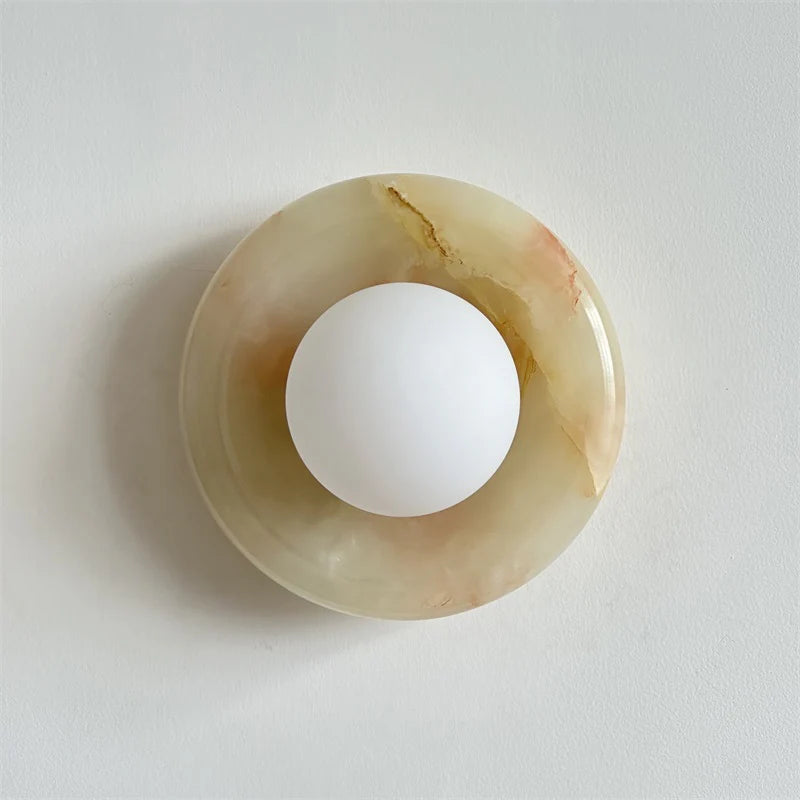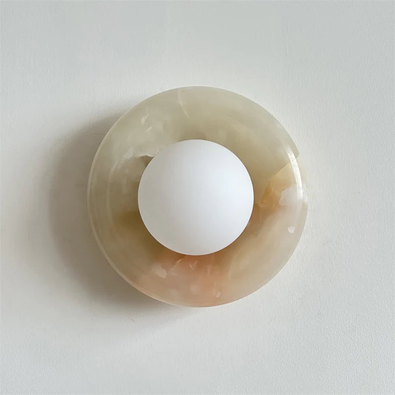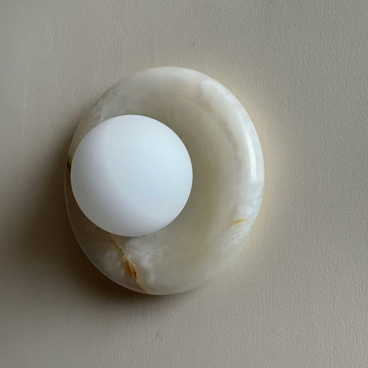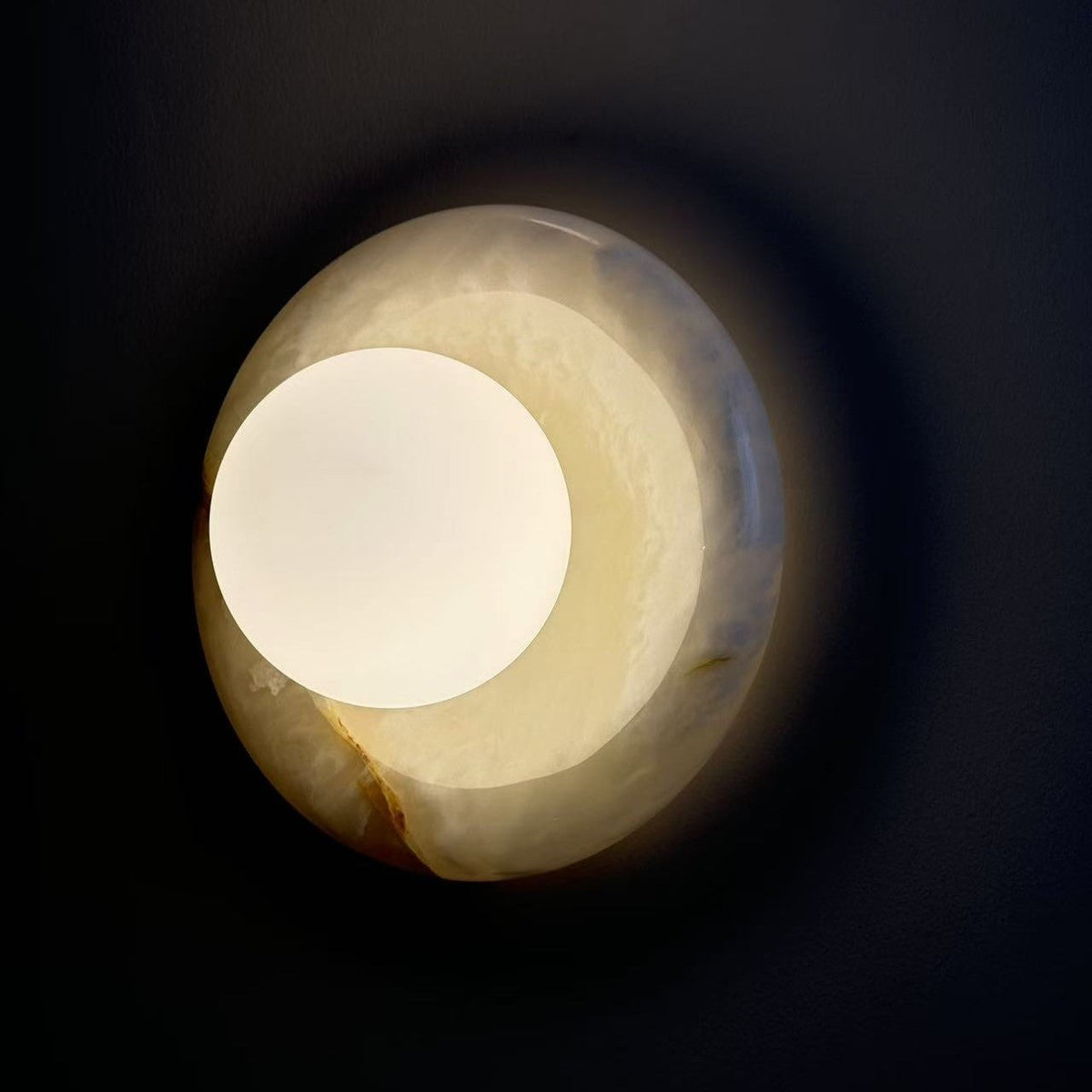 - Gravure Onyx Sconce combines modern design with classic sophistication, featuring a perfectly round form that exudes harmony and balance. At its heart, a central glass globe emits a soft, diffused glow, creating a warm and inviting ambiance. The sconce is beautifully framed by a curved natural stone backplate, showcasing the natural veining and luxurious texture of natural stone for a touch of refined artistry.