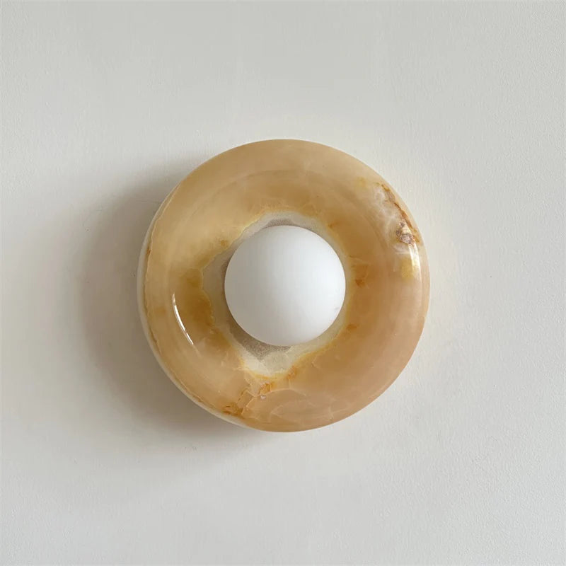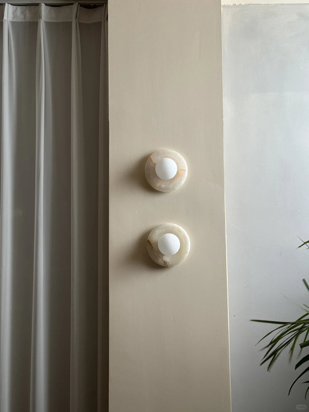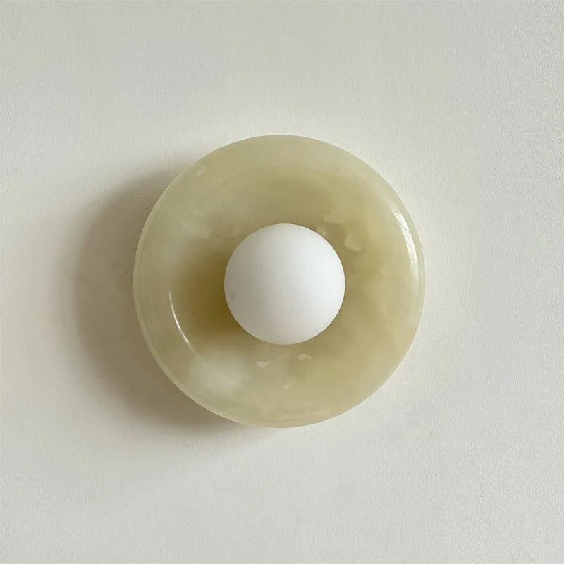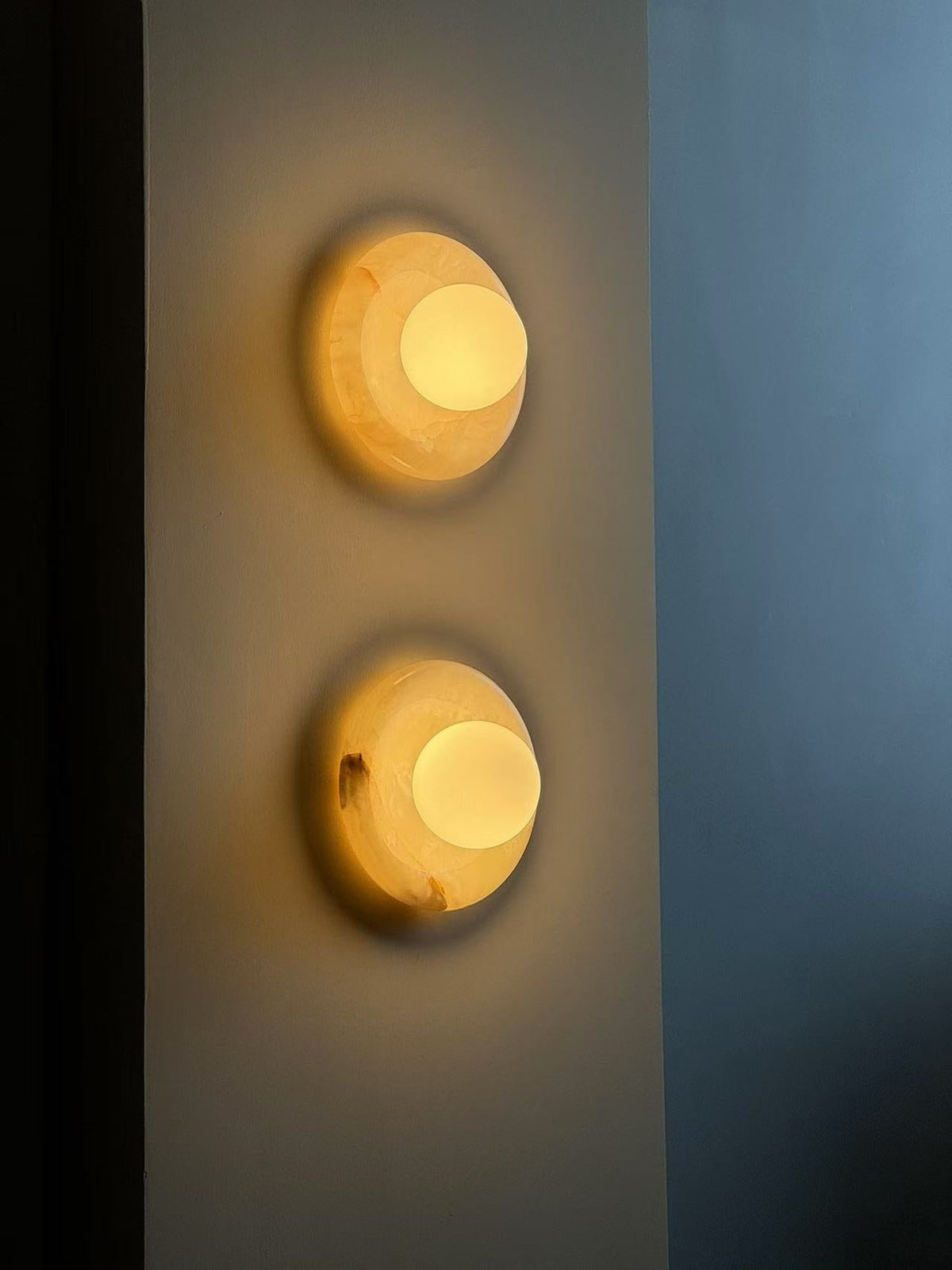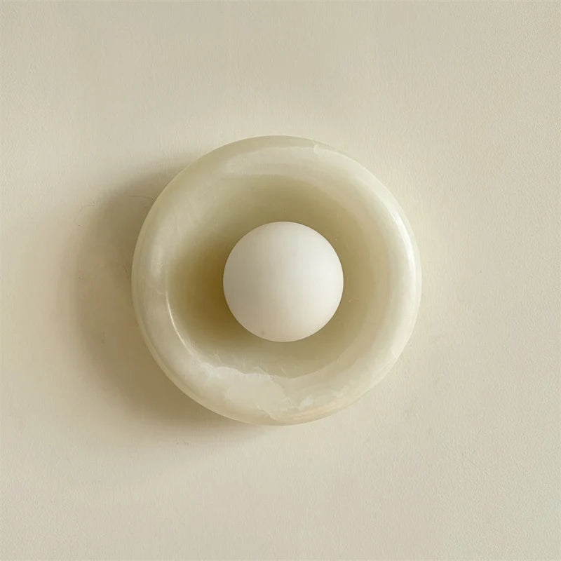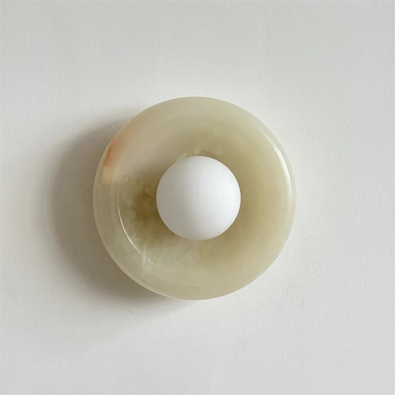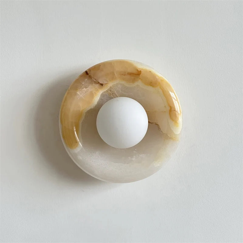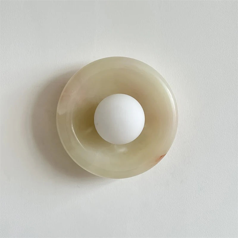 - Gravure Onyx Sconce combines modern design with classic sophistication, featuring a perfectly round form that exudes harmony and balance. At its heart, a central glass globe emits a soft, diffused glow, creating a warm and inviting ambiance. The sconce is beautifully framed by a curved natural stone backplate, showcasing the natural veining and luxurious texture of natural stone for a touch of refined artistry.