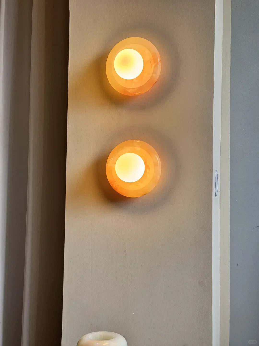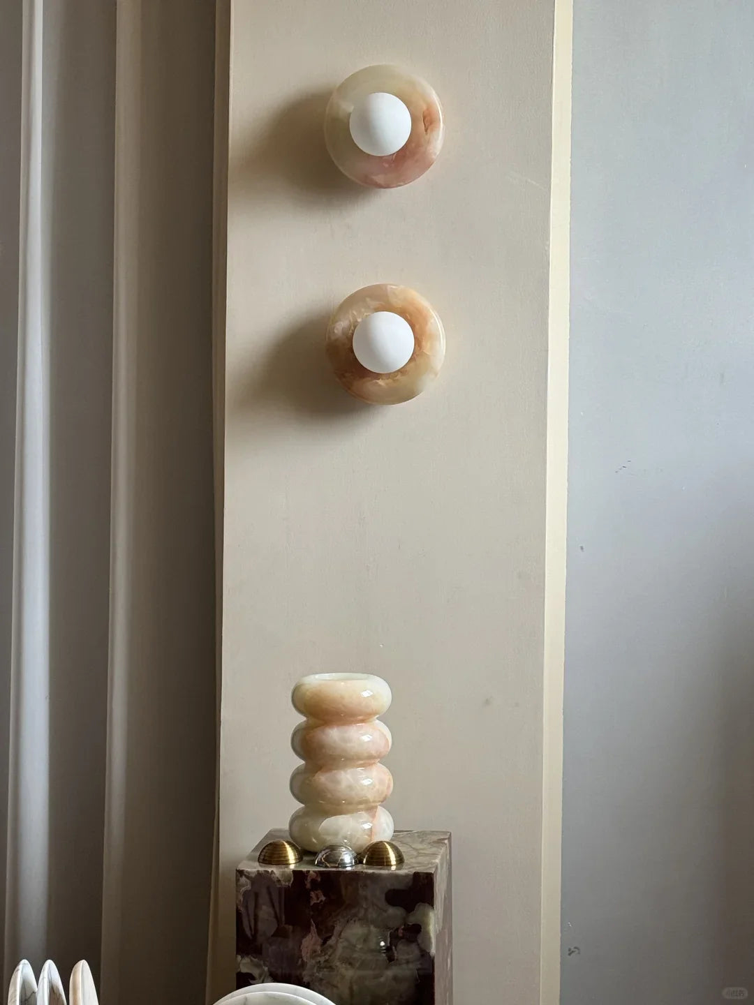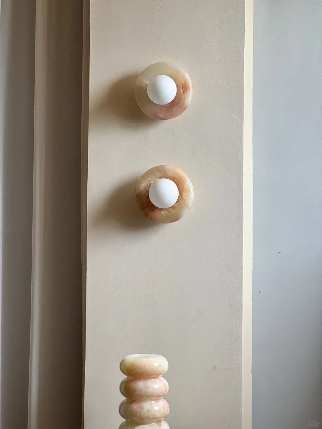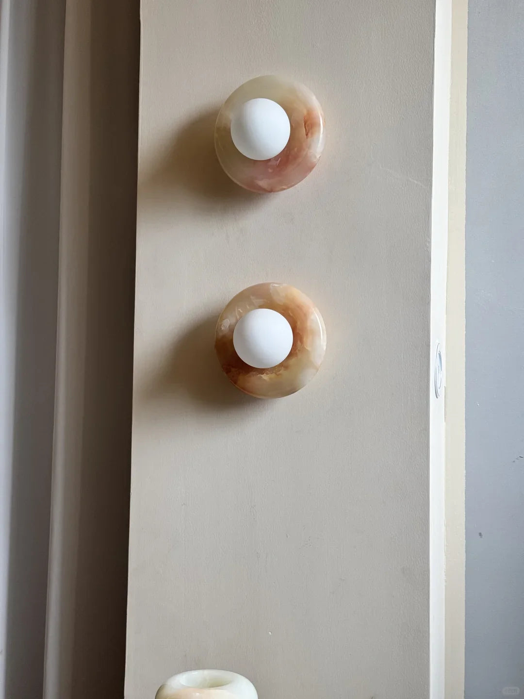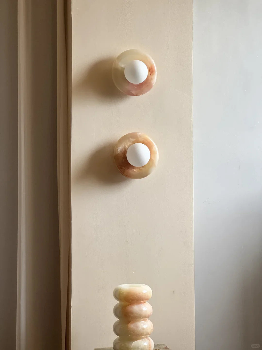 - Gravure Onyx Sconce combines modern design with classic sophistication, featuring a perfectly round form that exudes harmony and balance. At its heart, a central glass globe emits a soft, diffused glow, creating a warm and inviting ambiance. The sconce is beautifully framed by a curved natural stone backplate, showcasing the natural veining and luxurious texture of natural stone for a touch of refined artistry.
