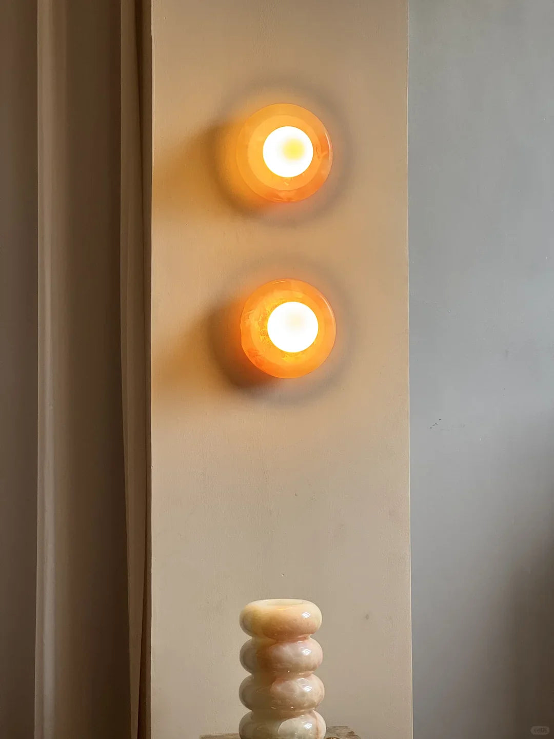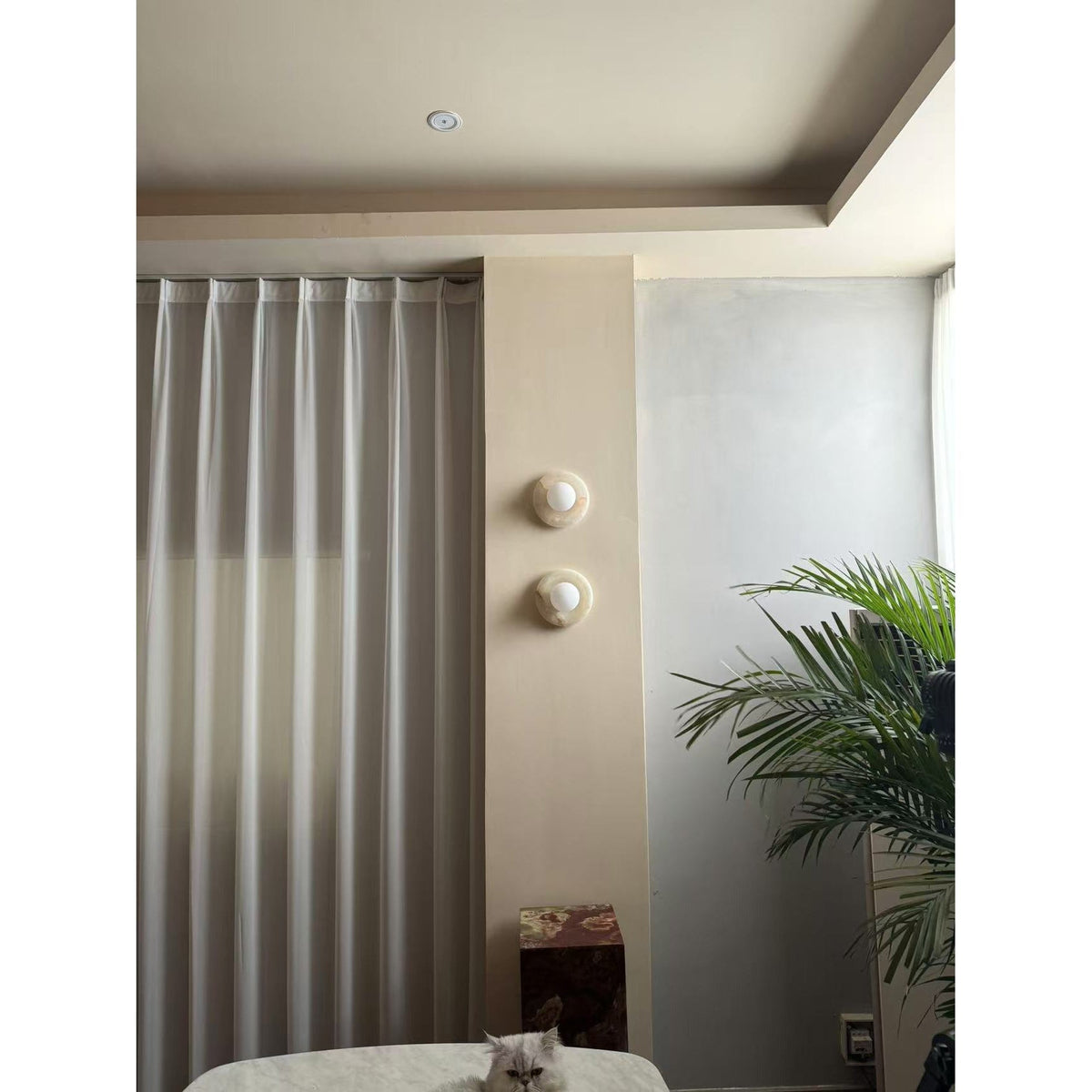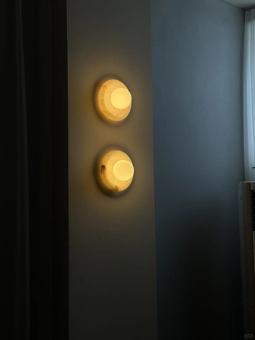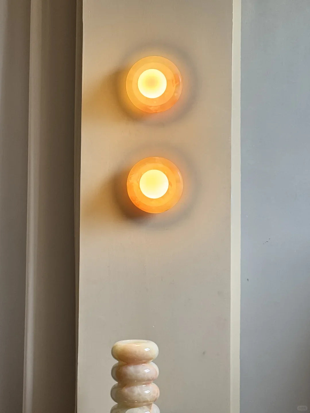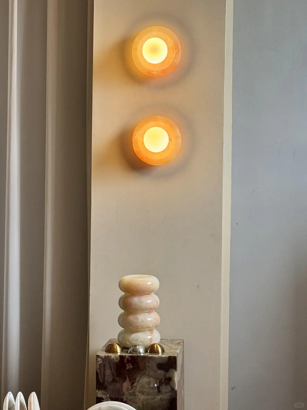 - Gravure Onyx Sconce combines modern design with classic sophistication, featuring a perfectly round form that exudes harmony and balance. At its heart, a central glass globe emits a soft, diffused glow, creating a warm and inviting ambiance. The sconce is beautifully framed by a curved natural stone backplate, showcasing the natural veining and luxurious texture of natural stone for a touch of refined artistry.