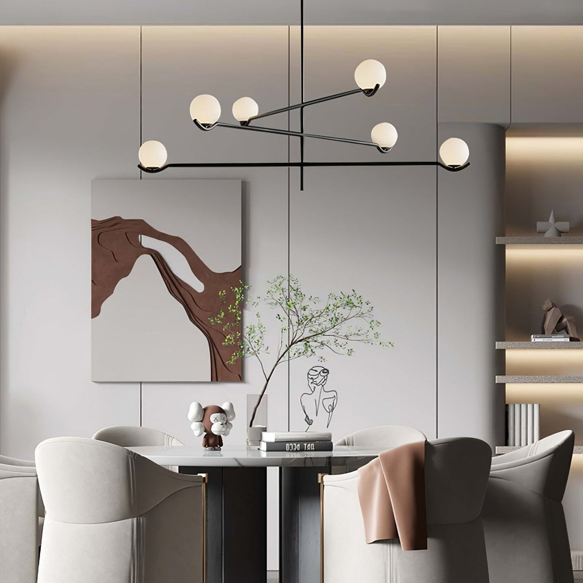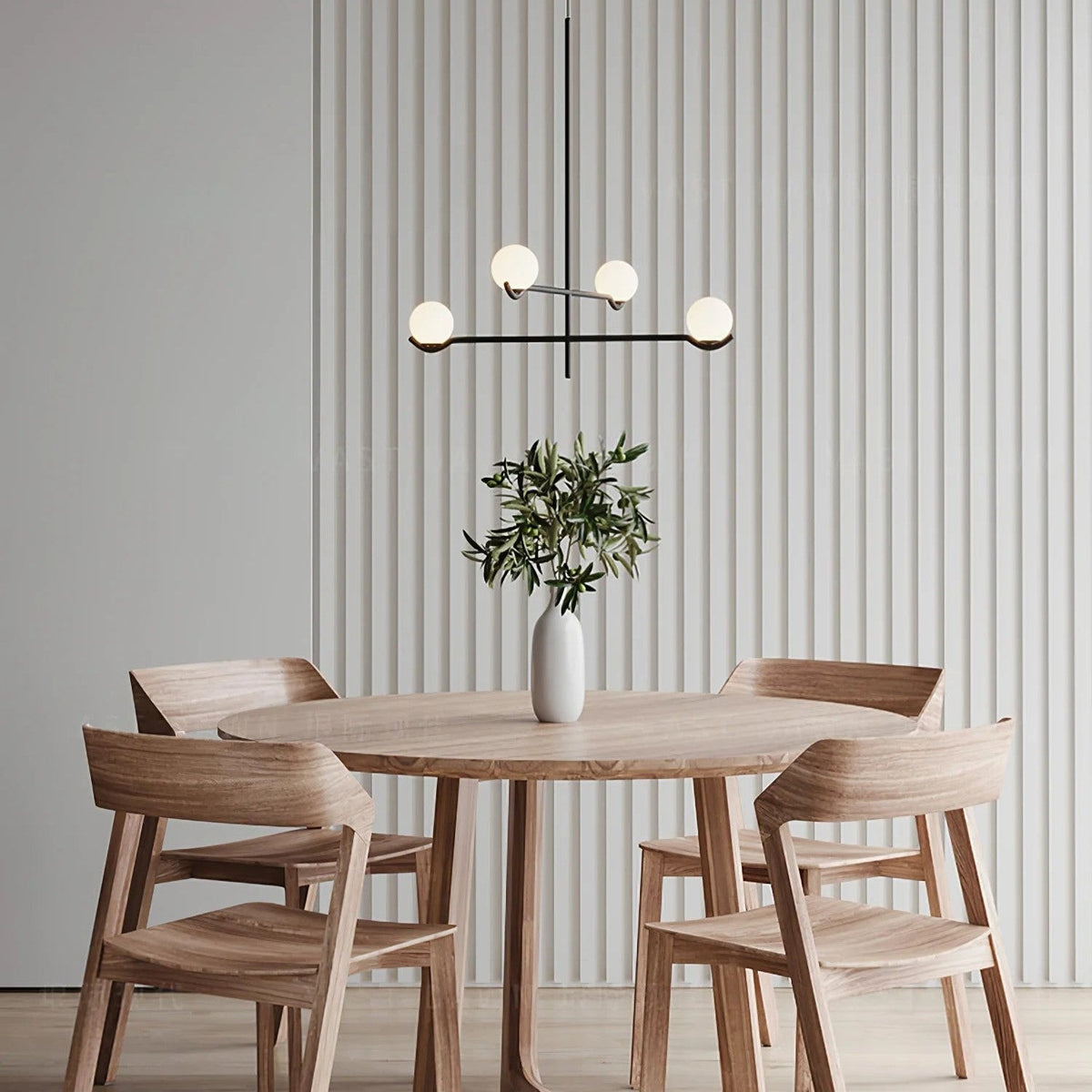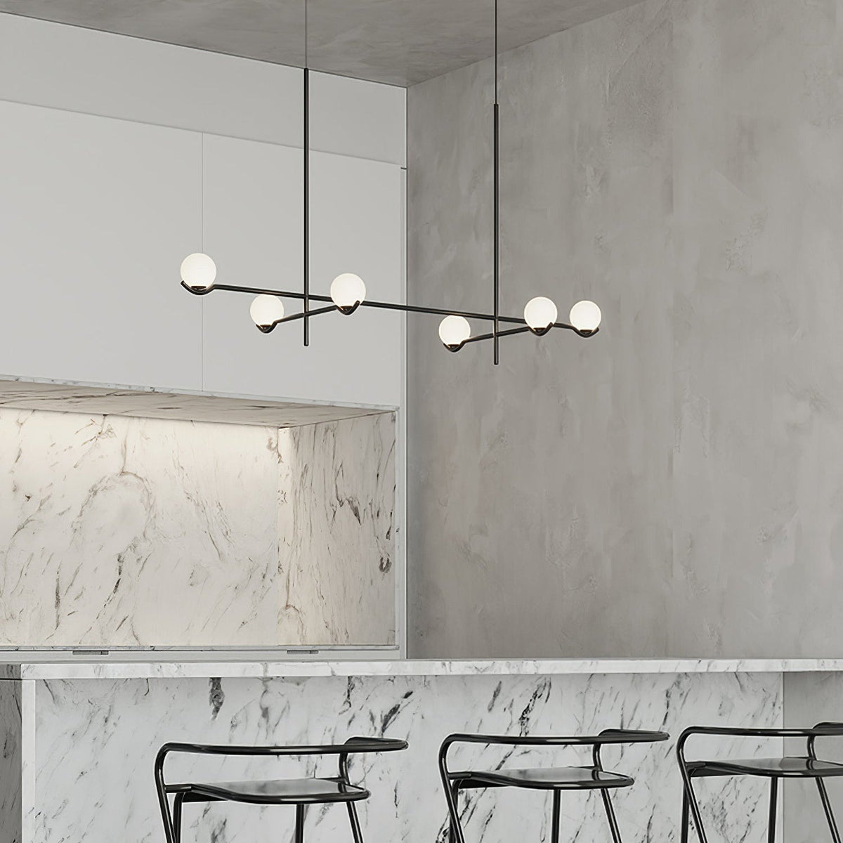 - This minimalist masterpiece, the Henslin Linear Chandelier, features clean, simple metal lines that create a sleek and modern silhouette. The body of the lamp is recessed where the white glass shade is located, harmonizing the two elements into a cohesive and visually appealing design. Ideal for contemporary spaces, this chandelier offers a sophisticated and understated lighting solution.