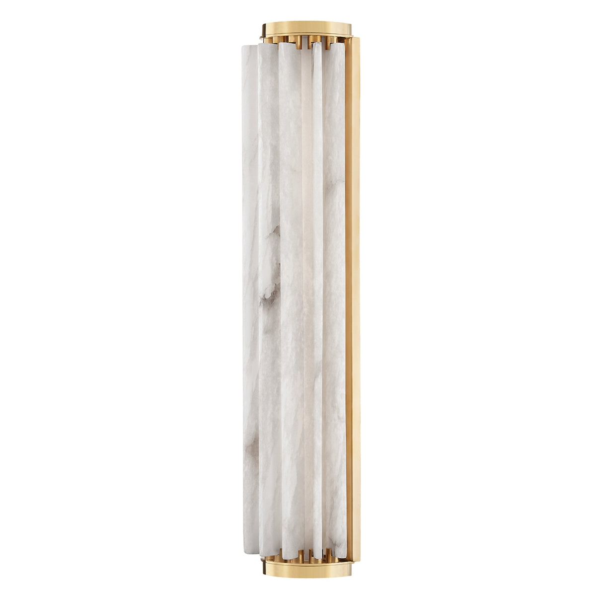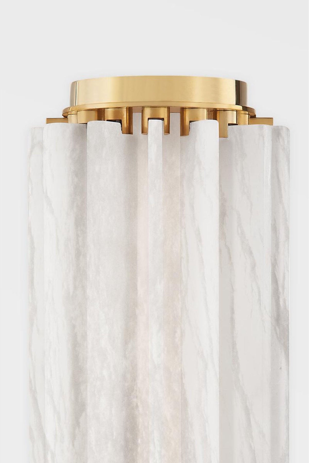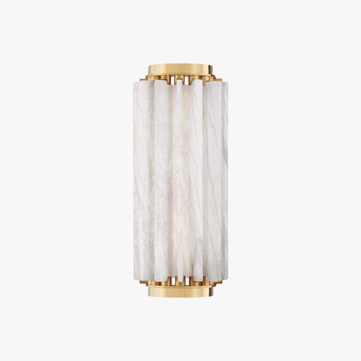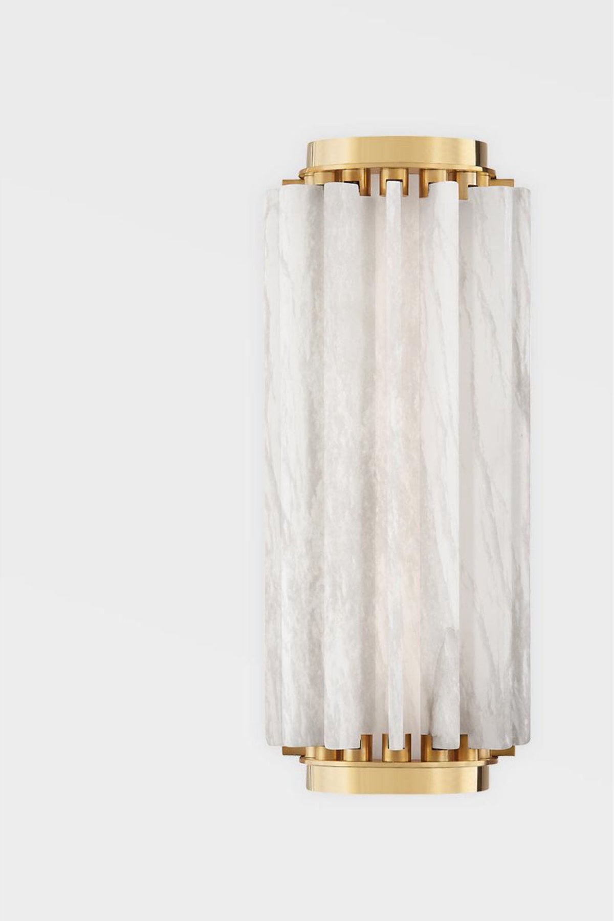 - Cradled within this metallic embrace is the true soul of the Hillside Alabaster Wall Sconce: a shade carved from genuine alabaster. Sourced for its unique veining and semi-translucent quality, each alabaster shade is a fingerprint of nature. When the sconce is unlit, it presents as a sculptural element, its milky, stone-like surface displaying a tapestry of soft, natural patterns that intrigue the eye up close. This is a piece of functional art, ensuring no two sconces are exactly alike.
