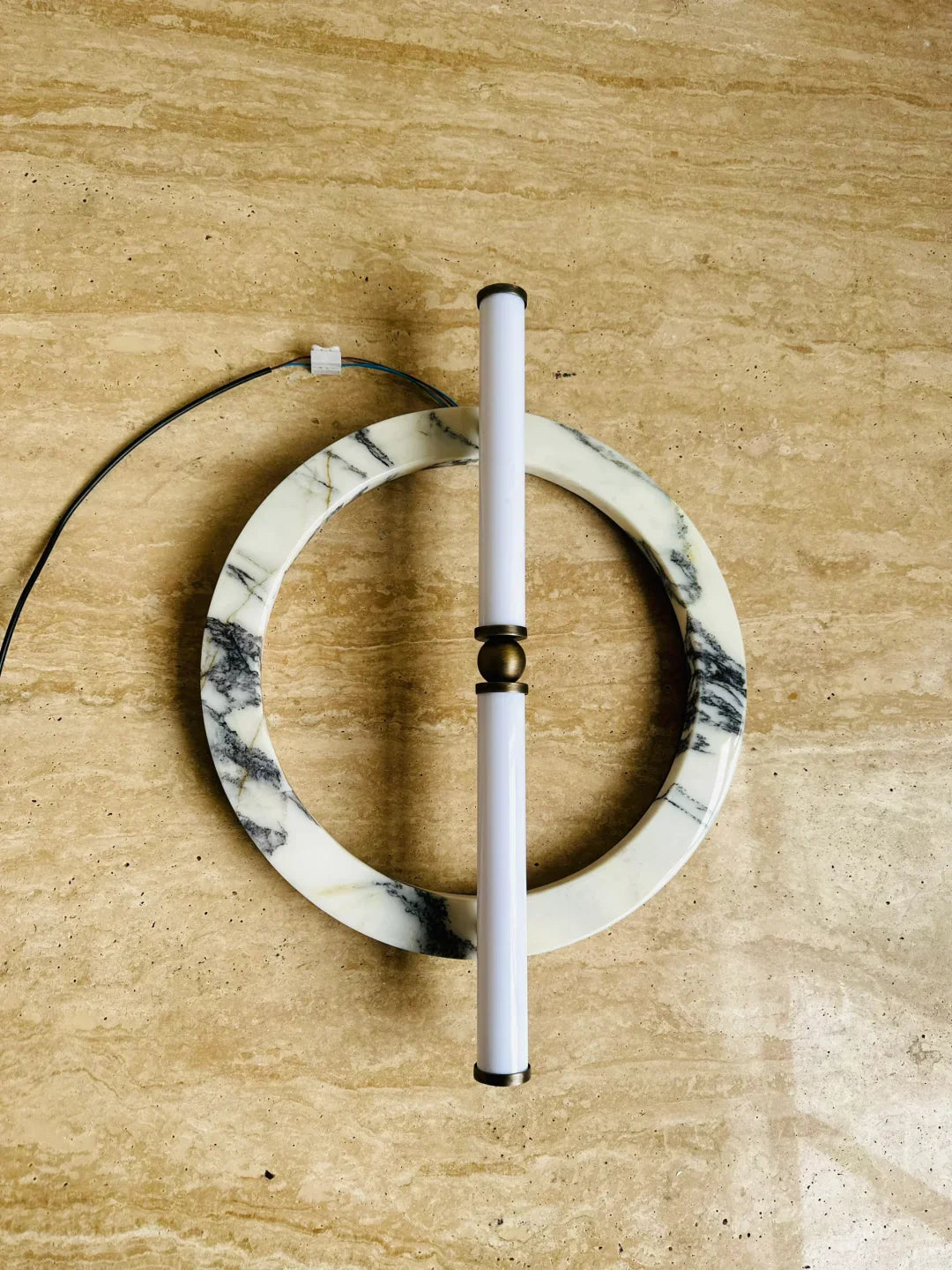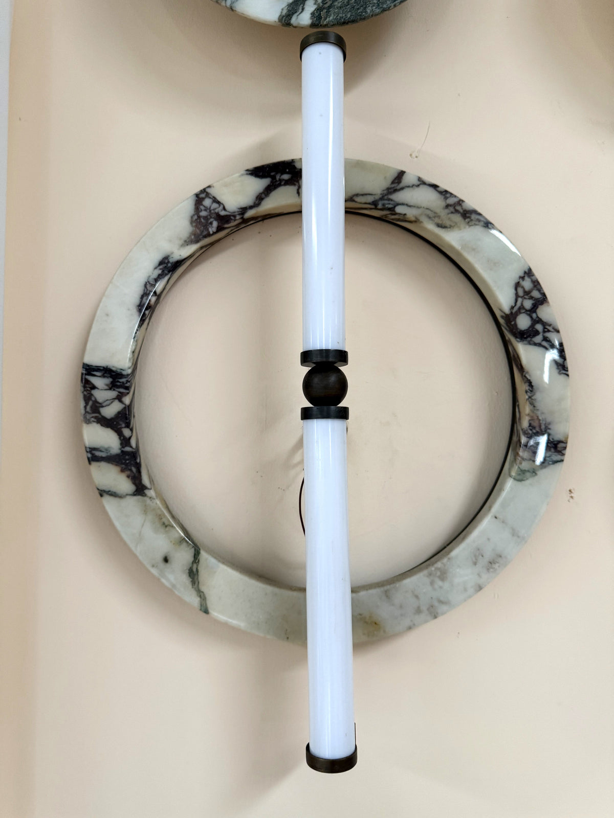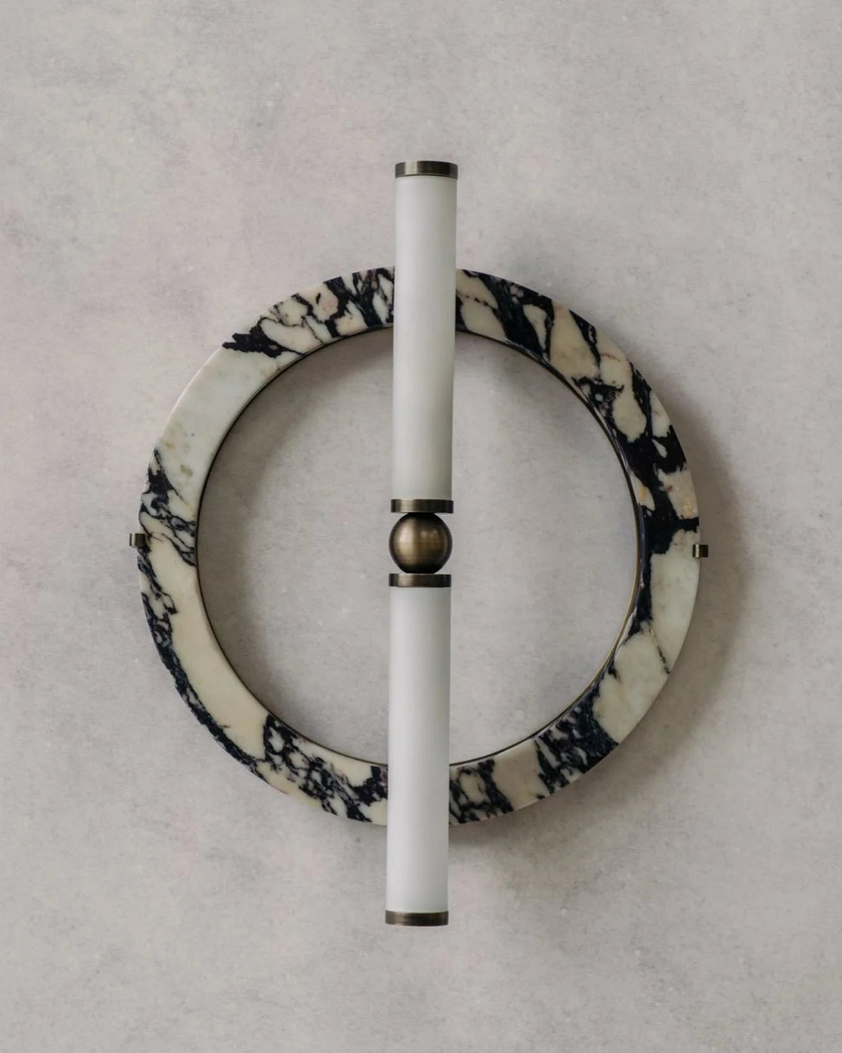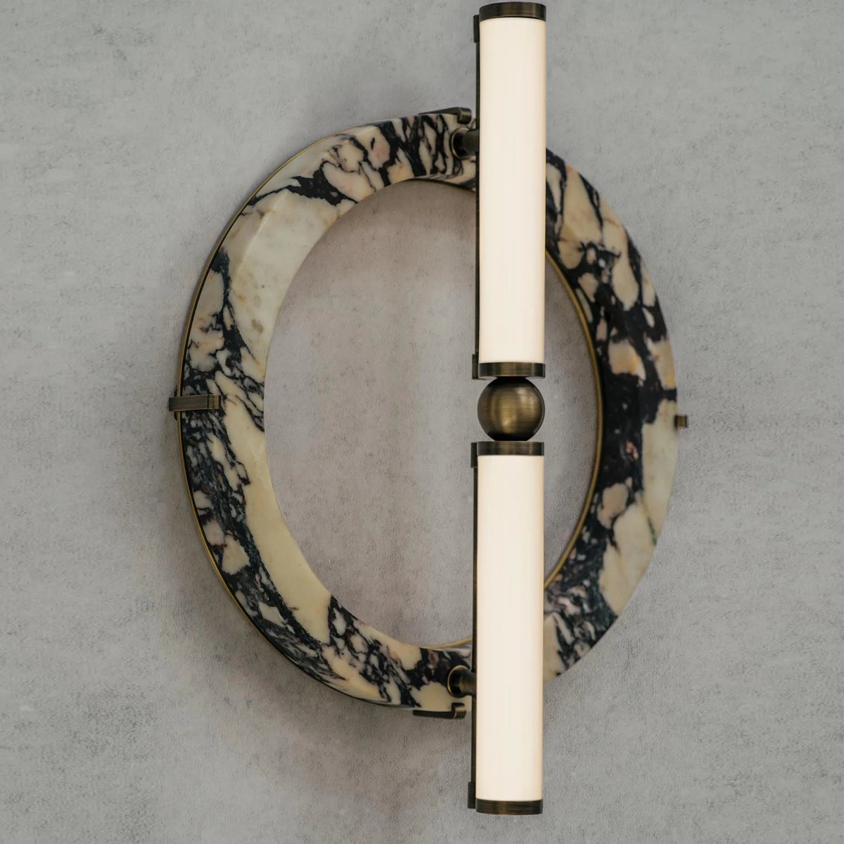 - Elevate your space with the Ice IV Wall Sconce, a striking fusion of modern design and artisanal craftsmanship. Featuring softly illuminated frosted opal glass rods resting gracefully on a hand-finished circular marble frame, this sconce exudes understated luxury. Delicate antique brass detailing adds a touch of timeless sophistication, creating a warm, refined glow