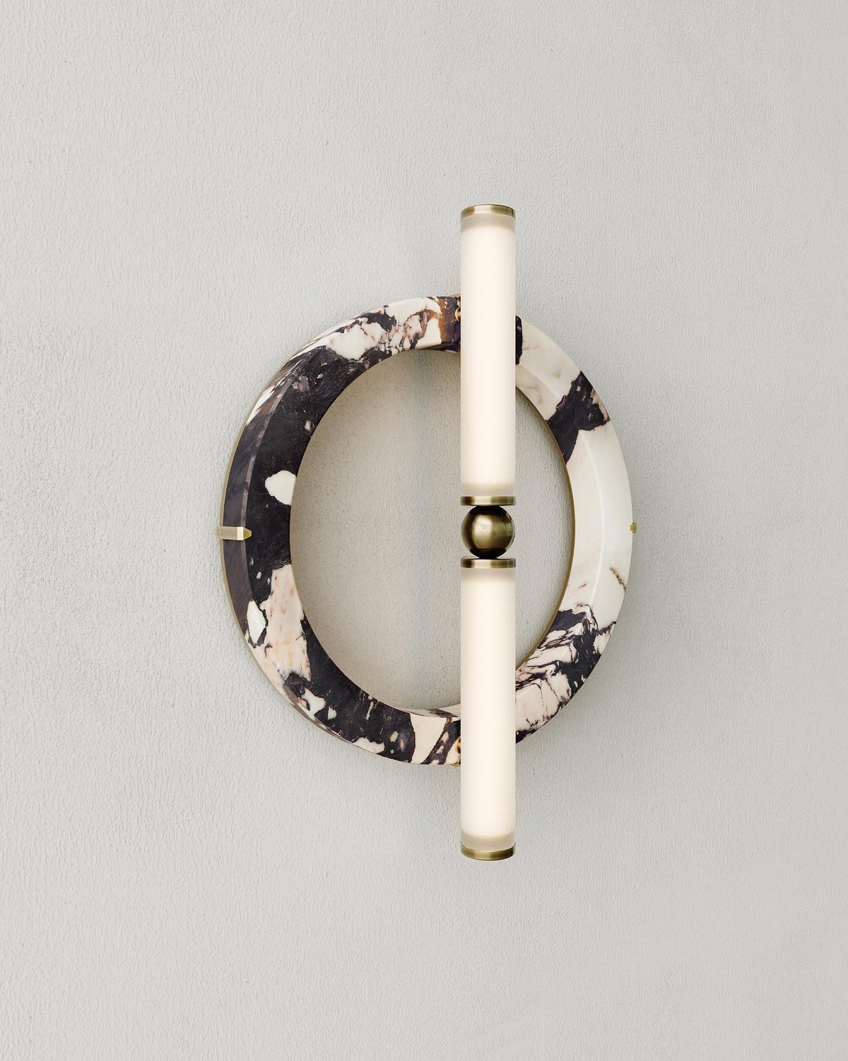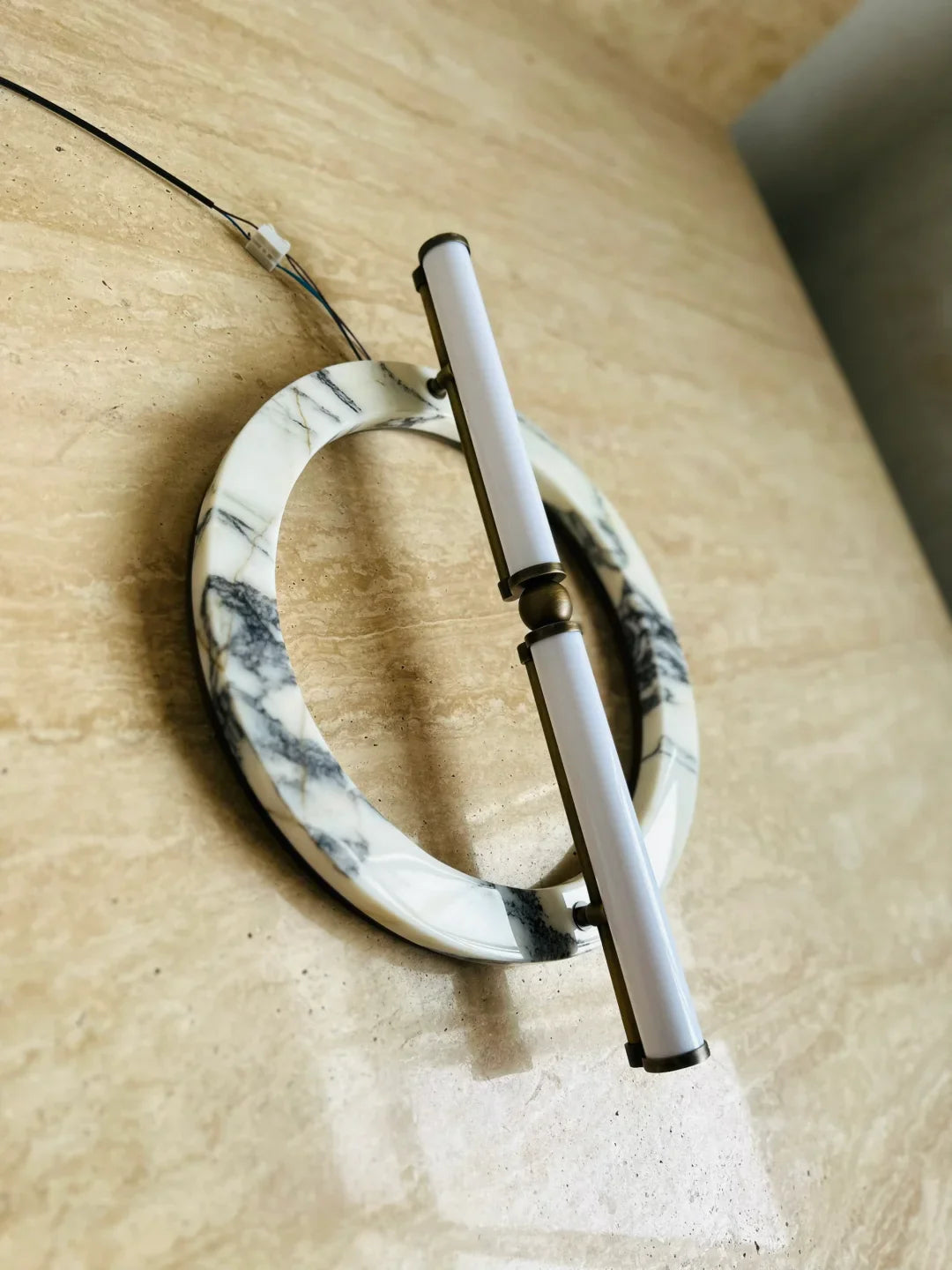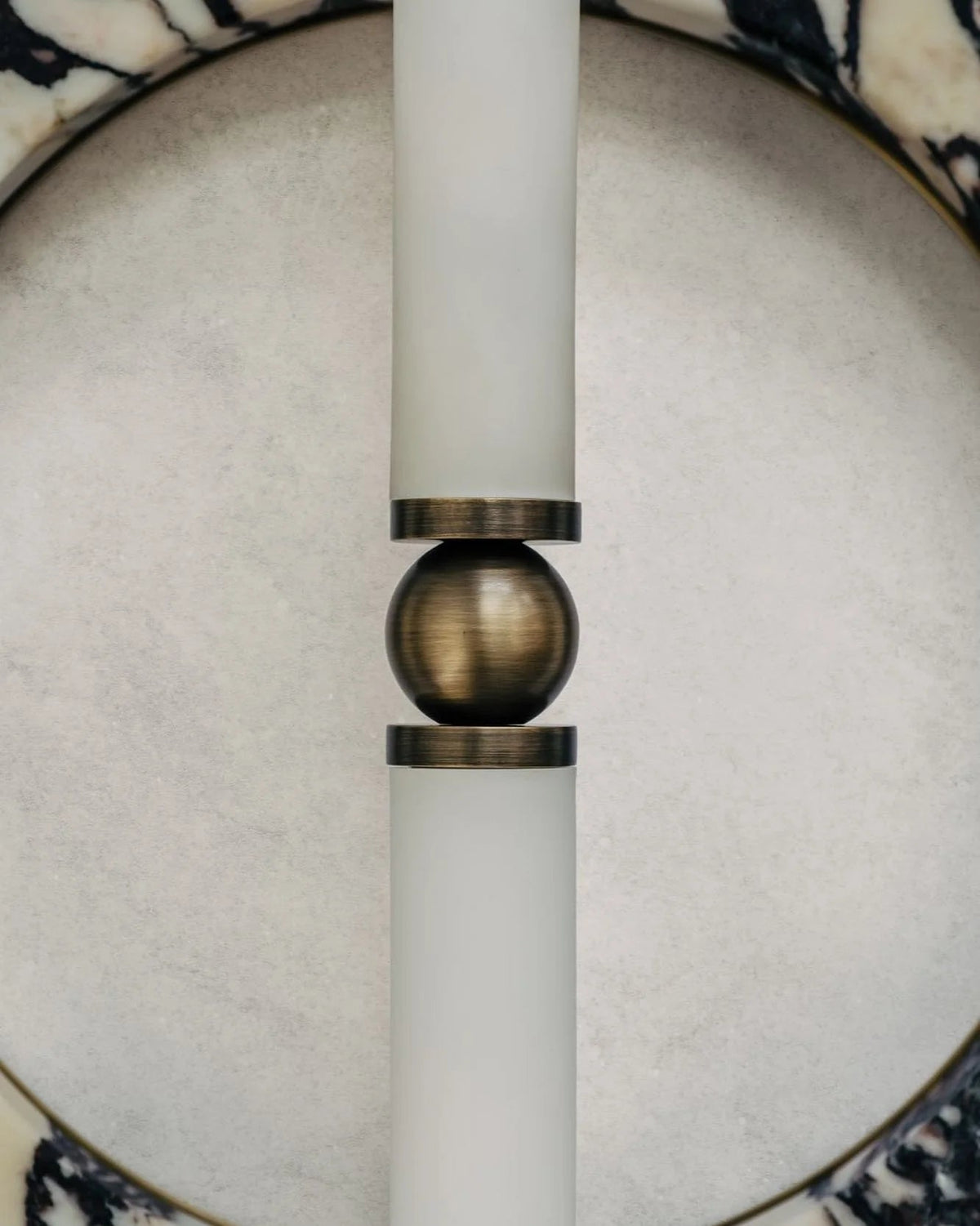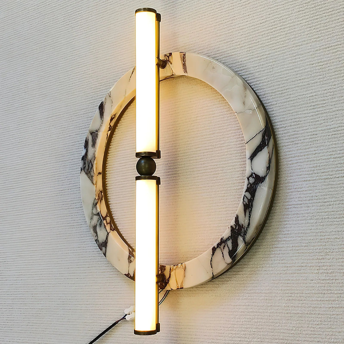 - Elevate your space with the Ice IV Wall Sconce, a striking fusion of modern design and artisanal craftsmanship. Featuring softly illuminated frosted opal glass rods resting gracefully on a hand-finished circular marble frame, this sconce exudes understated luxury. Delicate antique brass detailing adds a touch of timeless sophistication, creating a warm, refined glow