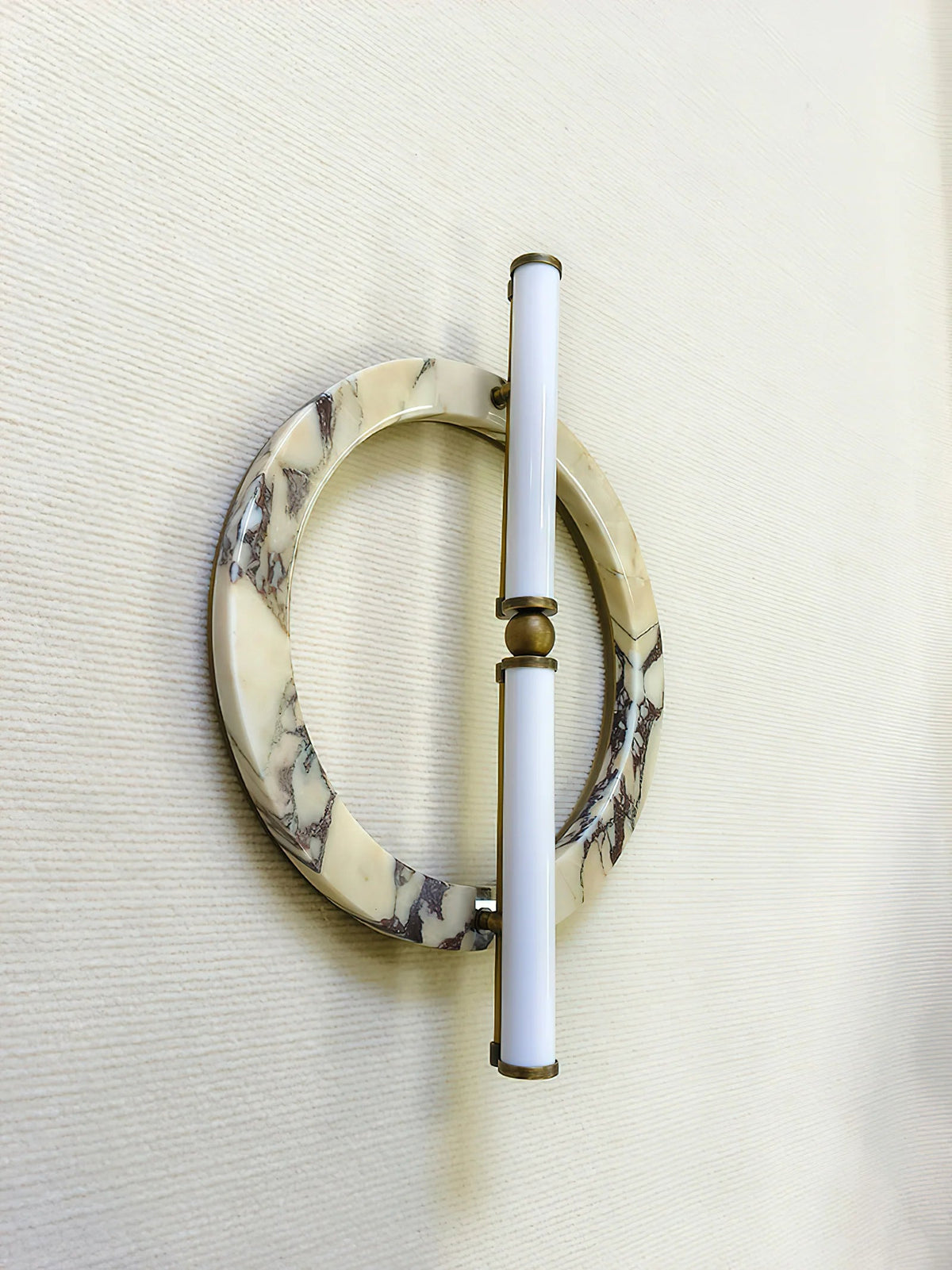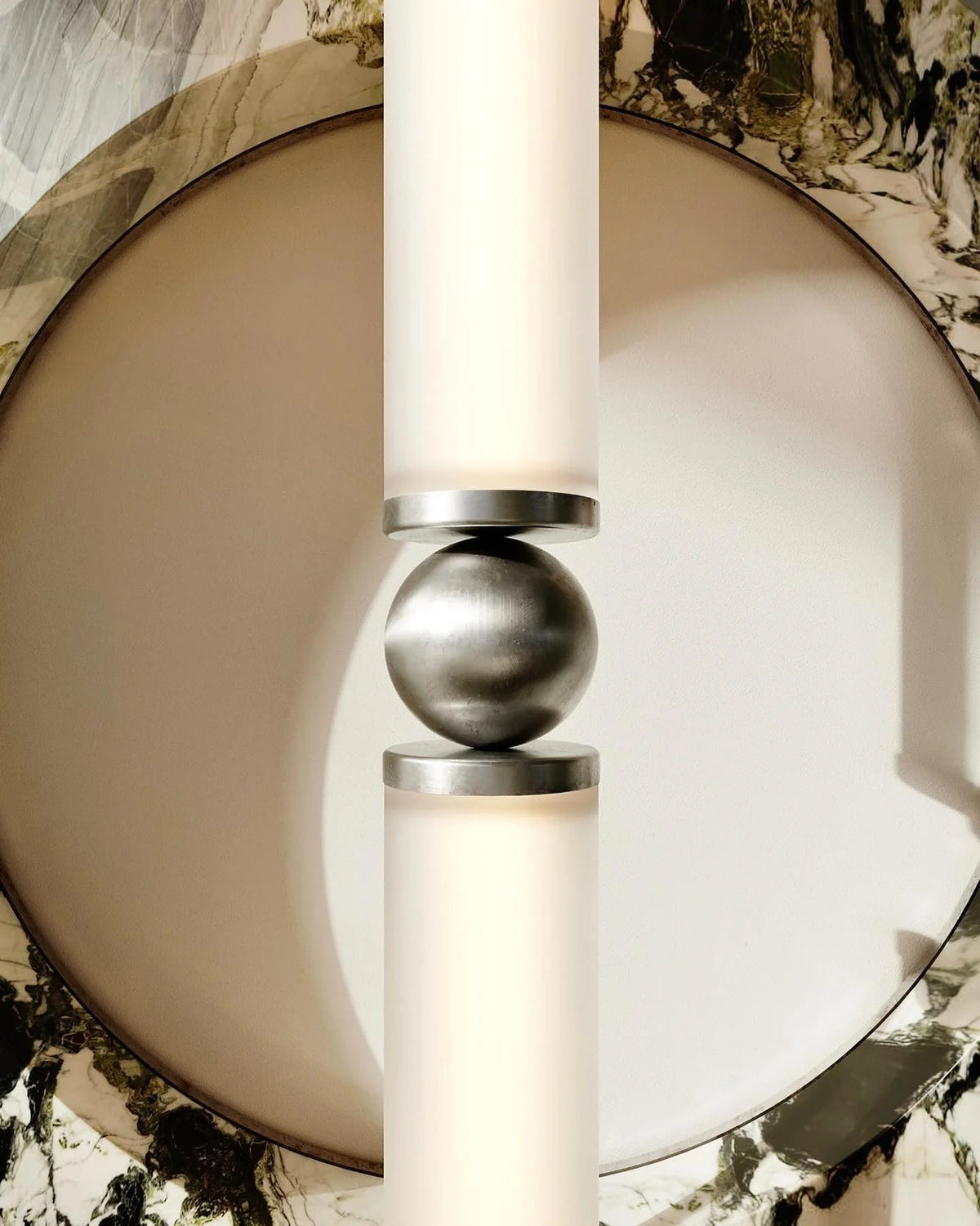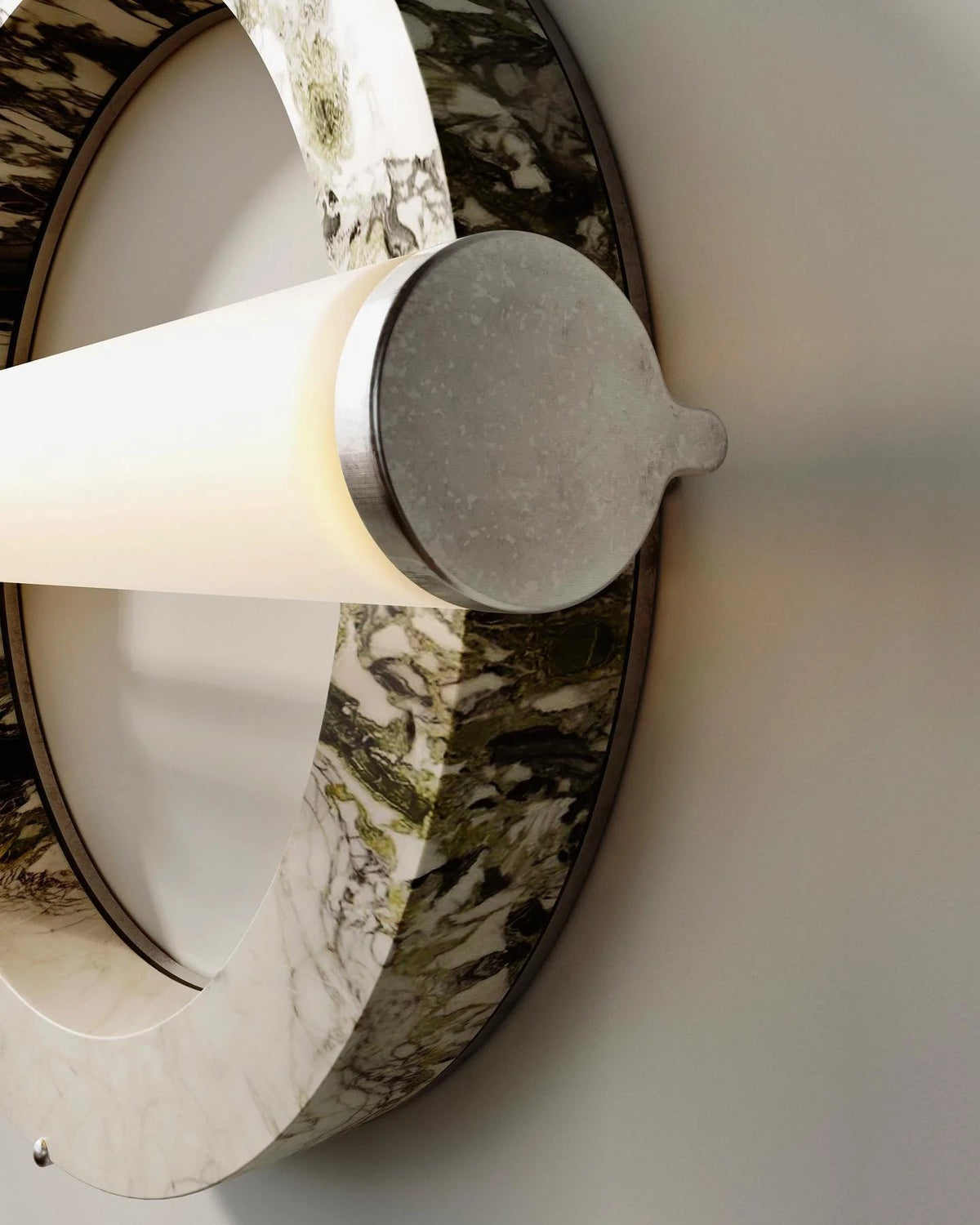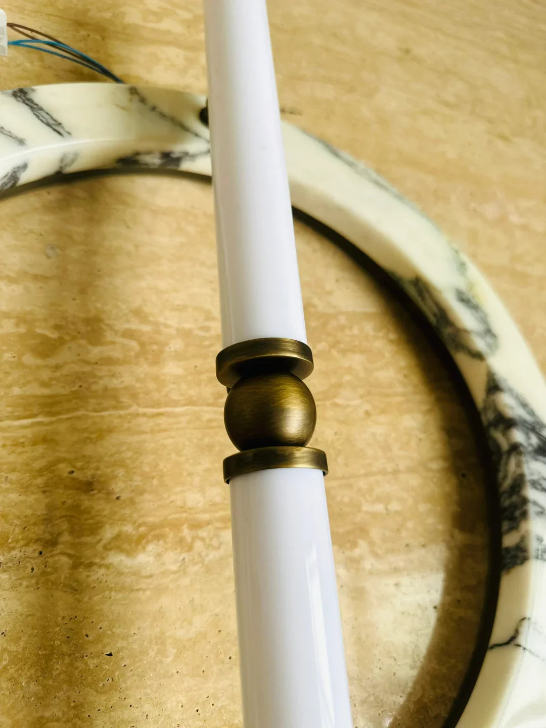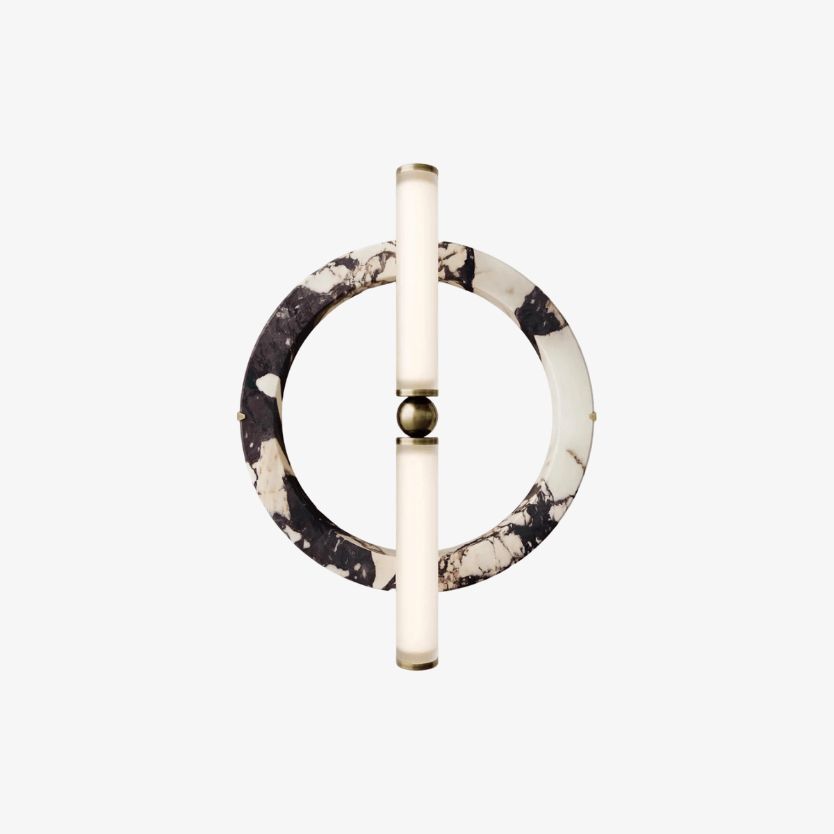 - Elevate your space with the Ice IV Wall Sconce, a striking fusion of modern design and artisanal craftsmanship. Featuring softly illuminated frosted opal glass rods resting gracefully on a hand-finished circular marble frame, this sconce exudes understated luxury. Delicate antique brass detailing adds a touch of timeless sophistication, creating a warm, refined glow