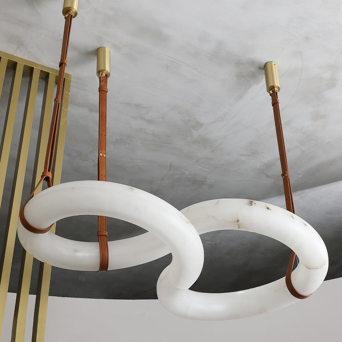 - Suspended by three slender, leather ropes, Infinity 8H Pendant Light evokes a sense of effortless grace. This unique suspension method adds a touch of unexpected lightness to the substantial form of the chandelier, making it a truly magnetic presence in any space.