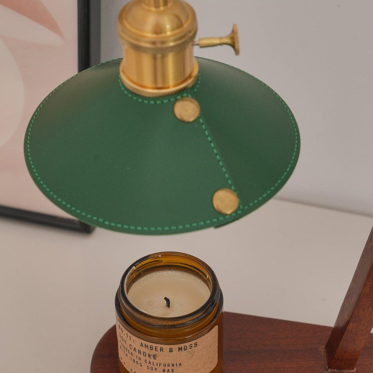 - The Kopc Table Lamp is further distinguished by its beautifully crafted brass connection fittings, which not only enhance its classic appeal but also ensure durability and stability. Topped with a lush emerald fabric lampshade, this lamp offers a perfect contrast to the natural wood, infusing warmth and sophistication into any room.