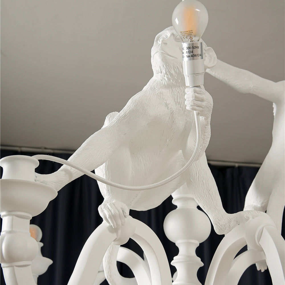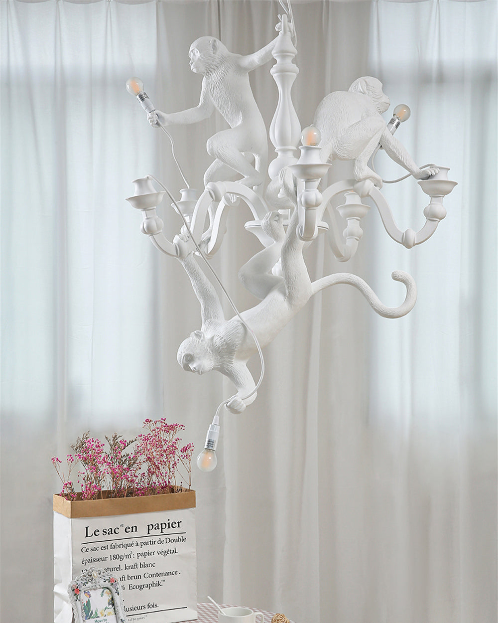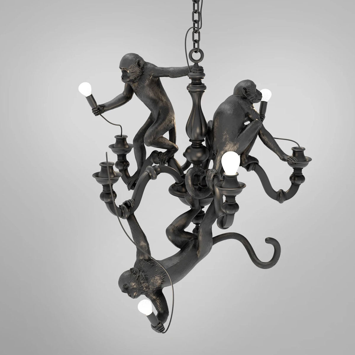 - Three realistic and cute little monkeys holding light bulbs on the Langlo Monkey Chandelier! Looks like they are pulling the bulb out of the base to play with it. Time to add some fun to your home!