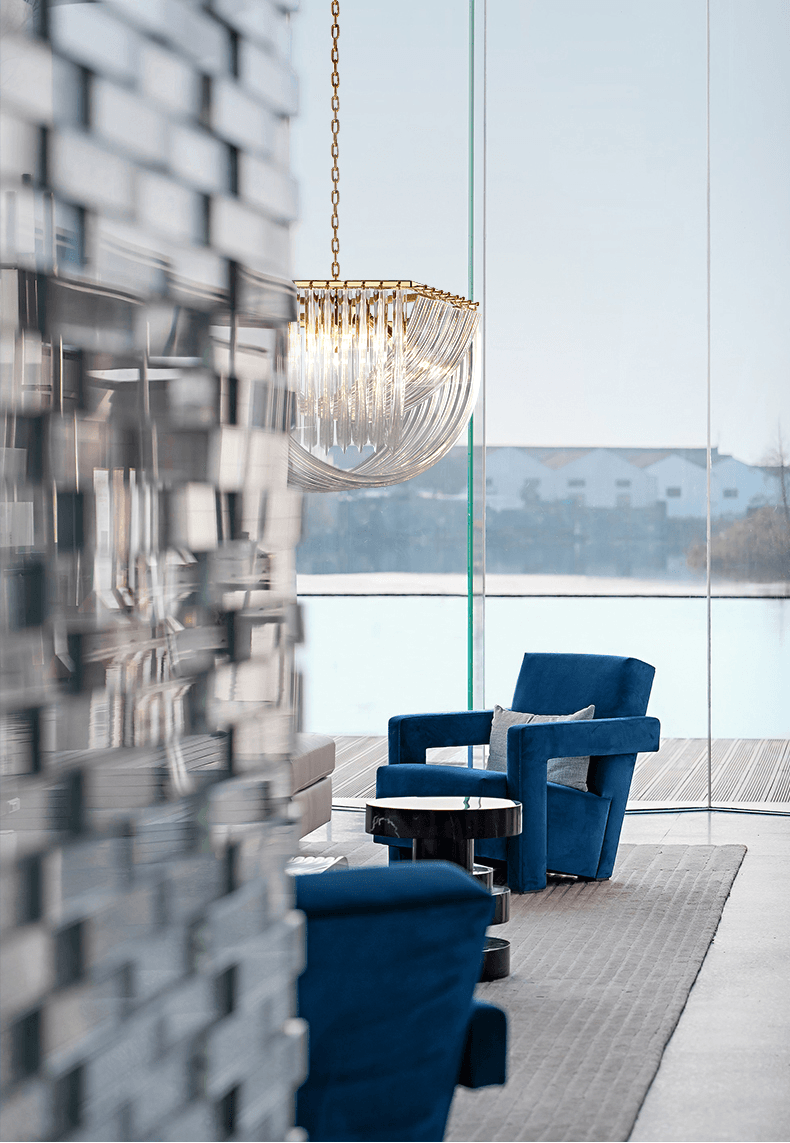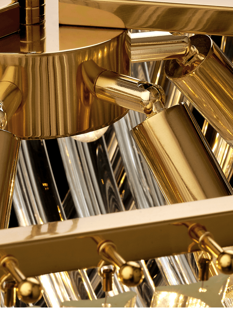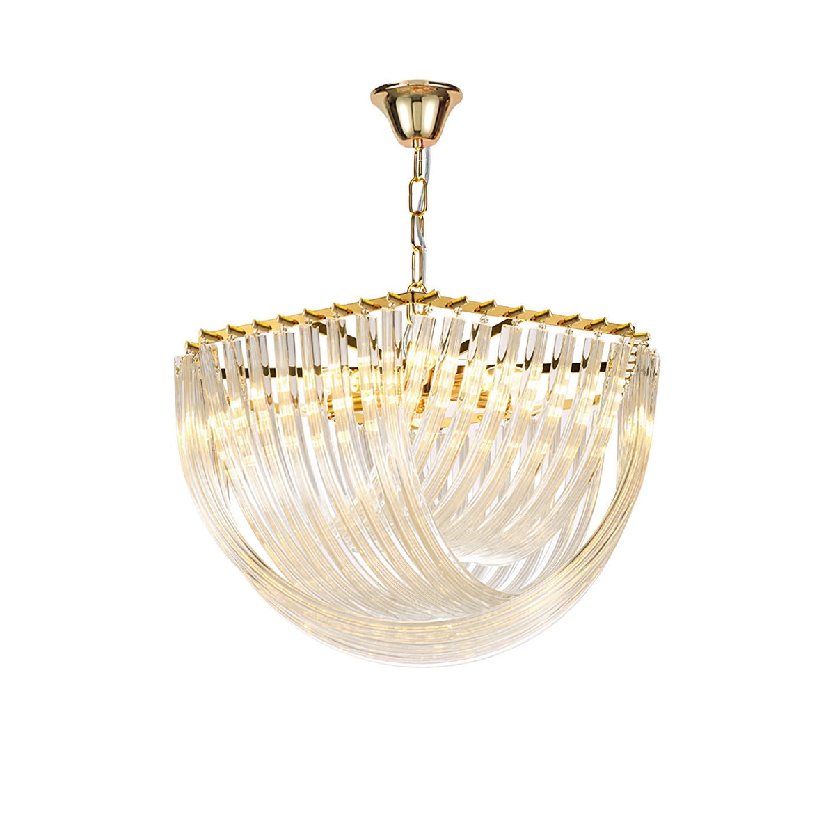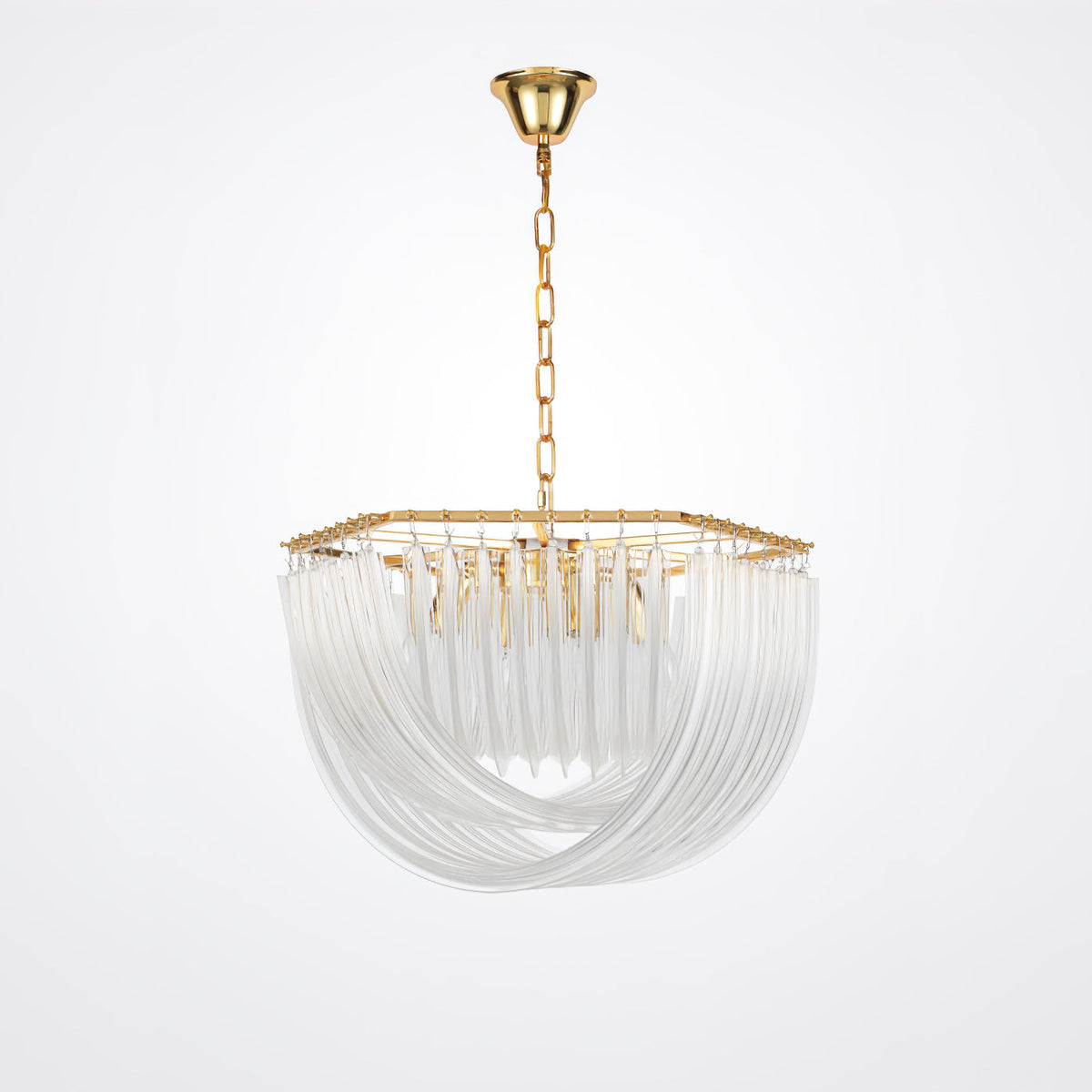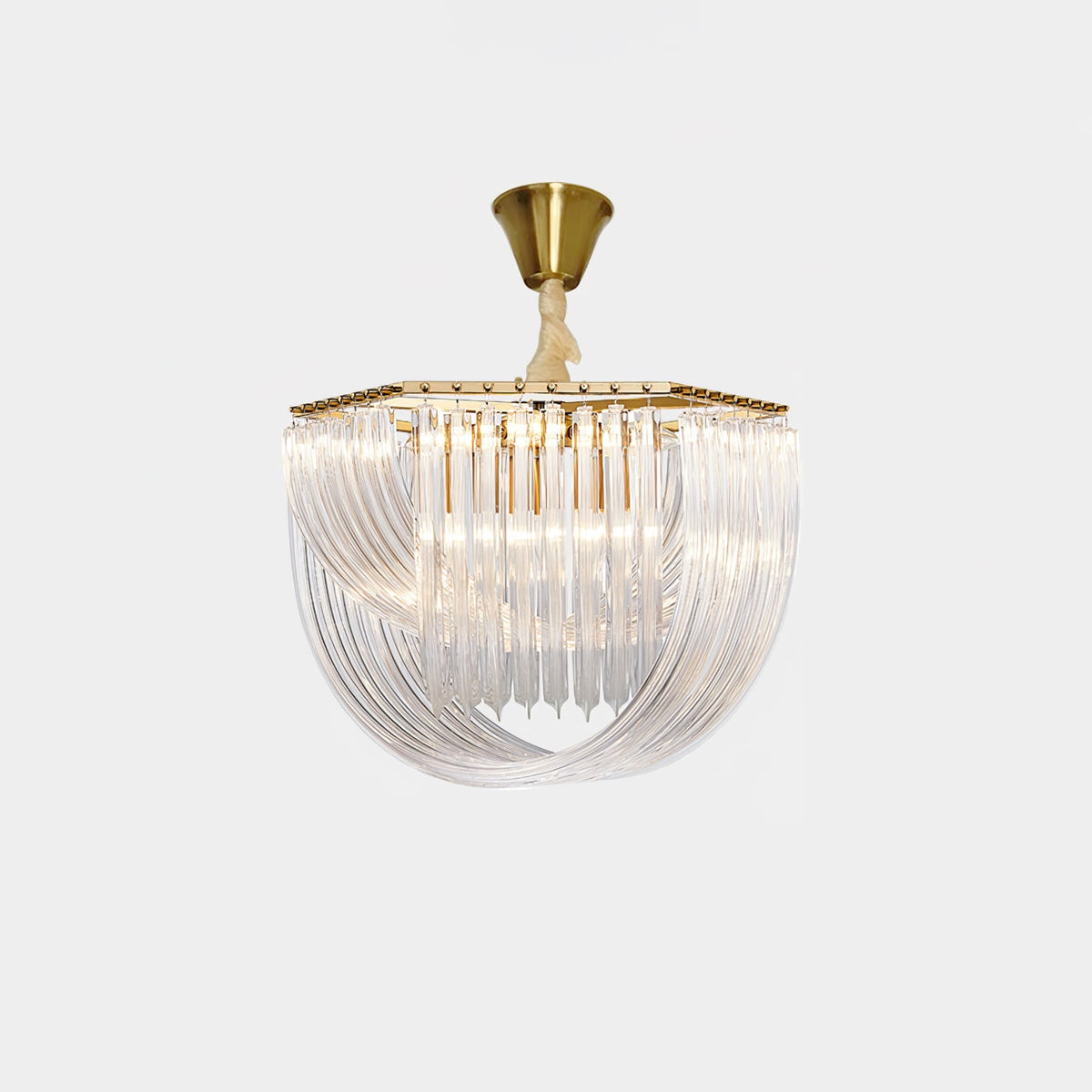 - Three layers of crisscrossed, curved strips of glass make up Lates Chandelier. The hanging chain is adjustable in length to accommodate you in arranging the fixture according to the height of your space.