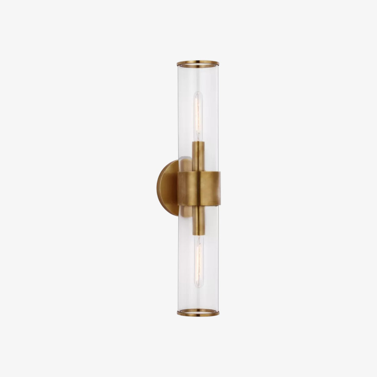 - Elevate your space with the Liaison Medium Sconce, a lighting piece that masterfully bridges the gap between classic elegance and contemporary flair. Designed for those who appreciate the finer details, this sconce features a striking juxtaposition of robust brass and artfully glass, creating a captivating play of light and shadow. Perfect for adding a touch of sophisticated drama to any room.