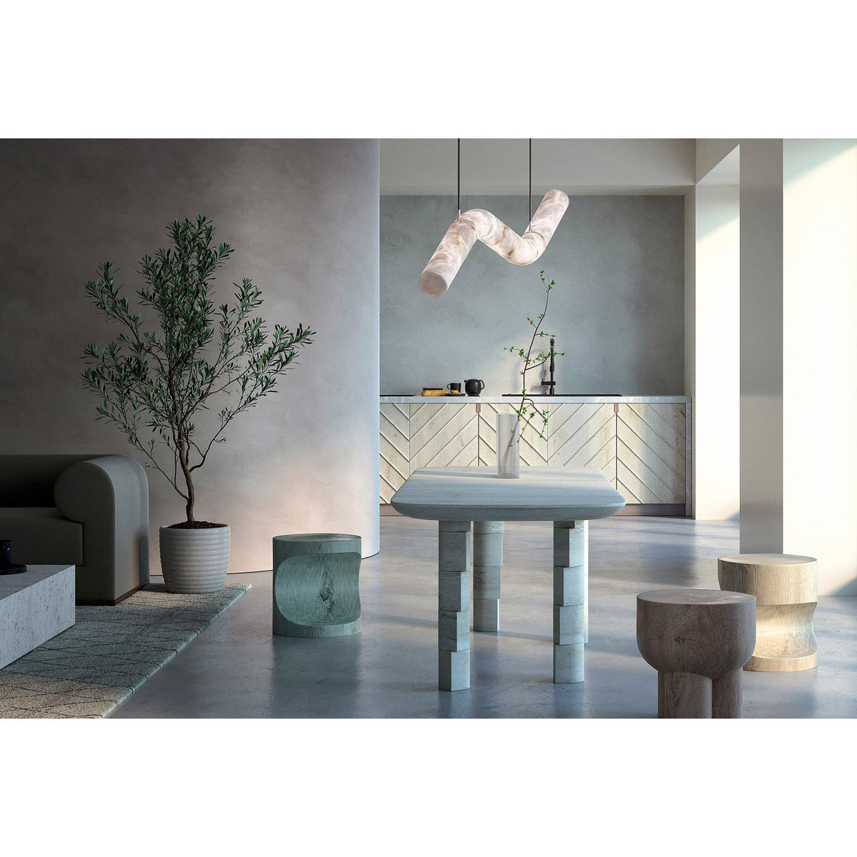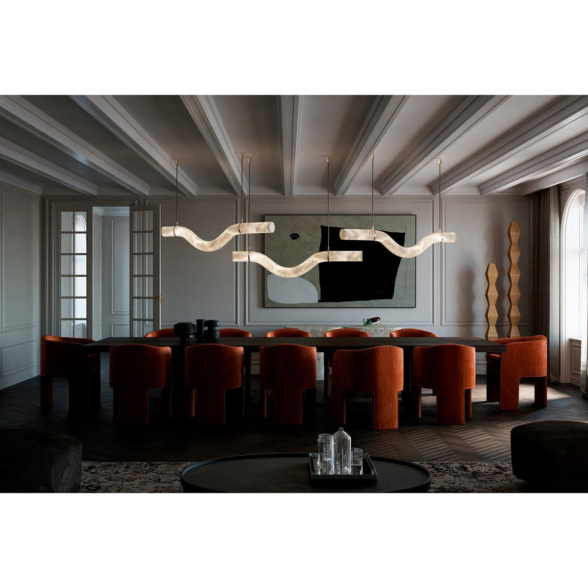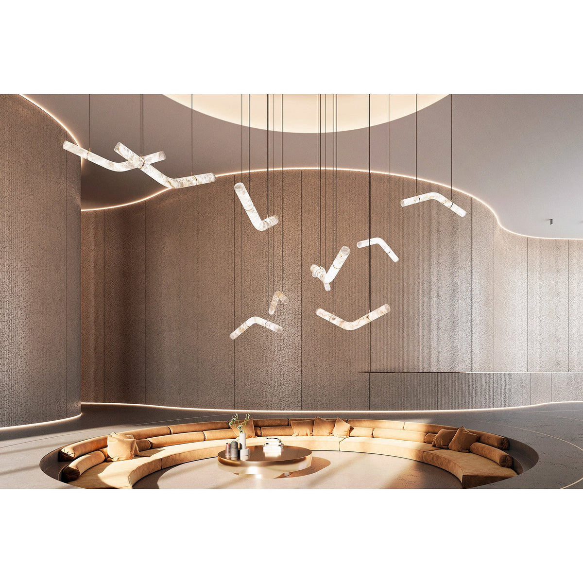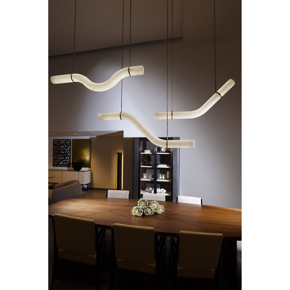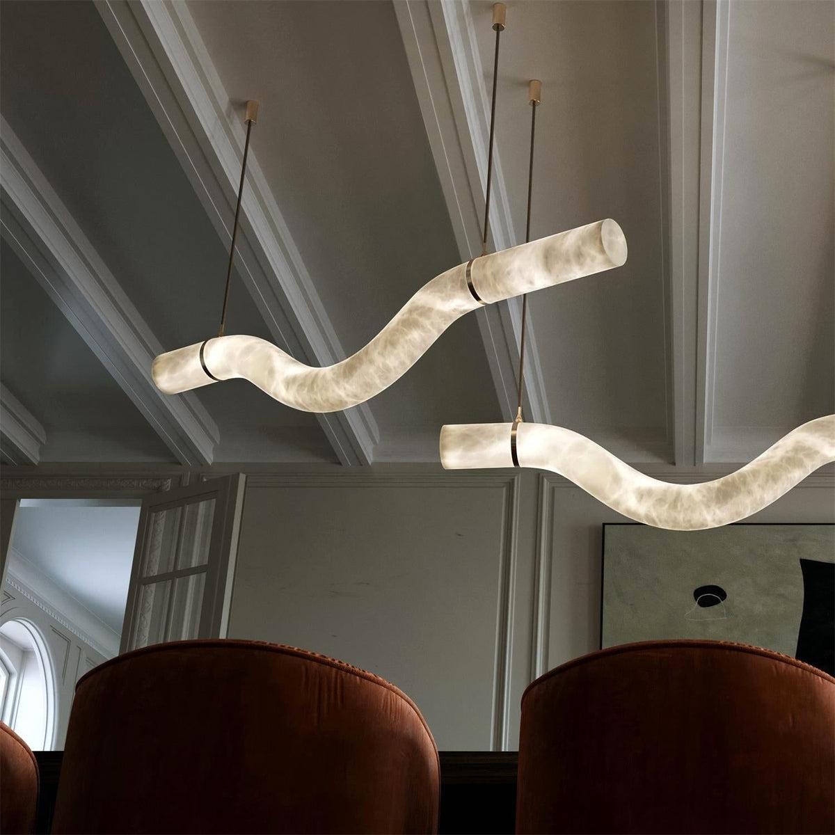 - Crafted from elegant alabaster tubes, these pendants cast a warm, inviting glow, illuminating your space with a soft, diffused light. Their powerful yet simple geometrical contours invite you to assemble, compose, and combine them to create stunning light sculptures that reflect your unique style.